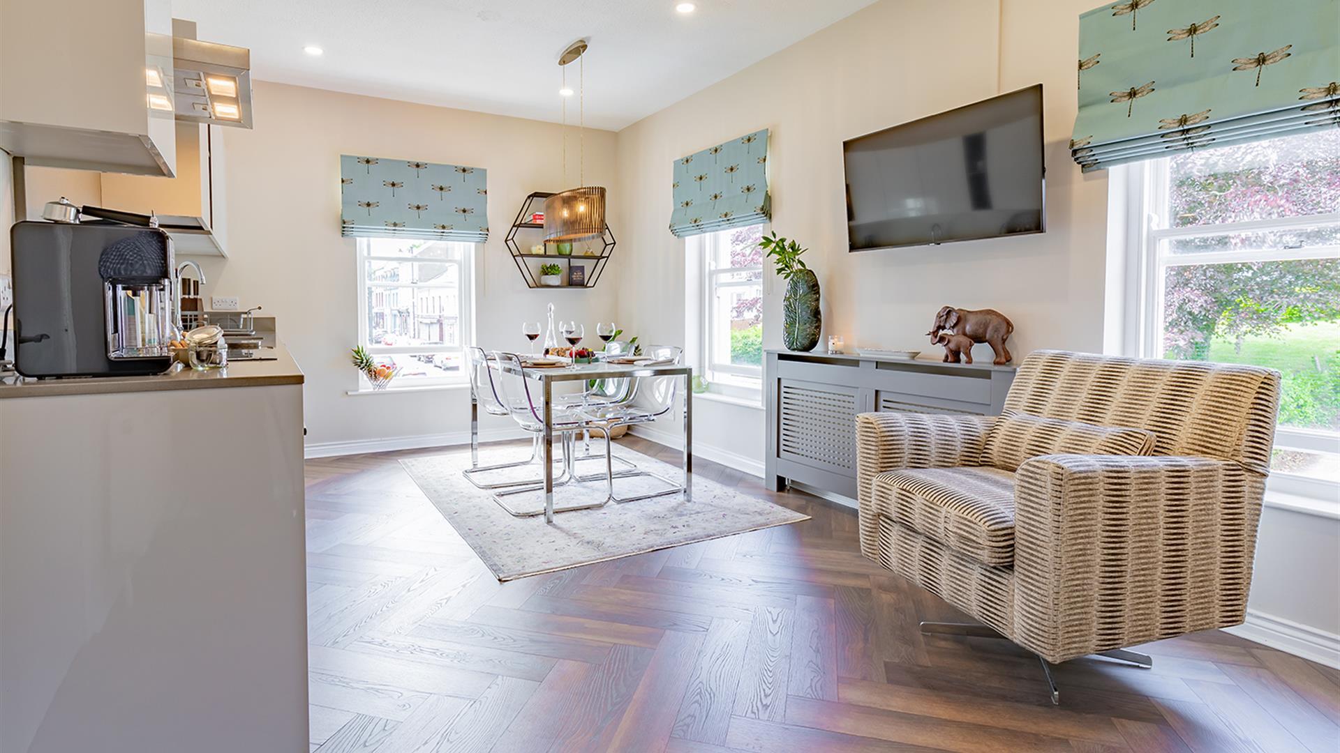 The large, bright and airy living space includes well appointed top of the range kitchen with quartz worktop. The living and dining areas both comfortably seat 4 people. Flat screen Samsung 43" TV and hyperfast broadband, ensure plenty of viewing options. Herringbone flooring and original sash windows with Roman blinds in Harlequin fabrics.