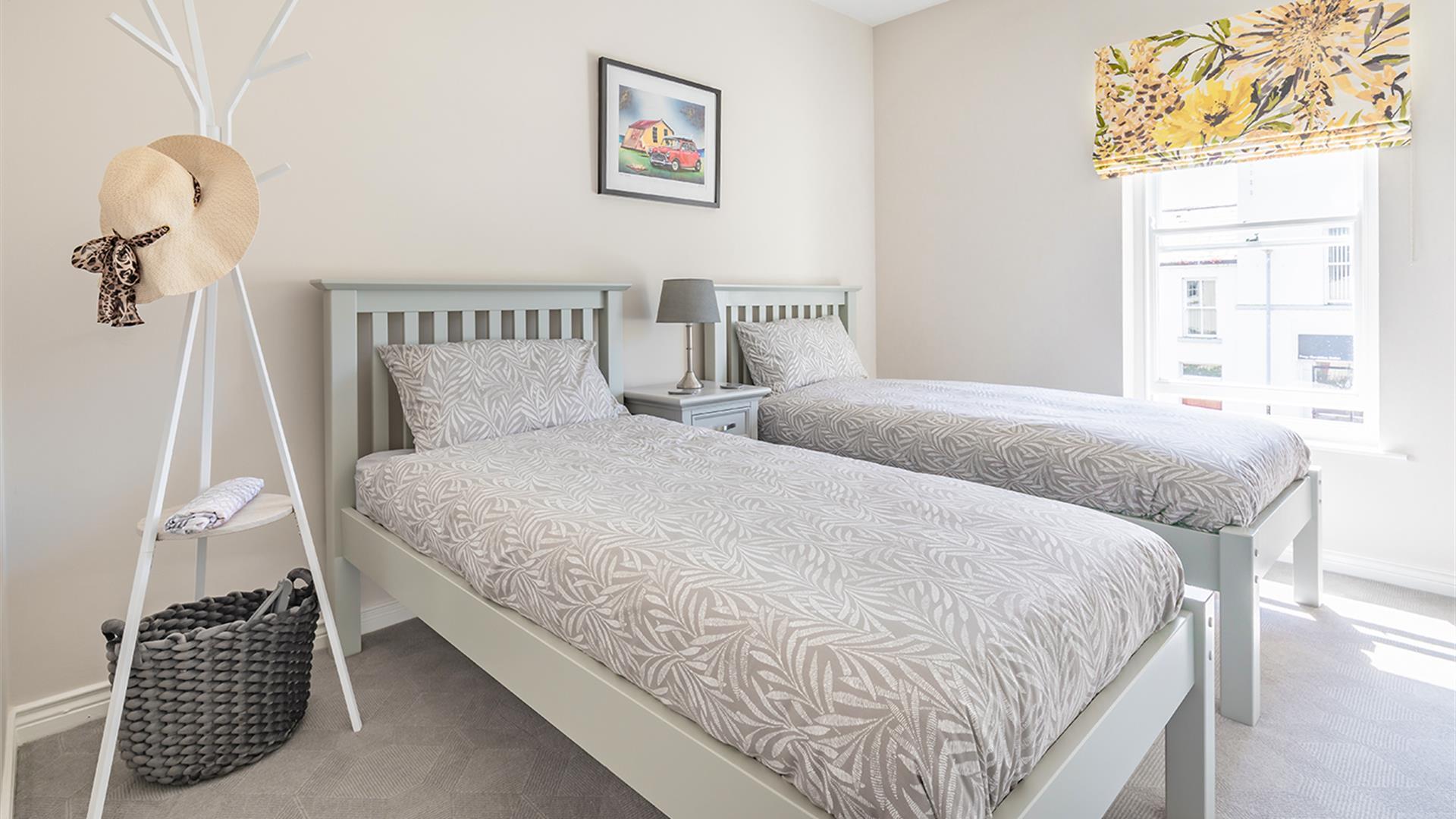 Spacious Master Bedroom with king size bed and Bedeck bedding. Second bedroom with twin beds. Both bedrooms have Brinton's carpets and Harlequin Roman blinds with blackout linings.