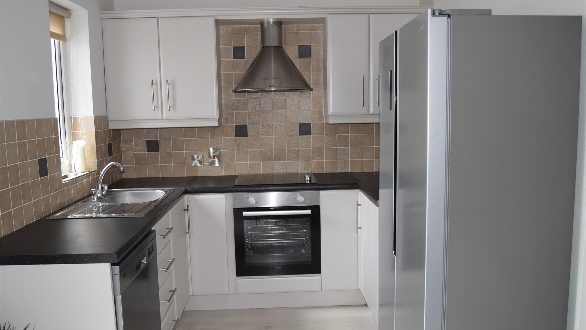 Kitchen is equipped with American fridge freezer, dishwasher, fast boil kettle, toaster, electric oven/grill/hob and all kitchen utensils. Enjoy freshly ground coffee each morning with barr coffee grinder.