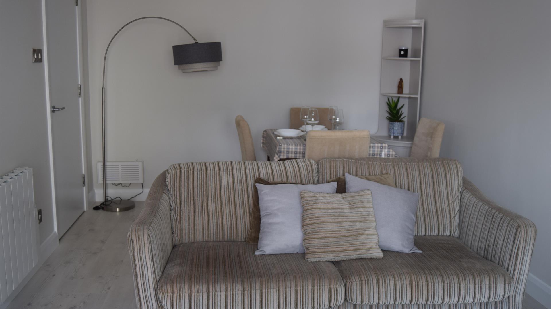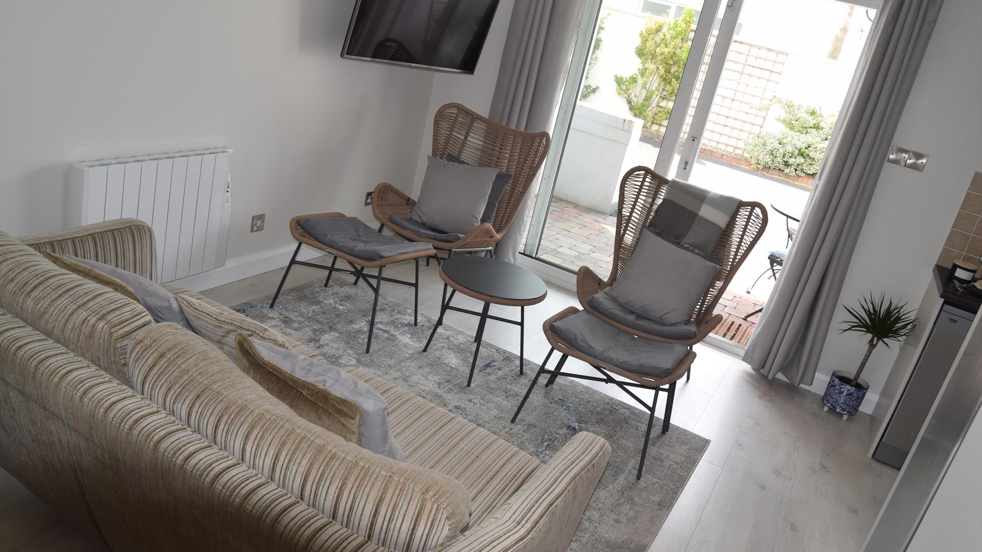 Comfortable living space with wall mounted 43" Smart TV (freeview, Prime and Sports).
