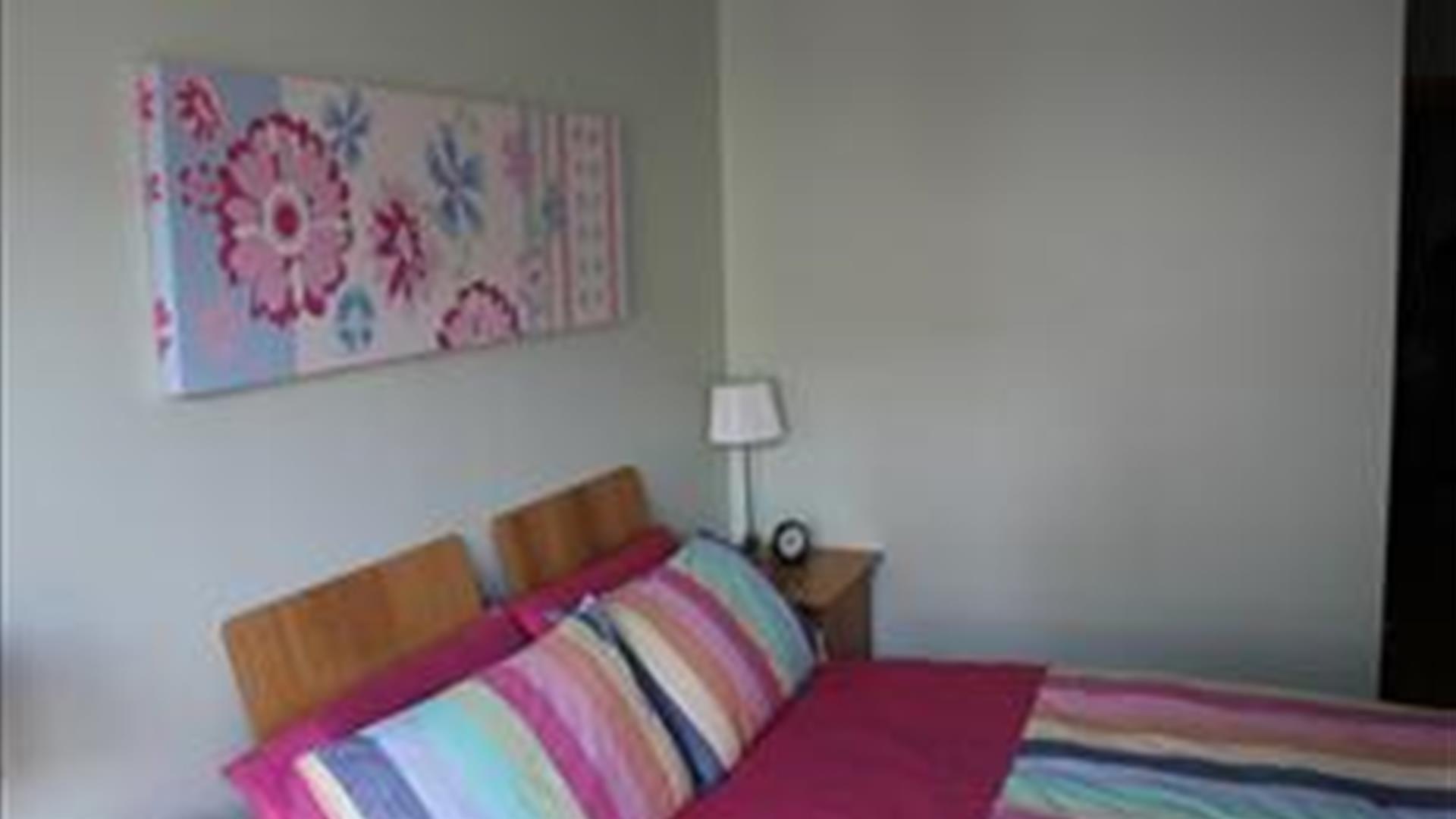 The apartment has two good bedrooms- one double room with en suite and one twin room with the main bathroom next to it. Private car parking space provided.