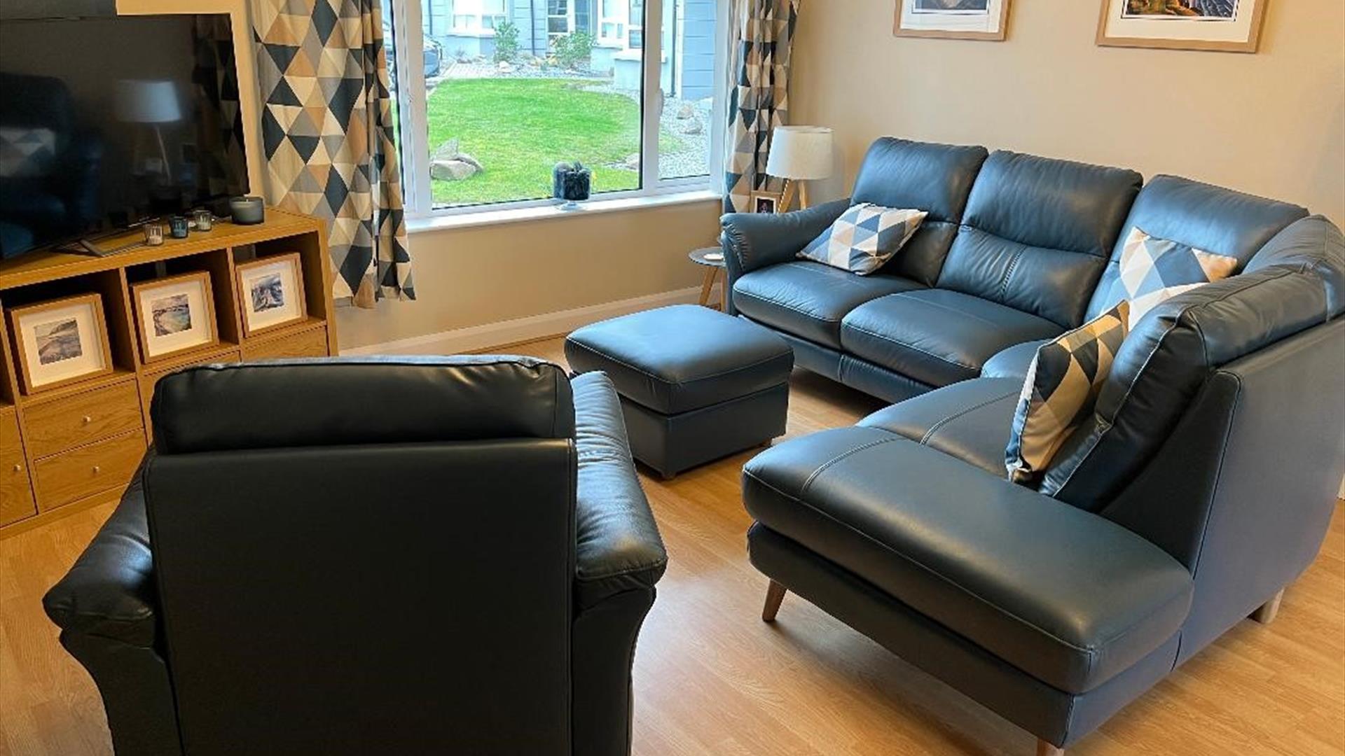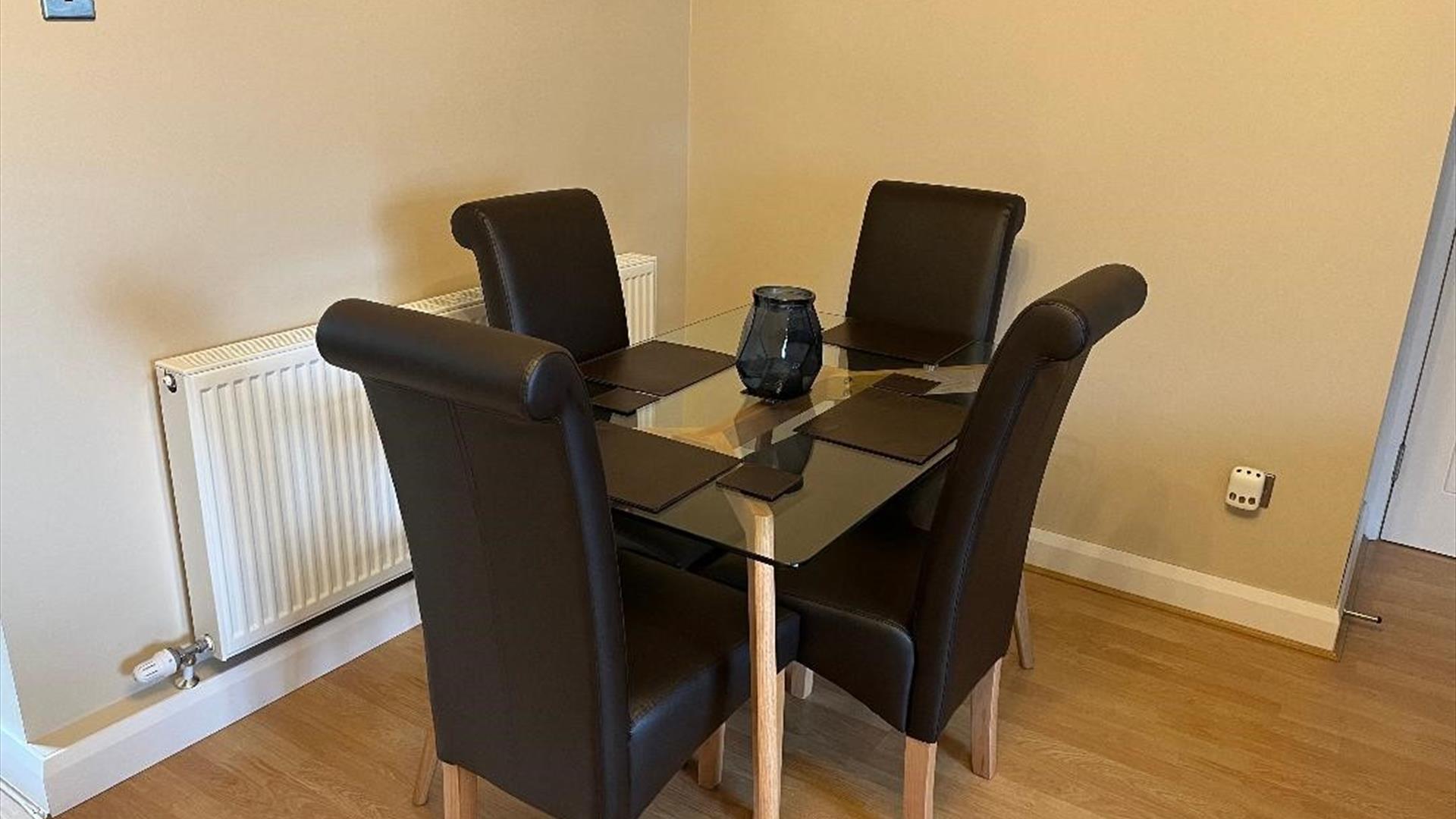 The dining area has a table and 4 chairs while the living area has a large corner sofa, chair and television.