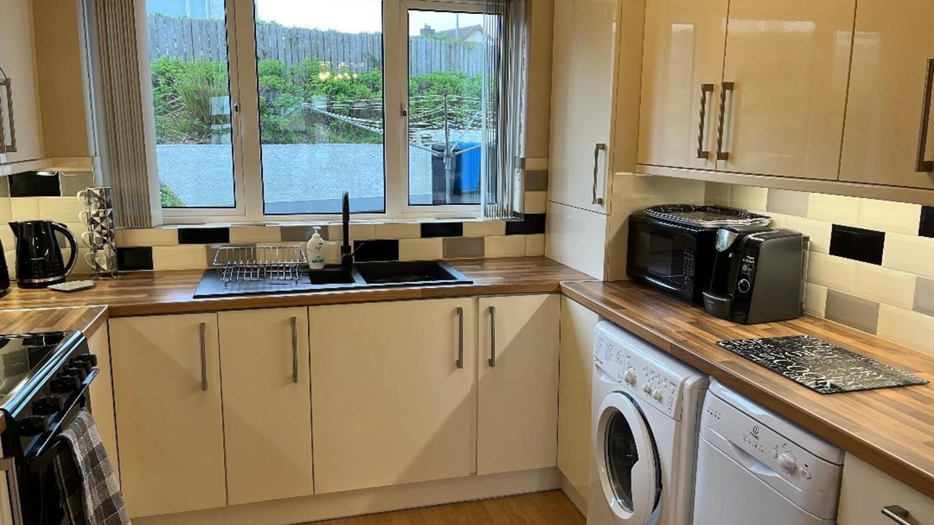 The large open plan kitchen, diner and living area is well equiped with large fridge freezer, cooker, microwave and washing machine plus a good selection of cutlery, crockery and utensils.