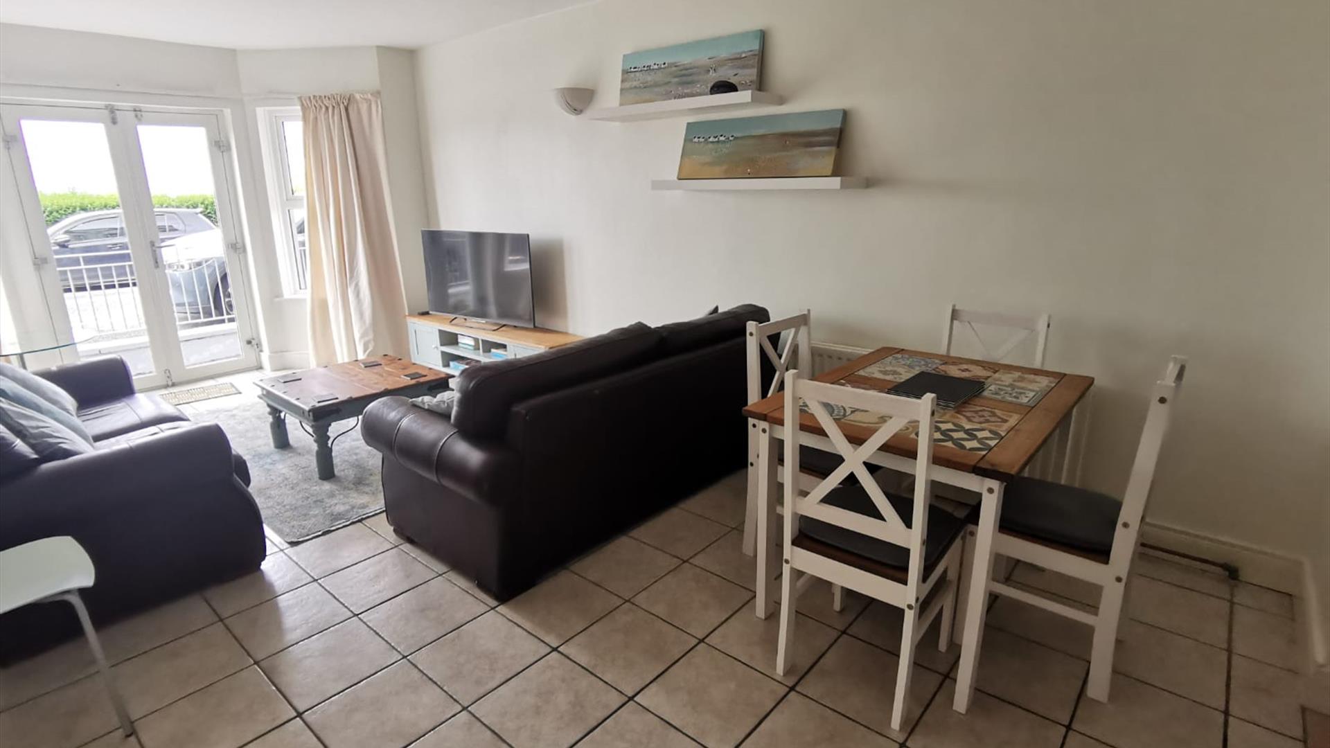 A spacious open plan kitchen and living room area with french patio doors which extends onto a large enclosed patio area overlooking the sea.