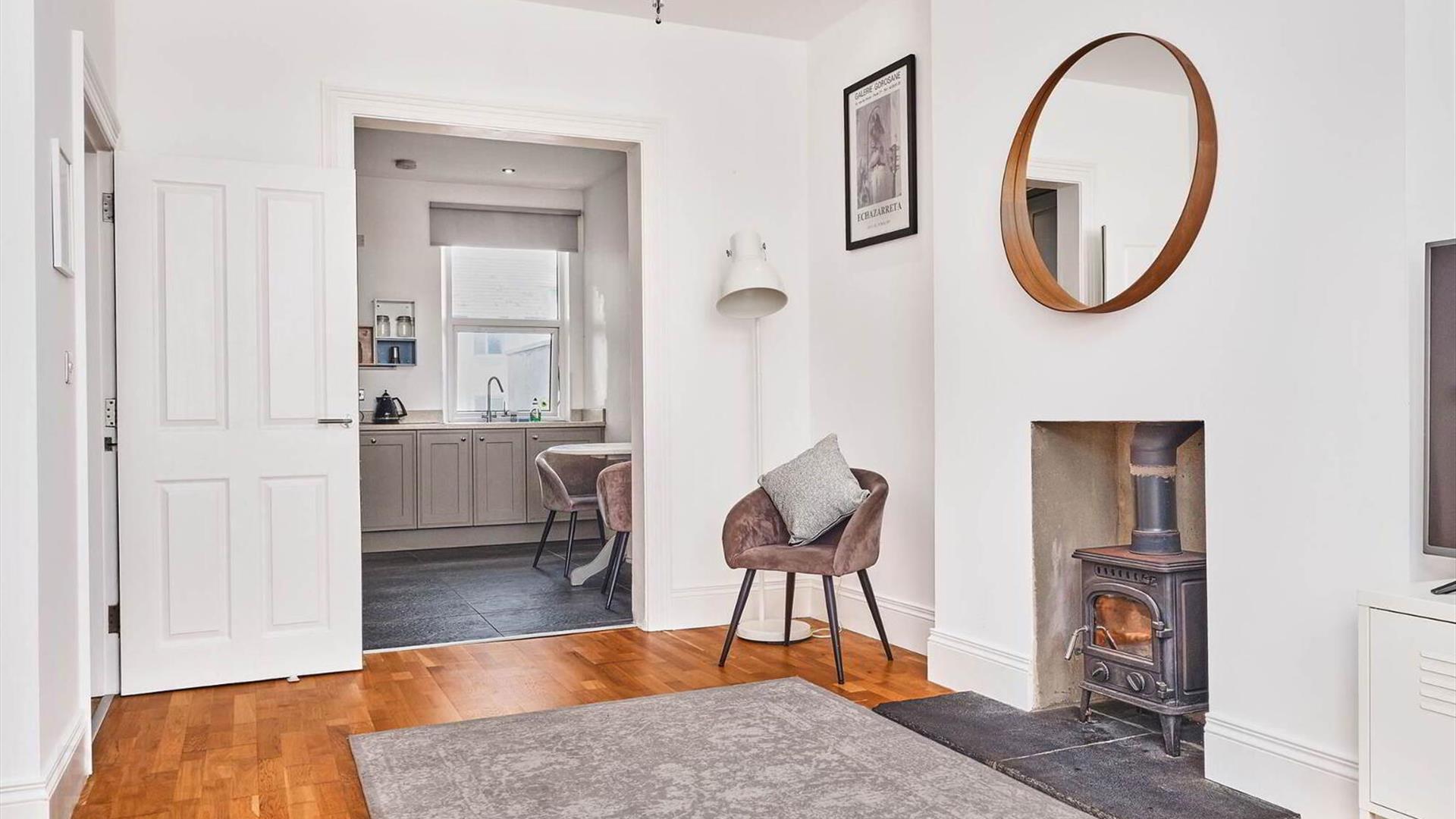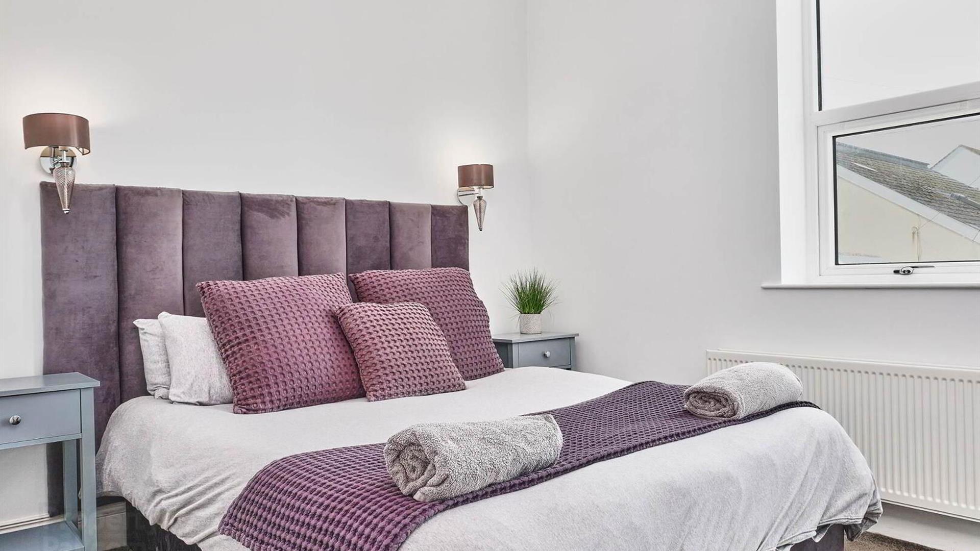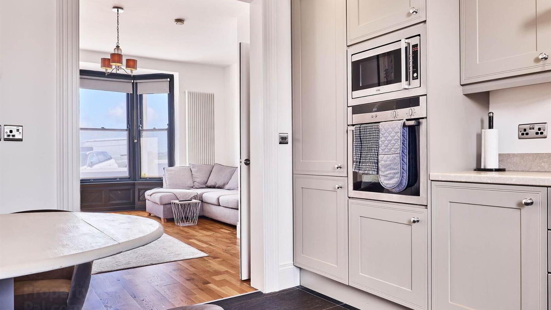 The large bay window living room is open plan to the kitchen dining area. The bedroom has loads of storage and a king sized bed with luxurious bedding.