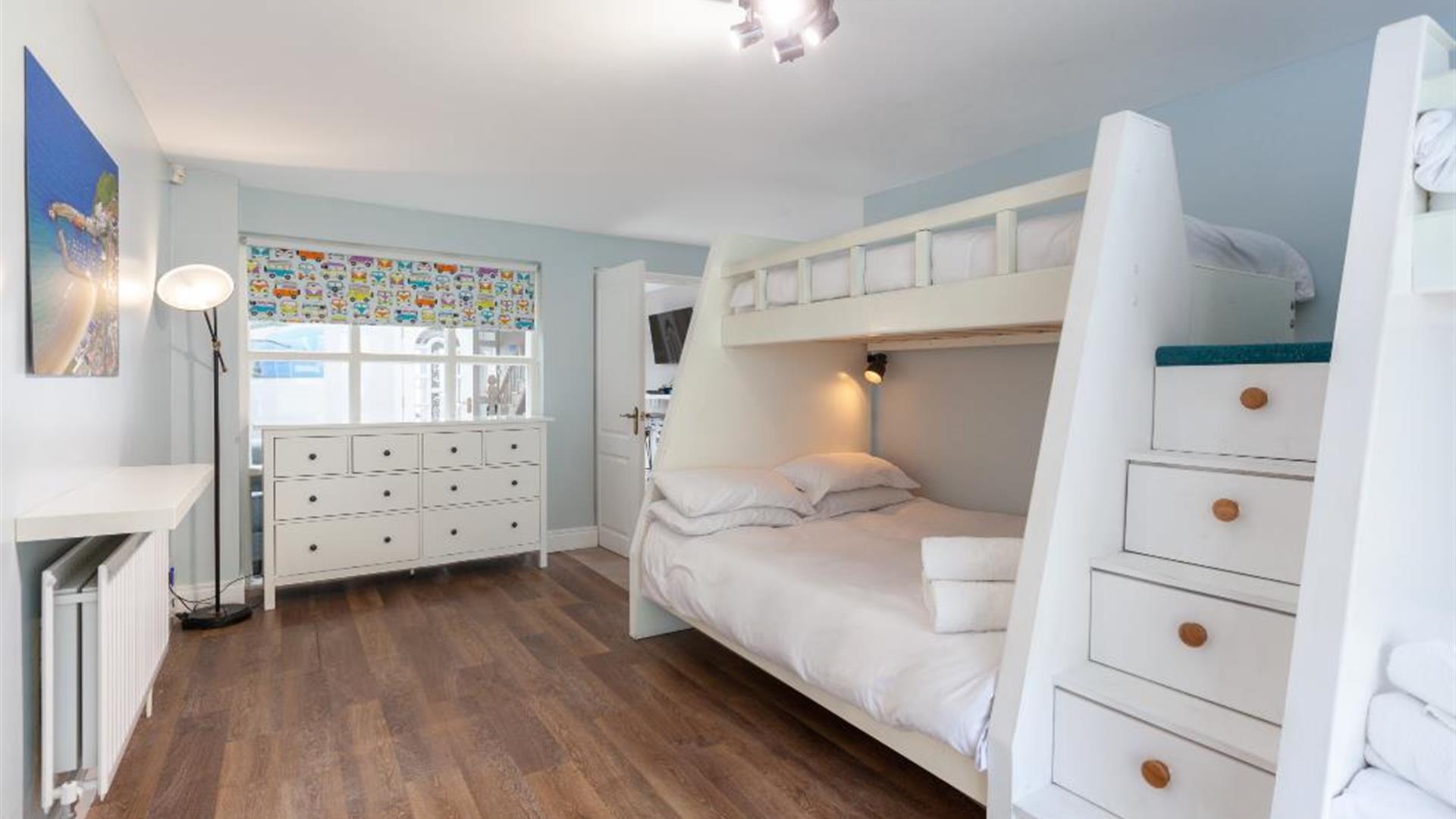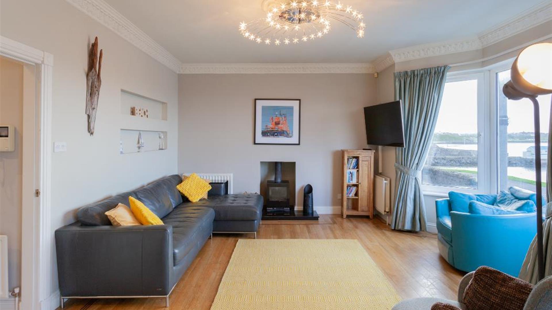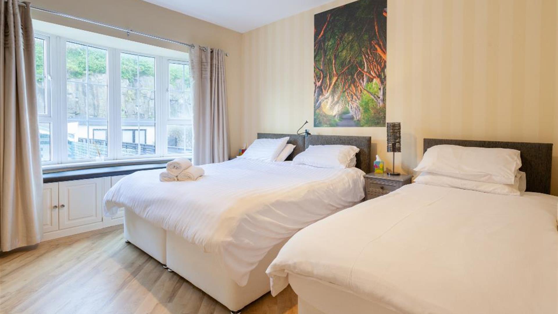 This is a great opportunity to stay right in the heart of Portrush within walking distance of both town and beaches. The world famous Harbour Bar and the Ramore group of restaurants are a just 2 min. walk away. The house itself is spacious with 6 bedrooms over 3 floors. Living accommodation is on the first floor with views across the harbour, West Strand beach and beyond. It is a perfect space for groups or families, having an enclosed, child friendly garden with use of BBQ and a trampoline.The house is perfectly located with easy access to all the attractions of the Causeway Coast including four blue flag beaches, The Giant's Causeway and National trust properties at Downhill Demesne, Carrick-a-Rede rope bridge and Mussenden Temple.