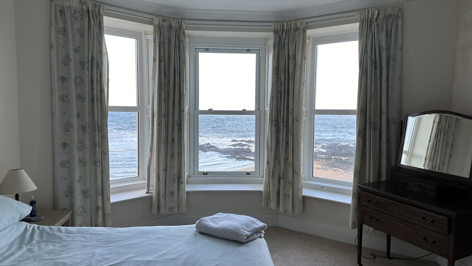 The first floor has a lounge with TV free sat, DVD player. This room opens onto a south facing terrace with outdoor furniture. There are 2 bedrooms with super king beds (beds can be split into 2 singles) with breathtaking sea views from the bay windows. There is another sea view room with a small double bed. There is also a family bathroom on this floor.