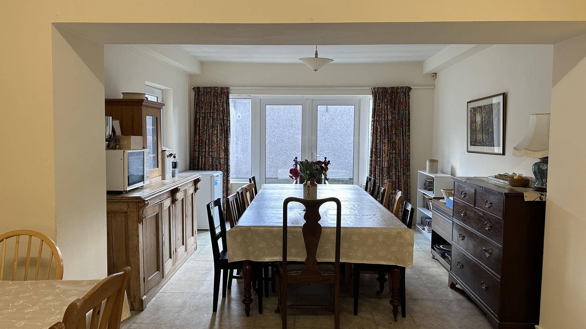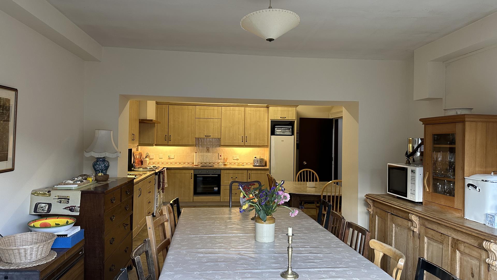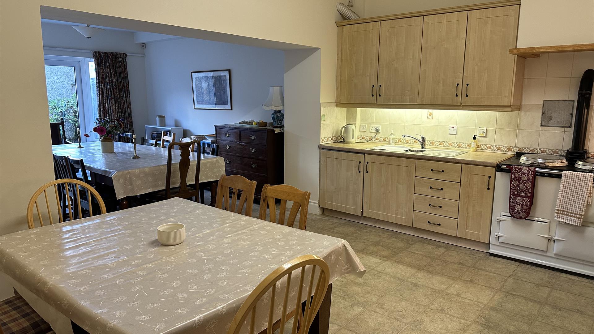 This large 7 bedroom home sleeps up to 14 people. It has a spacious front lounge with a sea view, piano and large selection of board games. The kitchen is well equipped and has a kettle, toaster, dishwasher, tall fridge, separate freezer, microwave, Aga, electric oven and 2 ring electric hob. There are 2 large dining tables in the kitchen that accommodate 14. There is a downstairs WC, iron and washing machine.