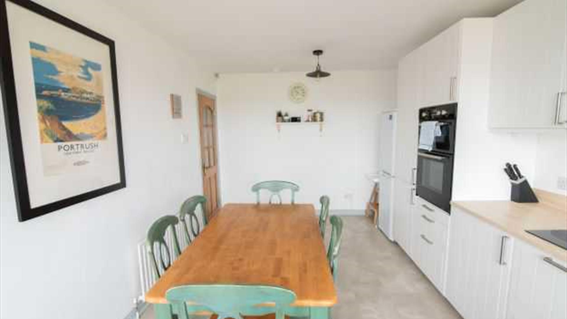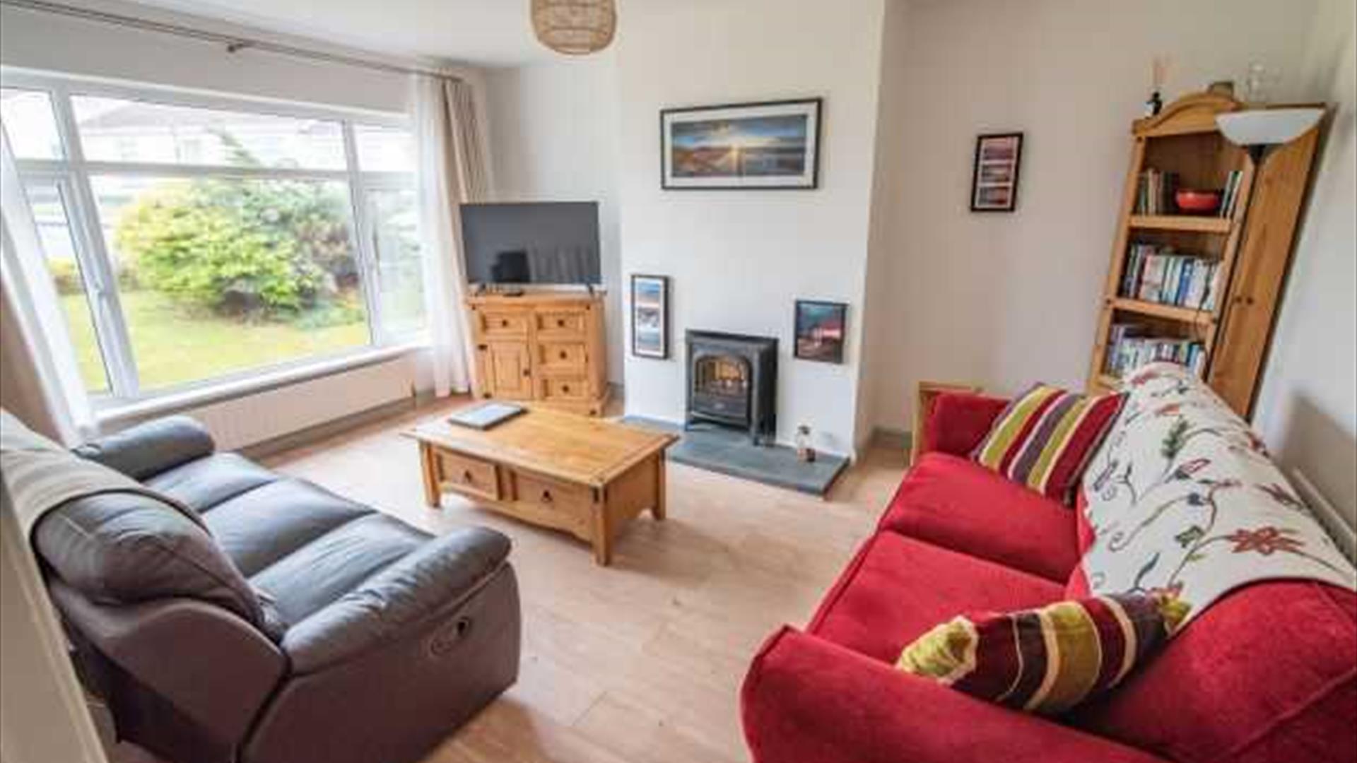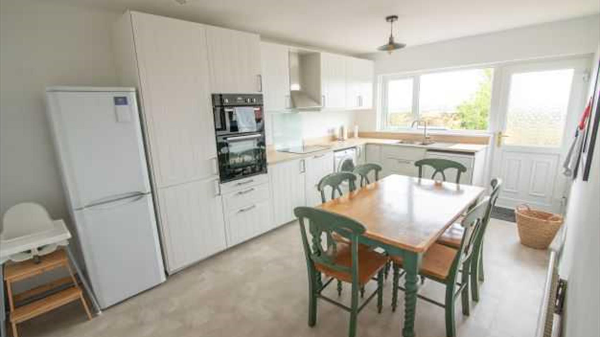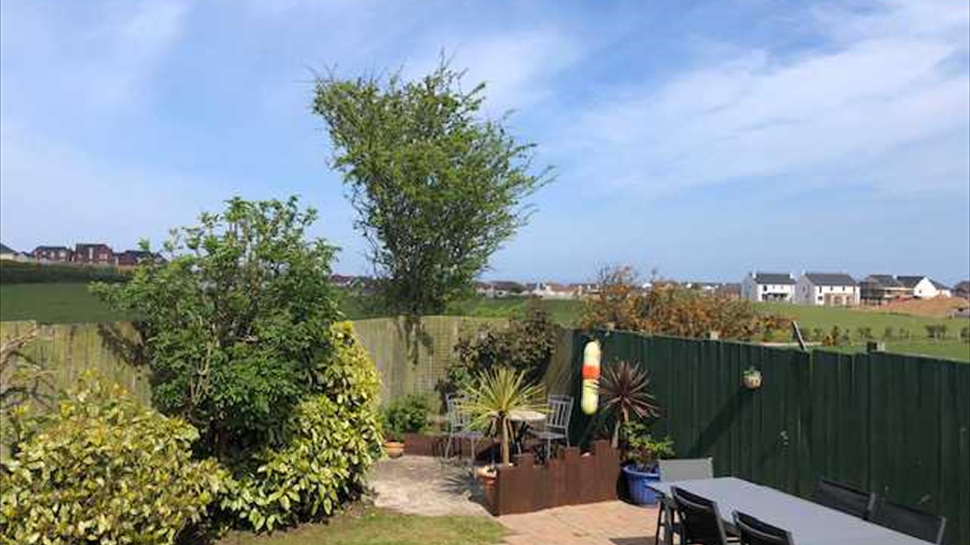 There is a cozy lounge and open plan kitchen/ dining area. The kitchen is equipped with dishwasher, washer/ dryer, eye level oven and induction hob. The backdoor leads out onto a lovely decked area with gas BBQ (please note failure to clean the BBQ after use will result in a £30 charge). The garden also has patio and grass areas with outdoor furniture. There is also a distant sea view.