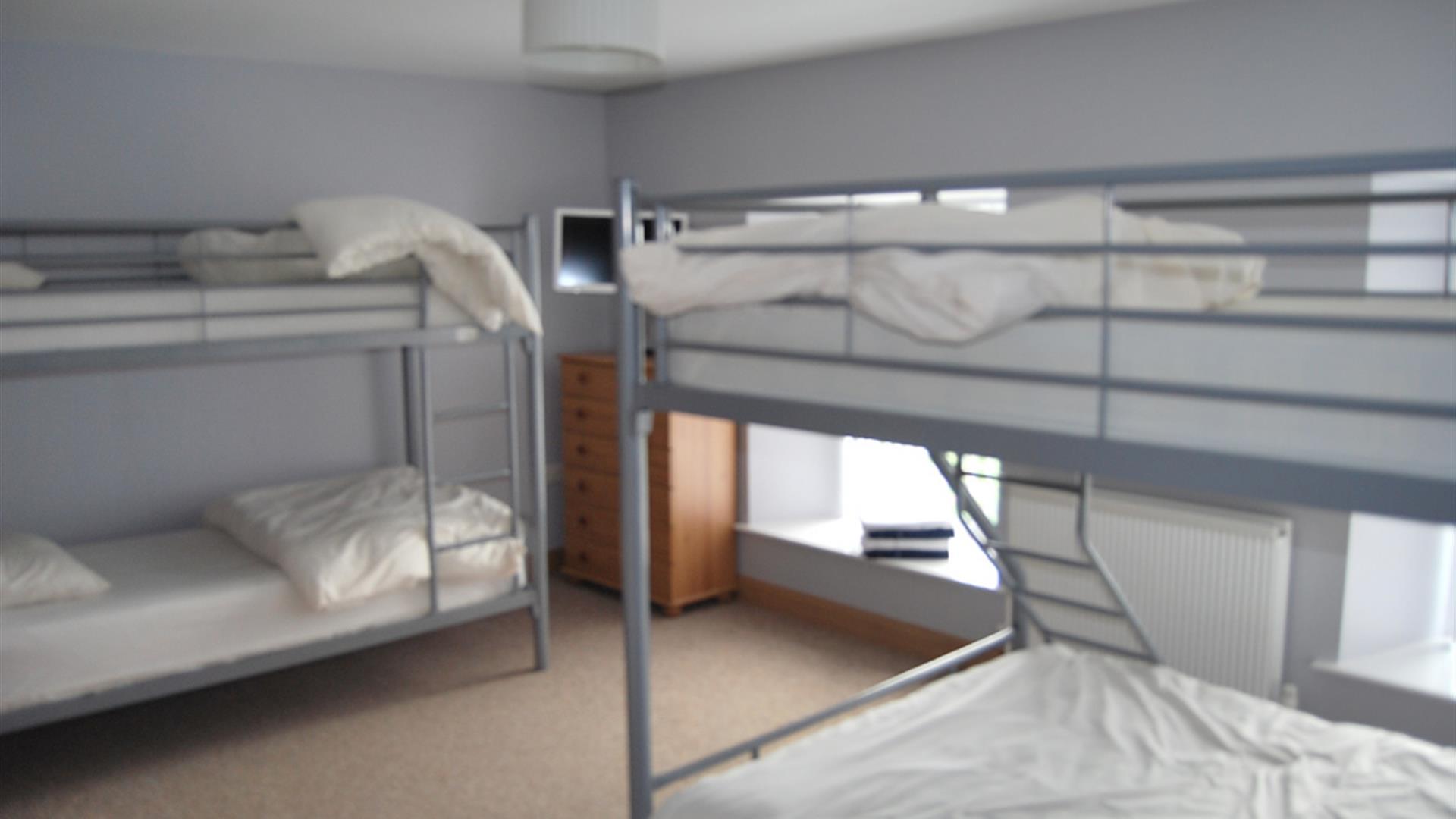 Downstairs Disabled double ensuite, upstairs ensuite room 2 sets of bunks, ensuite room 1 double and 1 single, twin room, twin ensuite, double with 1 set of bunks.