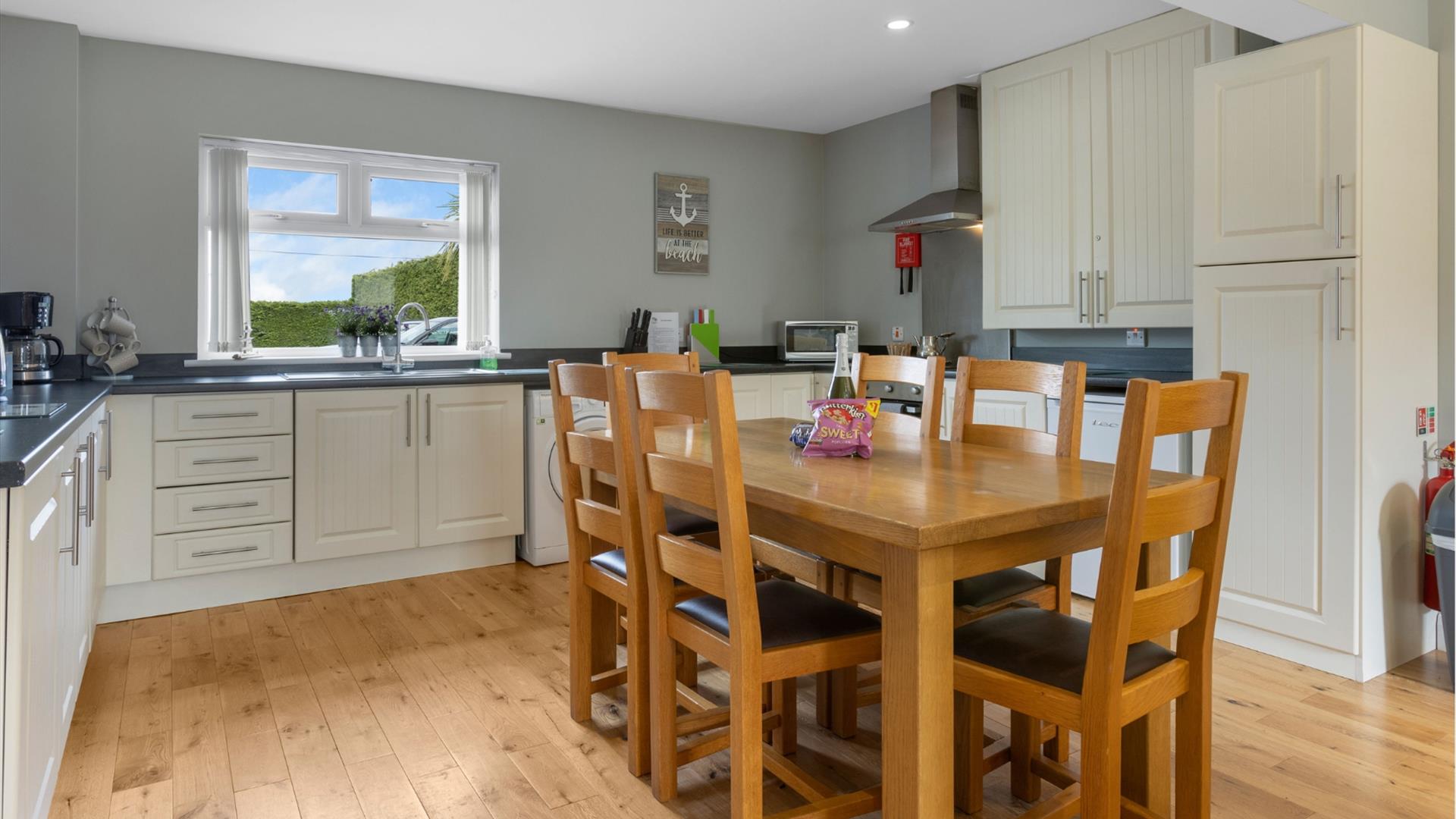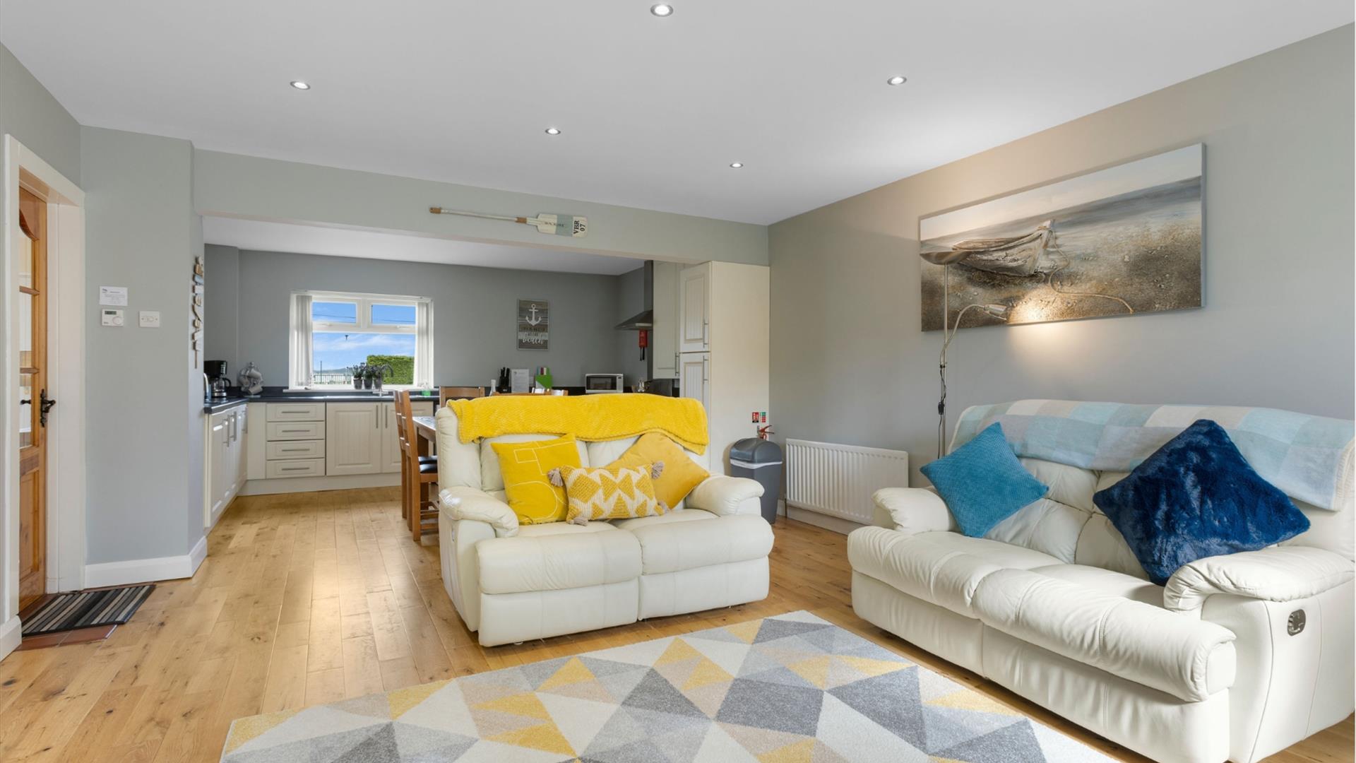 The kitchen/living room is open plan area with a fully equipped kitchen and has a spacious seating area looking out to a Binevenagh Mountain.