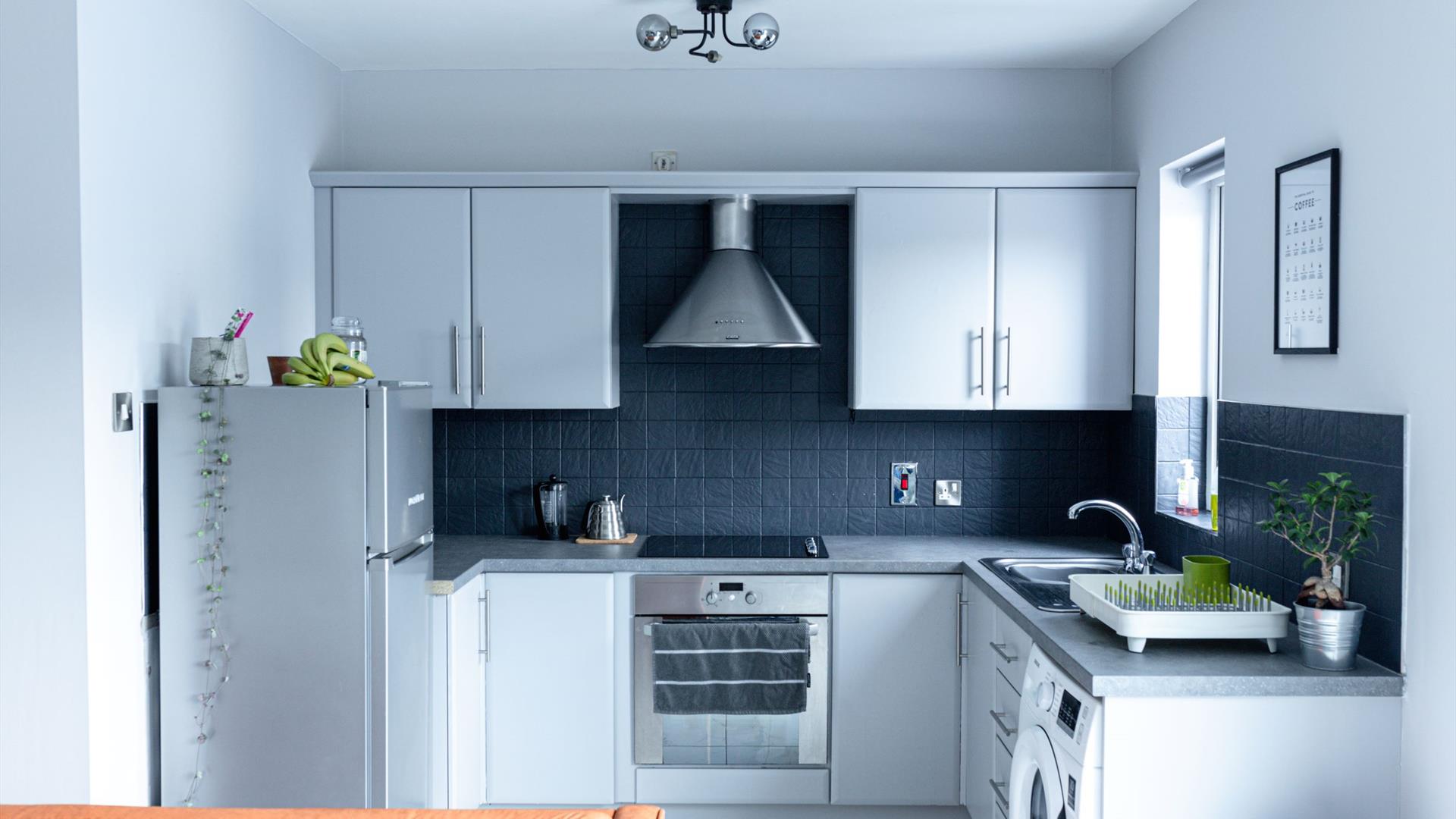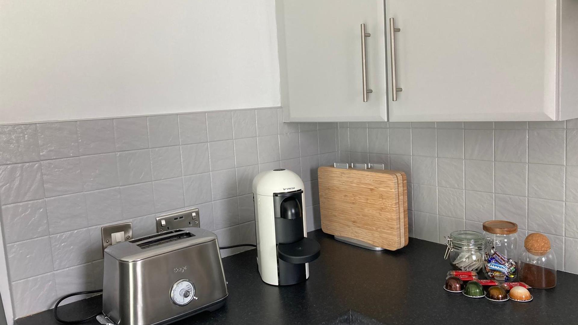 The kitchen is equipped with everything you need. There is a fridge/freezer/hob cooker and oven, washing machine/dryer, microwave, kettle and toaster. There is also a Nespresso machine.