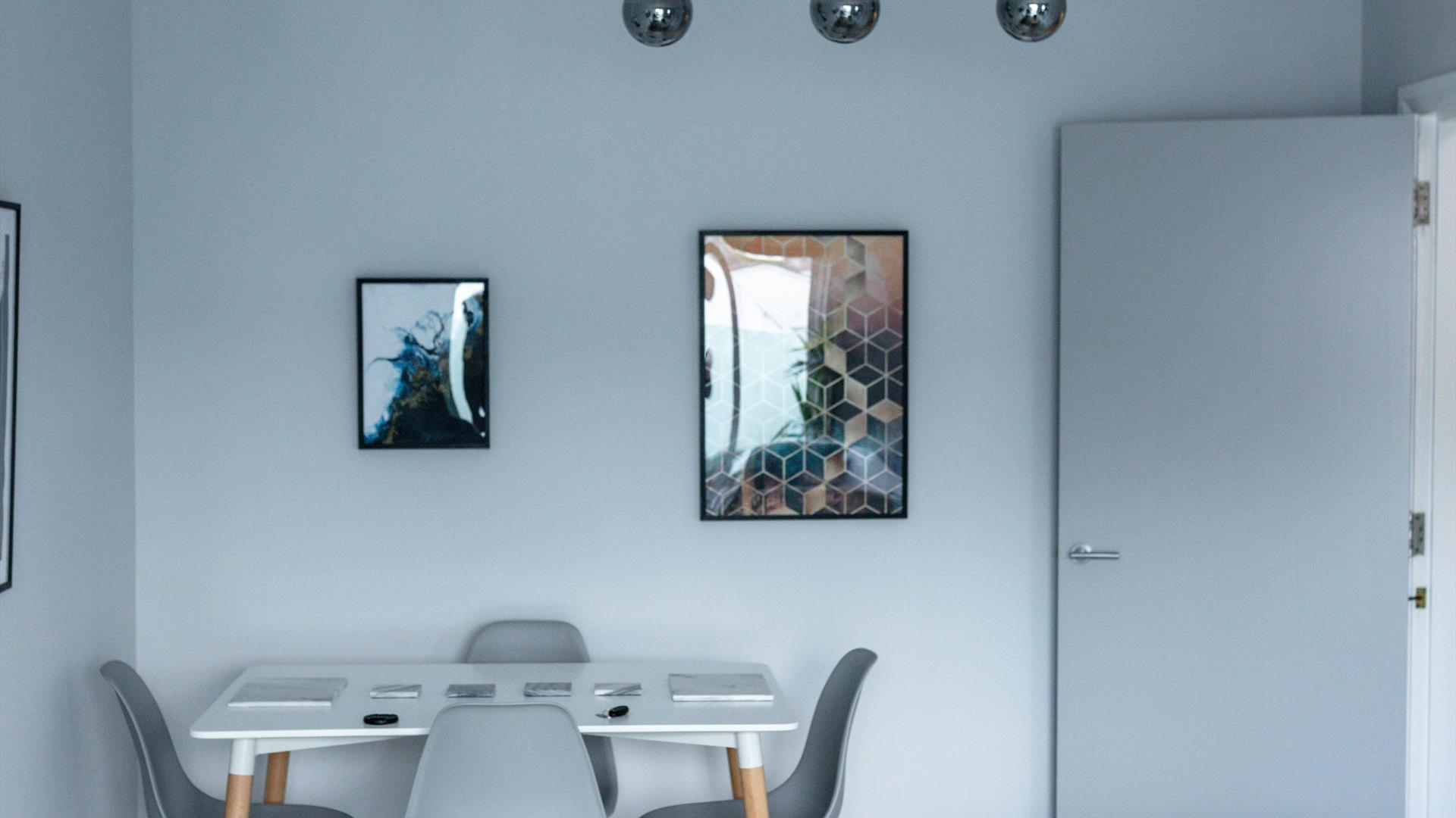 The apartment has wooden flooring throughout styled in a brushed white and grey finish.