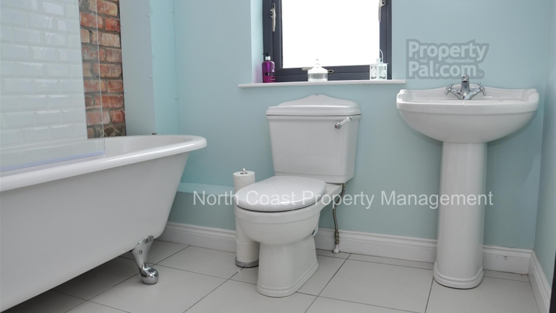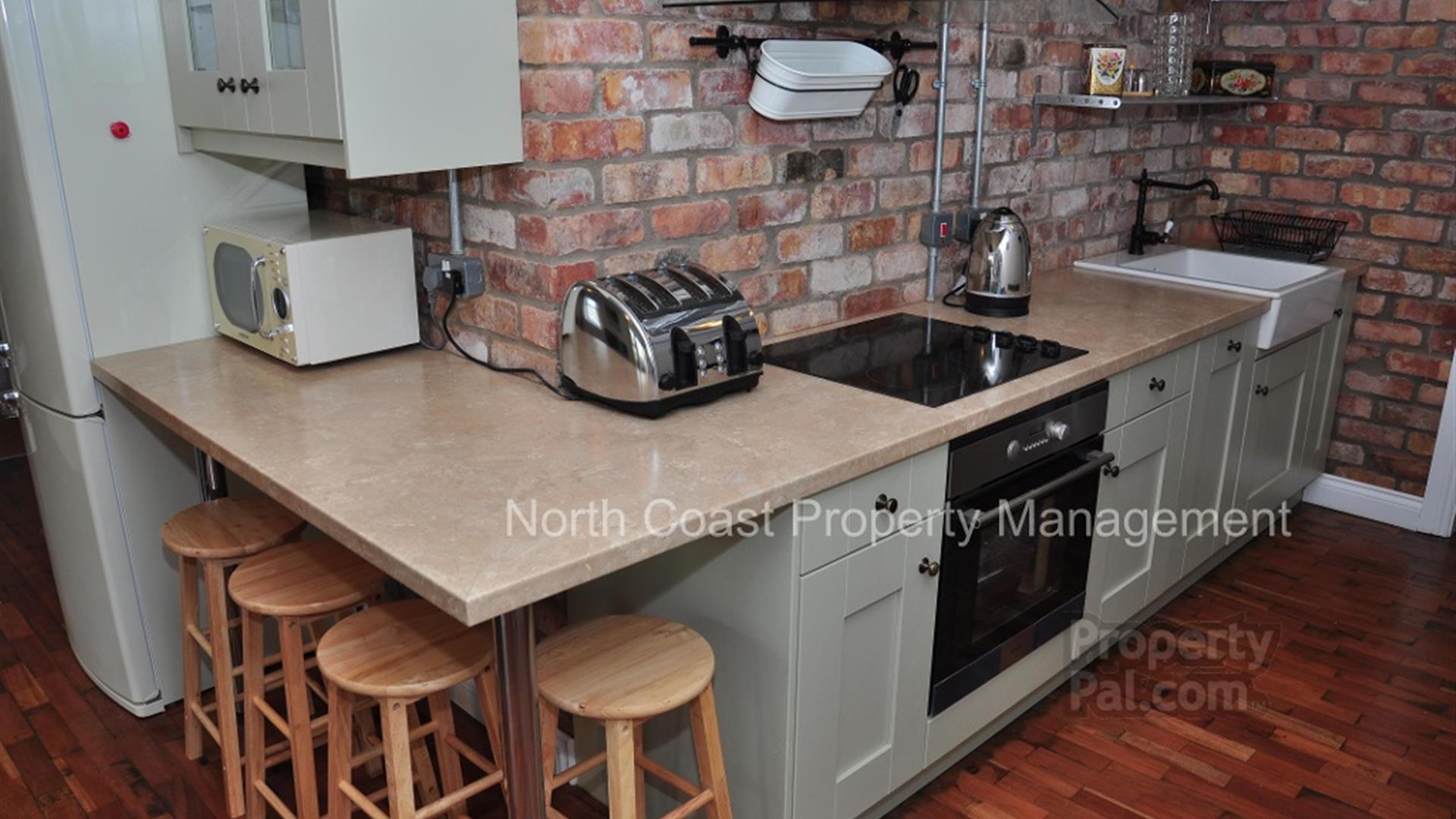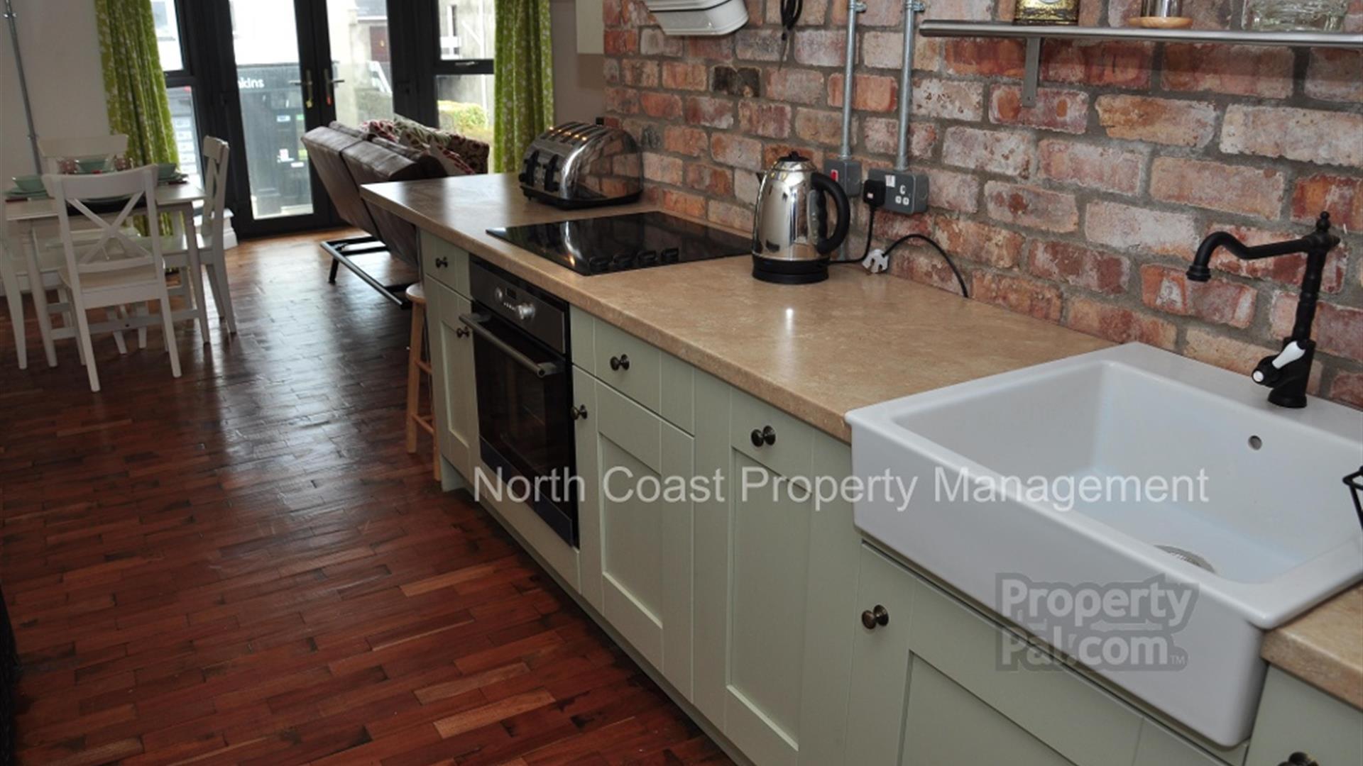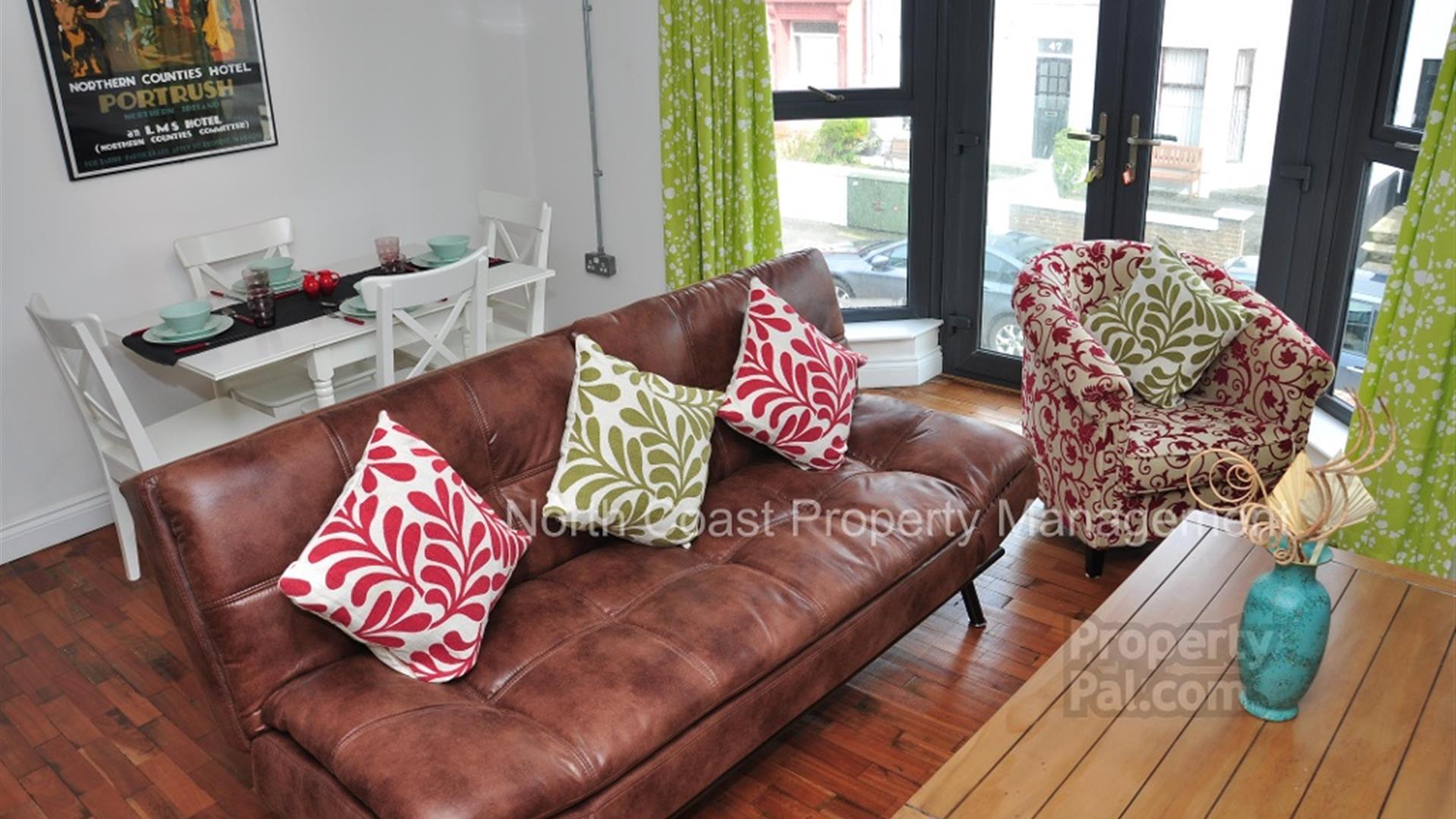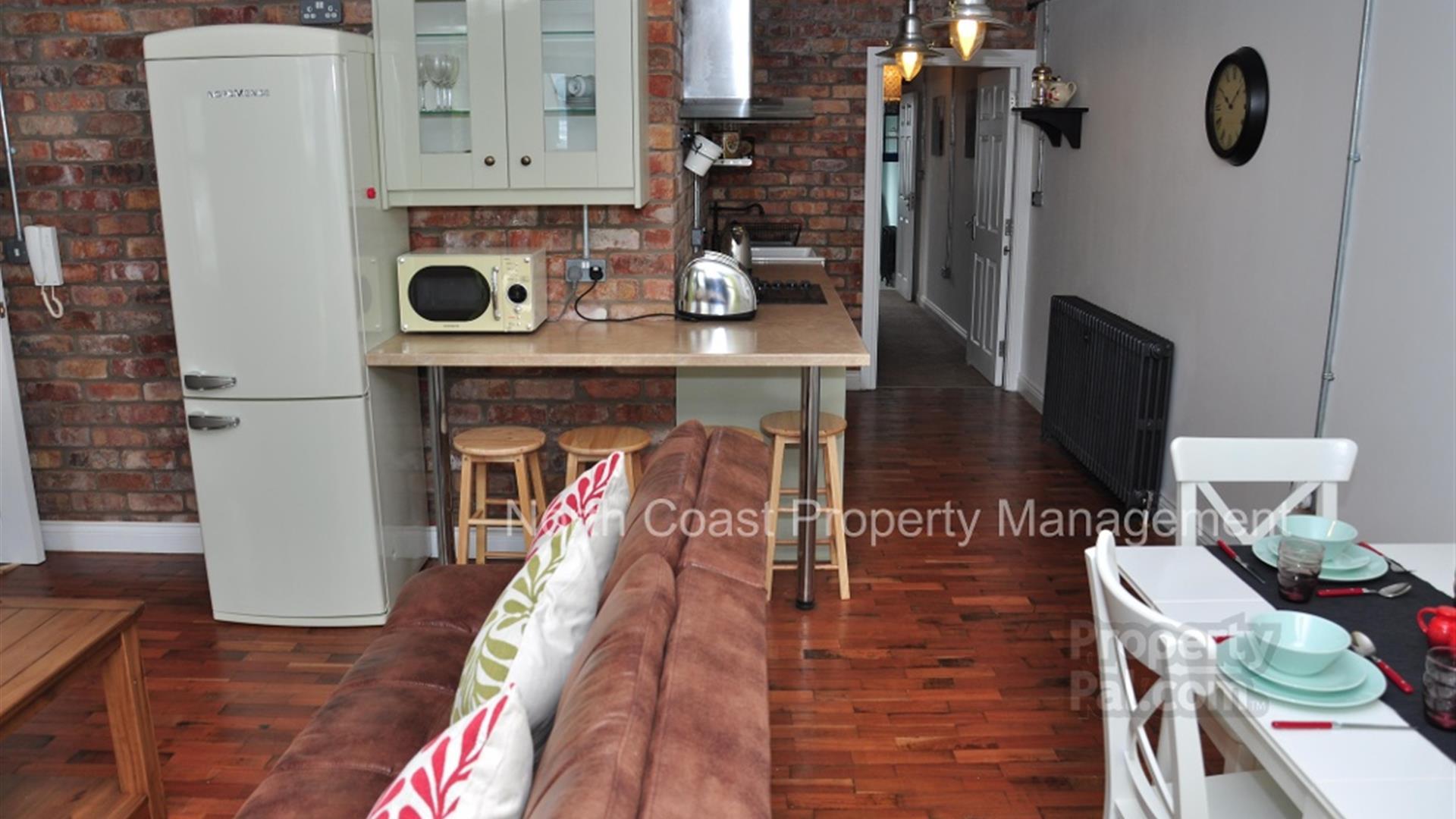 Beautiful stylish loft style apartment in the heart of Portrush. 20 minute drive from the most visited tourist attractions of the Giant's Causeway and Carrick -a-rede rope bridge.First floor apartment with private entry, private parking to rear. Two bedrooms - one king/one twin and one bathroom with roll top bath (shower over it). Open plan kitchen, dining zone and lounge with leather sofa and flat screen TV and DVD player, and dishwasher, washing machine and tumble drier in the kitchen. The apartment is very bright and well decorated with exposed brick effect. Partial sea views and patio doors opening at front of lounge giving the impression of a balcony open area. Unlimited WiFi available.