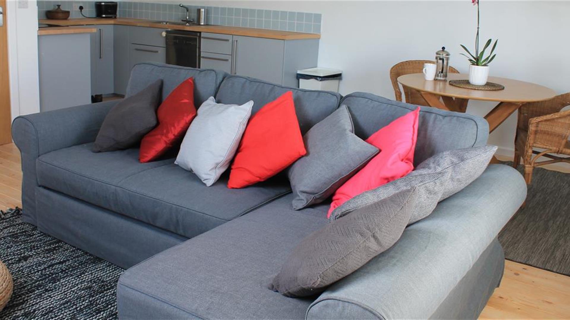 ‘The Loft’ is a first floor one bedroomed apartment with ensuite bathroom and a kitchen/living room. It is one of two one bedroom flats within a converted barn ( see ‘The Cabin’ Rathlin Island). They can be rented separately or together for a discounted price. It is located approximately three miles from the harbour and is accessed by an exterior staircase. It is suitable for singles, couples and groups of up to four persons.