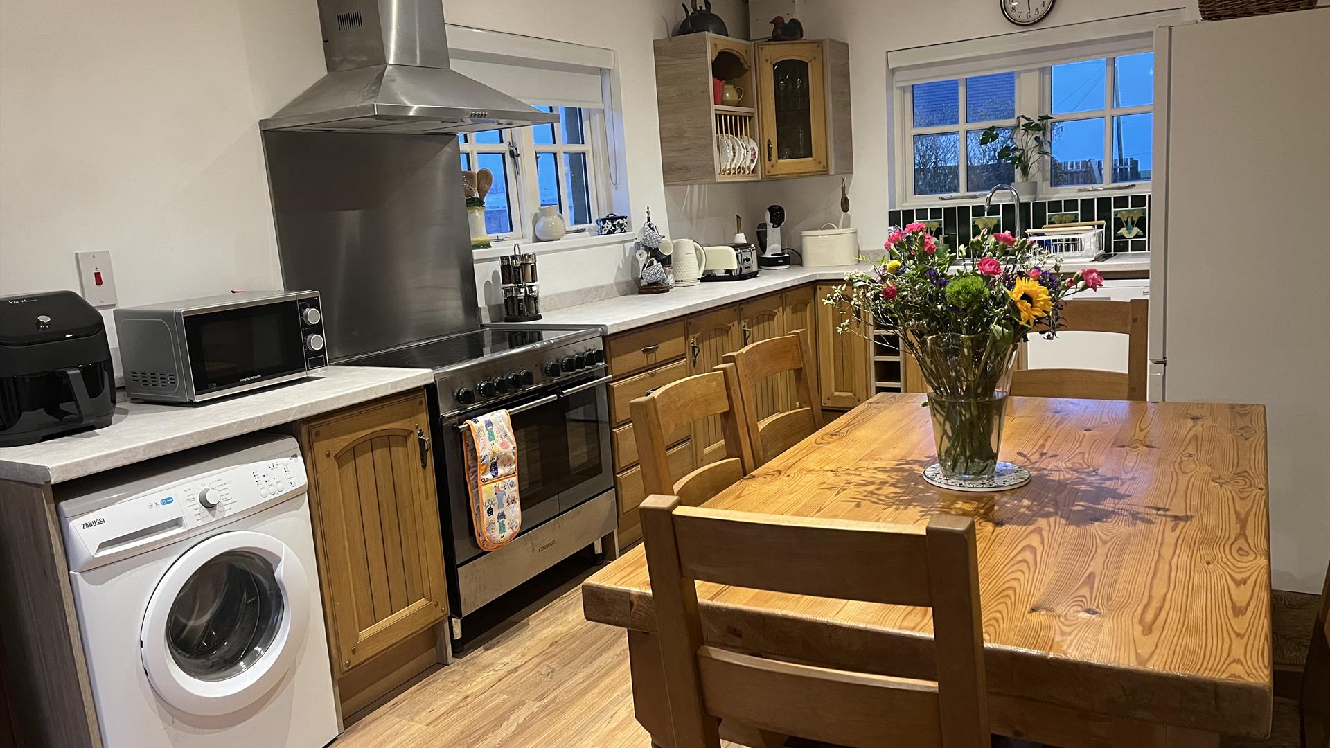 There is an expansive living area and a separate, well-equipped kitchen and dining space, complete with all essentials for culinary adventures. Guests can also enjoy the convenience of an air fryer, microwave, kettle, toaster, coffee machine, dishwasher and washing machine, along with complimentary tea, coffee, and sugar.