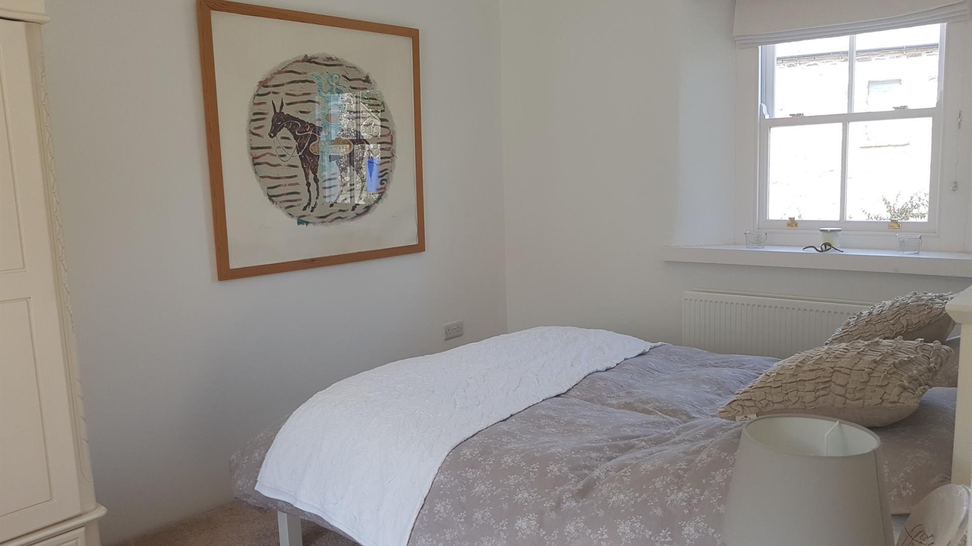 All accommodation is on the ground floor for easy access. There are two bedrooms - one with a king-size bed and one with twin beds - as well as a large open-plan living space with kitchen and dining area, and a bathroom with separate bath and walk-in shower. Double french doors open from the living room onto a small back garden with wooden bench, and there is on-road parking just outside the front door.