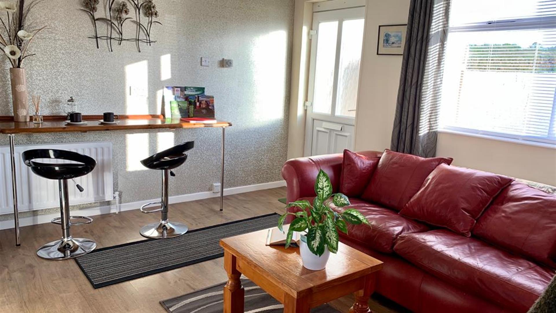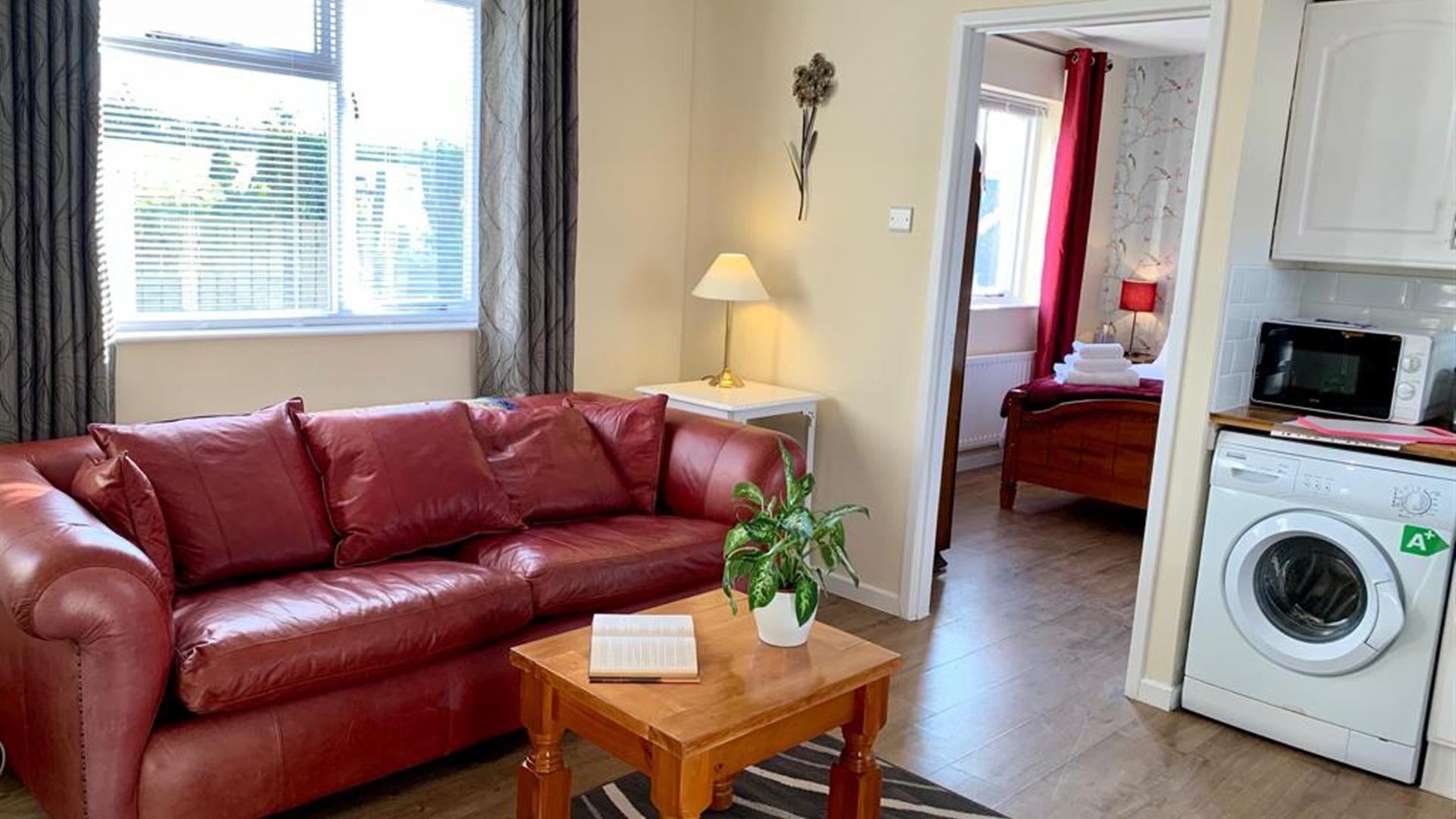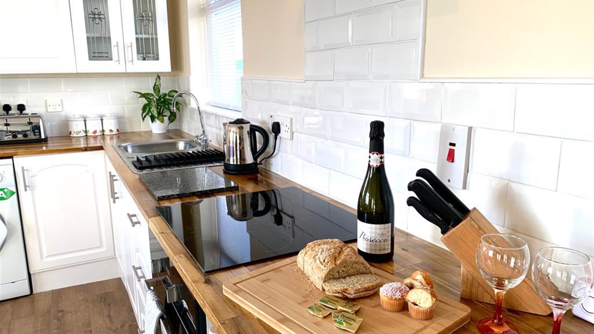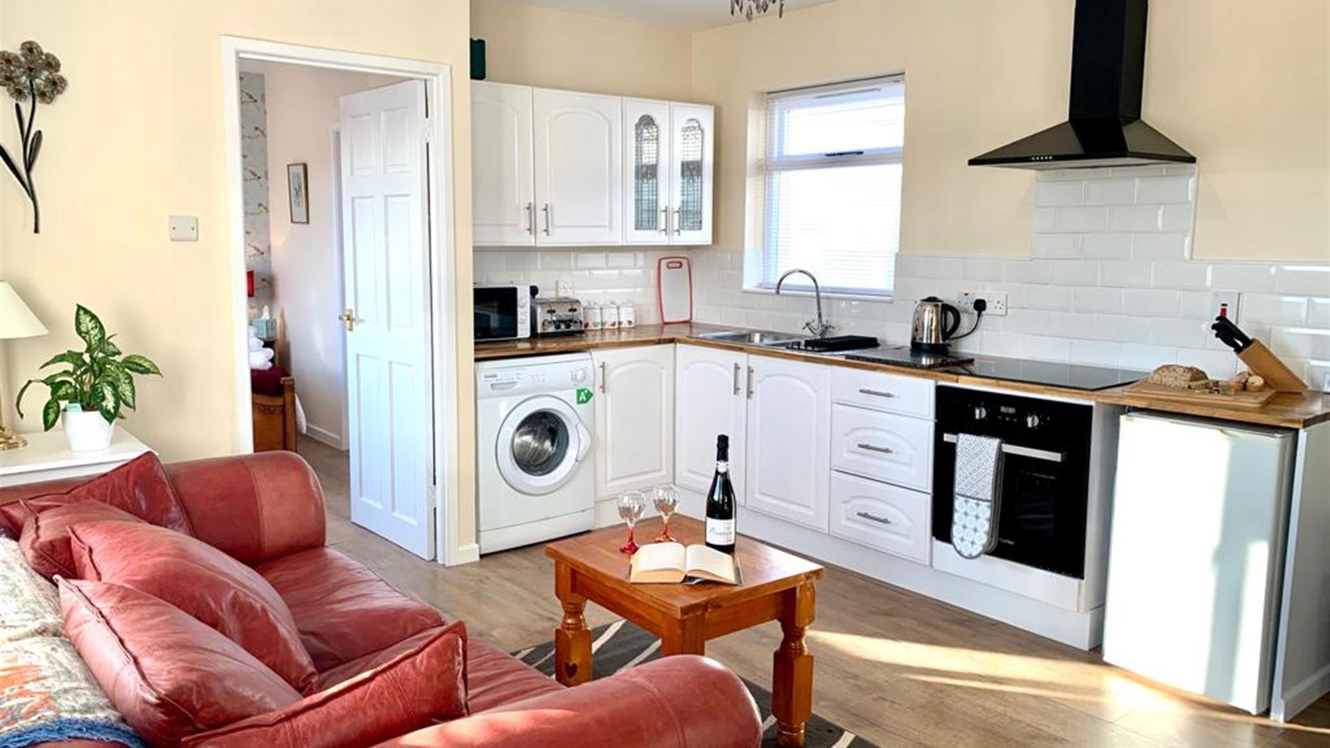 A modern bright and airy fully equipped kitchen with comfortable combined living and dining area. A beautiful separate double en-suite bedroom.Open plan Kitchen/ living room - Modern kitchen very well equipped with cooker, induction hob, extractor fan, microwave, toaster, fridge freezer, washing machine, tv, ironing board, iron and full cooking equipment pots, pans, cutlery, crockery etc provided. A stylish breakfast bar area to enjoy your meals or use as a desk. Comfortable 3 seater sofa and coffee table.