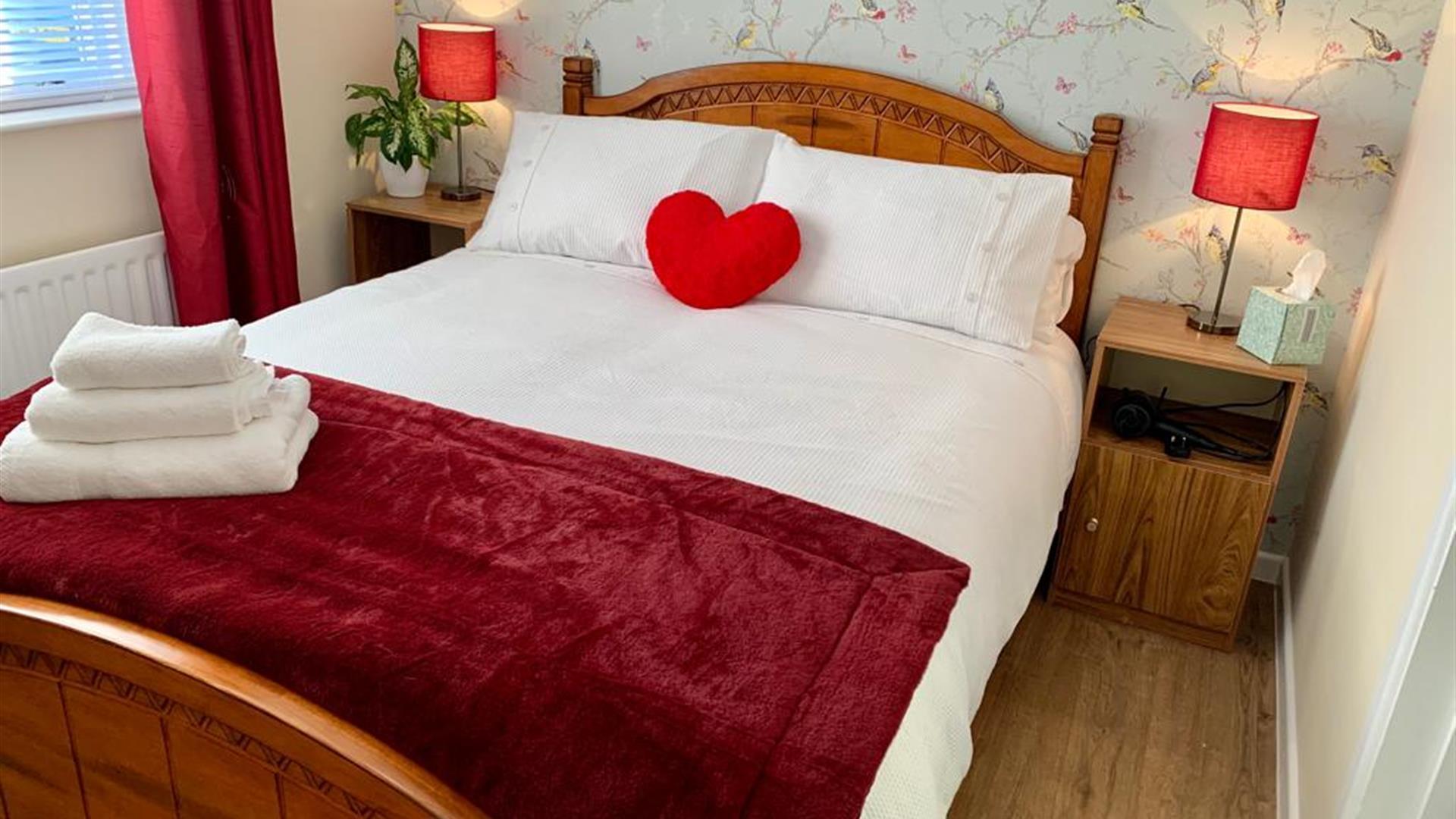 Bedroom - A cosy super comfortable double bed with bedside cabinets, a vintage wardrobe, full length mirror and hairdryer.