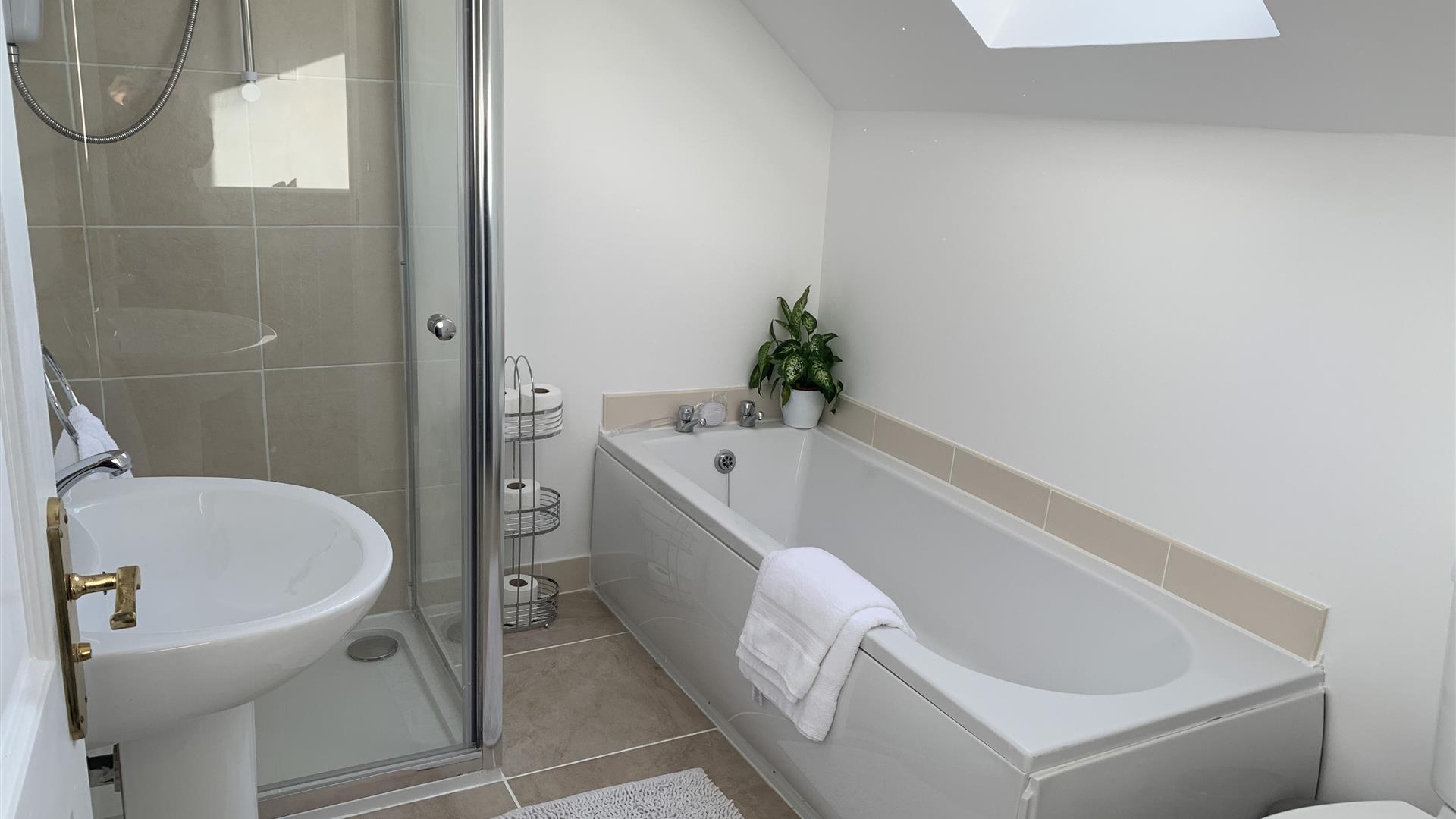Main bathroom - Modern contemporary bathroom suite comprising of bath, separate shower unit , hand basin and W.C. Towels and Toiletries provided.