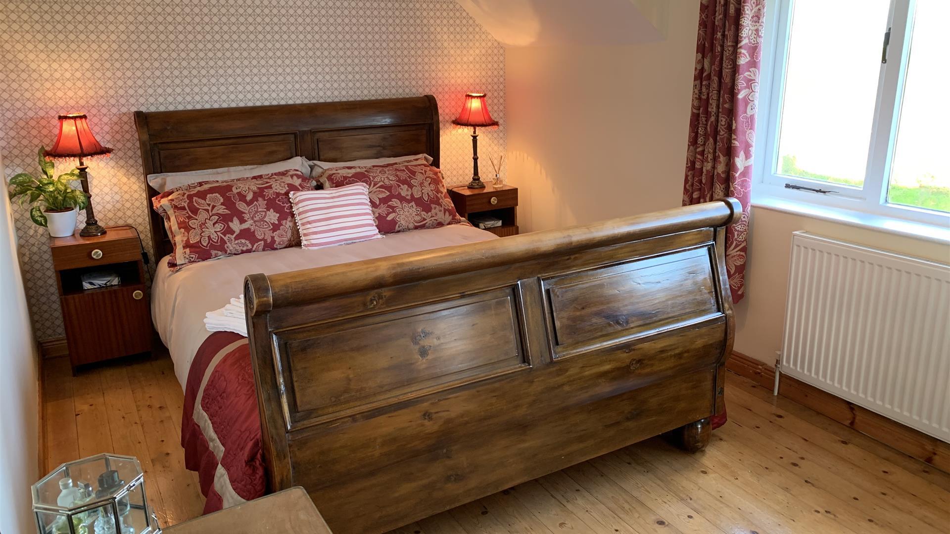 Master Bedroom - Situated on the 1st floor, the master bedroom boasts stunning views overlooking the rolling countryside. With a deluxe antique kingsize sleigh bed, bedside tables, a vintage dressing table, hanging and storage space provided and a blackout blind.