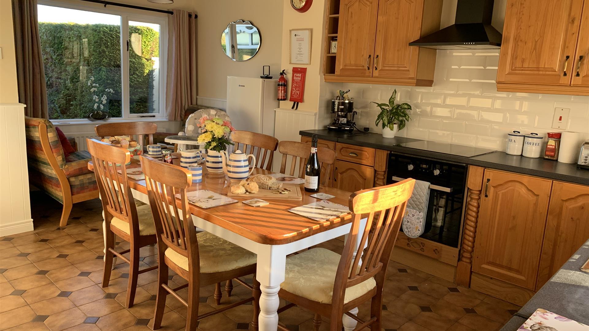 Kitchen/Dining Area - Country kitchen with large 6 seater dining table and chairs, boasting a separate seating area with a comfortable suite. The spacious kitchen is fully equipped with cooker, induction hob, extracted fan, dishwasher, microwave, toaster, fridge freezer, tv, child high chair and also fully stocked with cooking essentials pots, pans, cutlery, crockery etc.