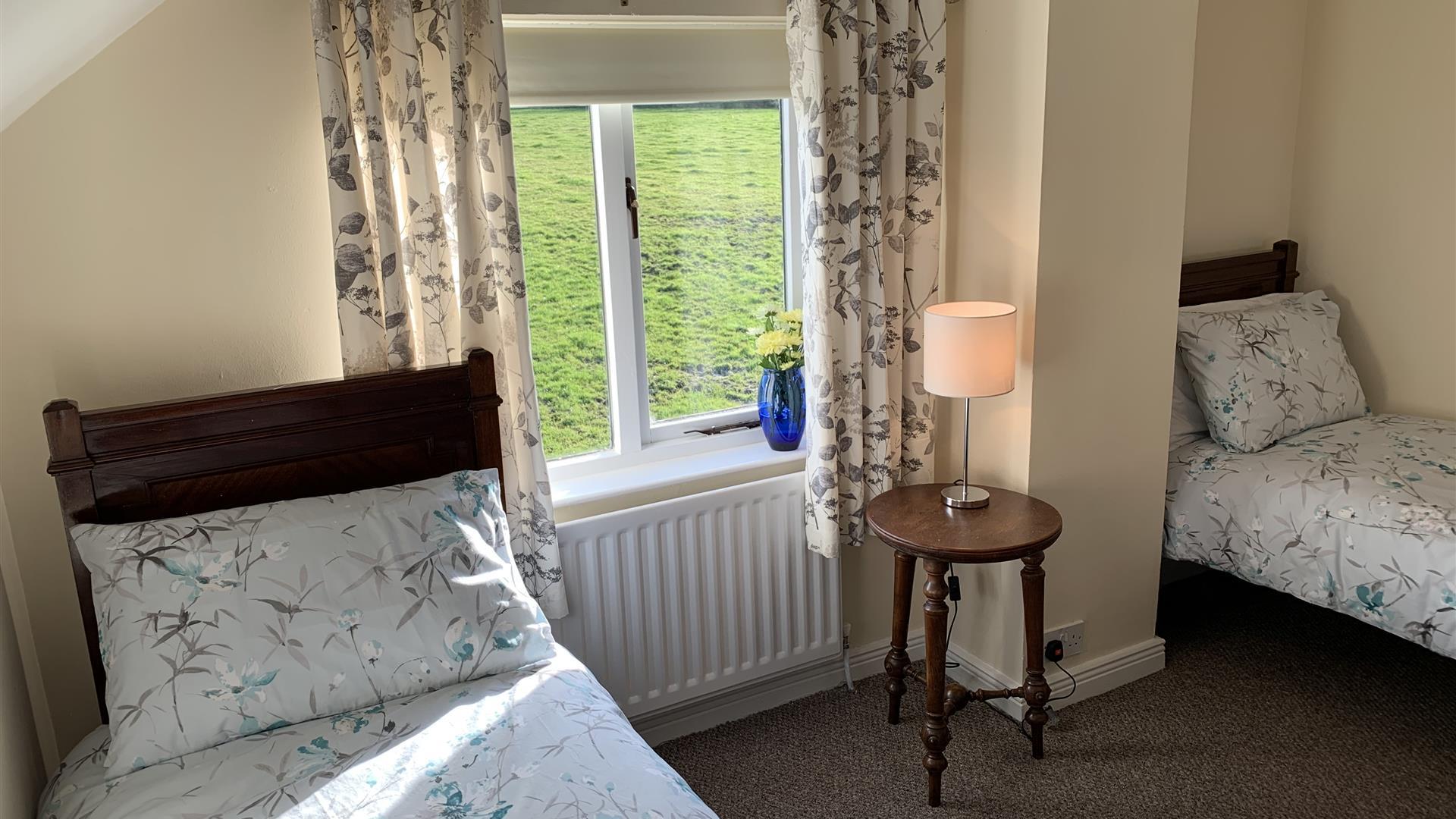 Bedroom 3 - Beautiful view of the surrounding country with sprung antique twin single beds, dresser with mirror, hanging space and a blackout blind.