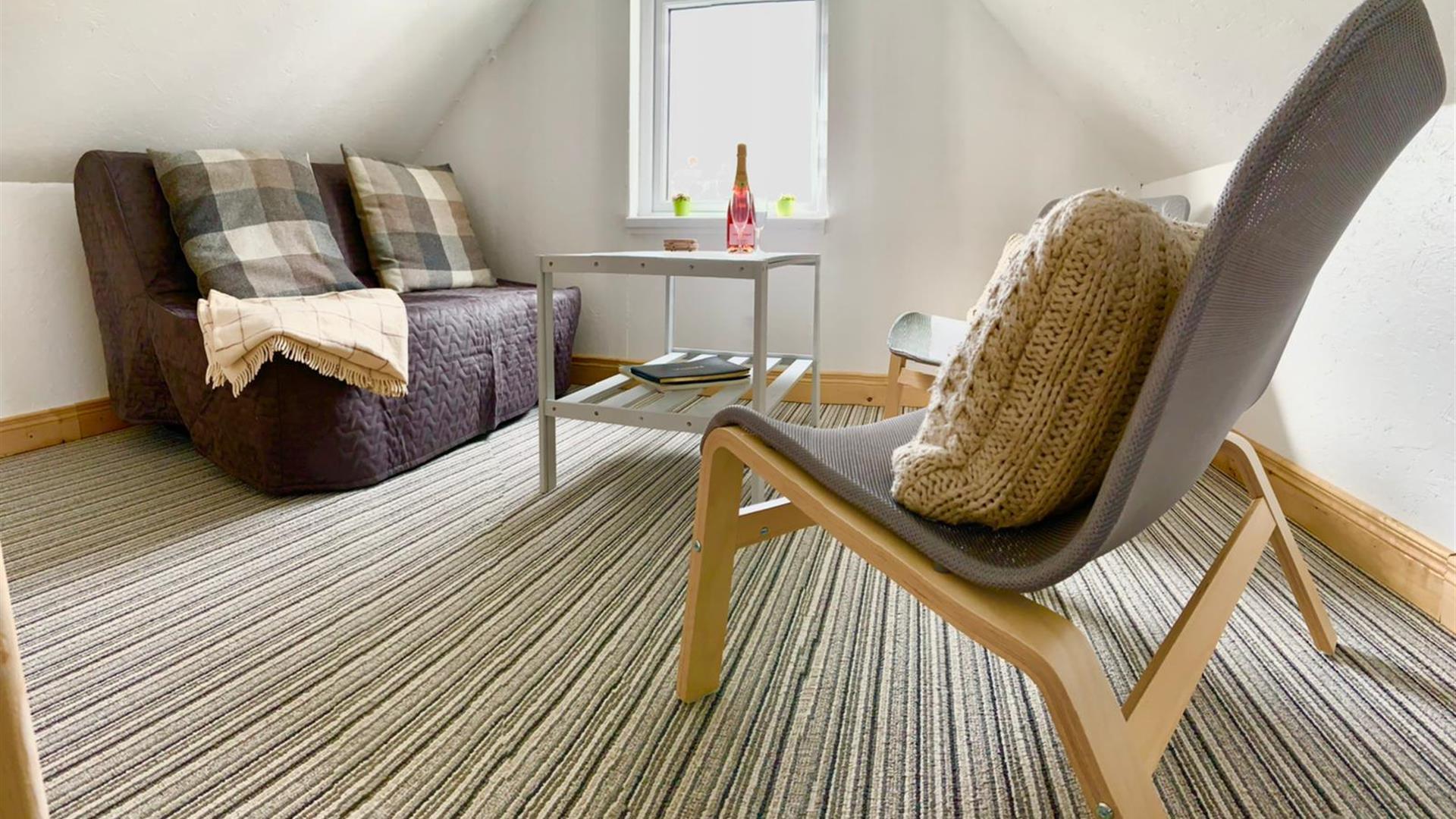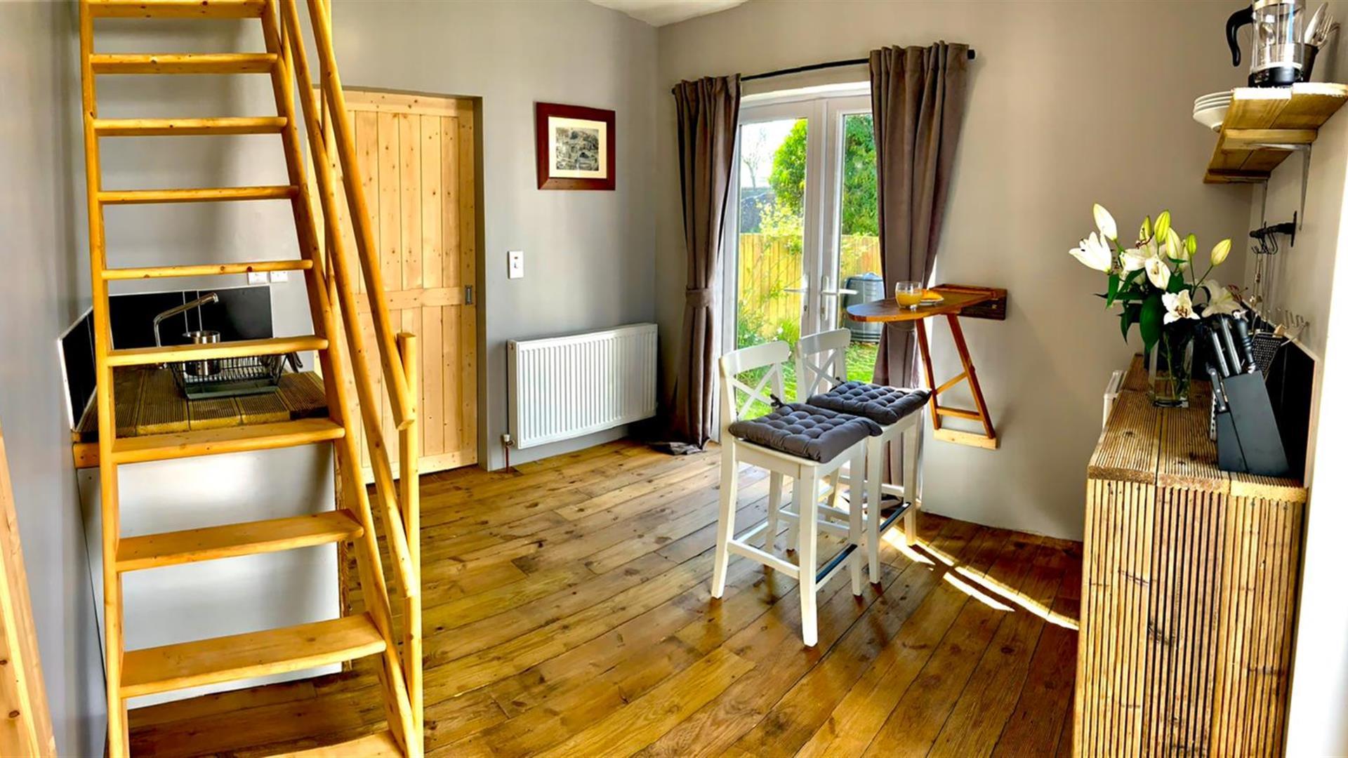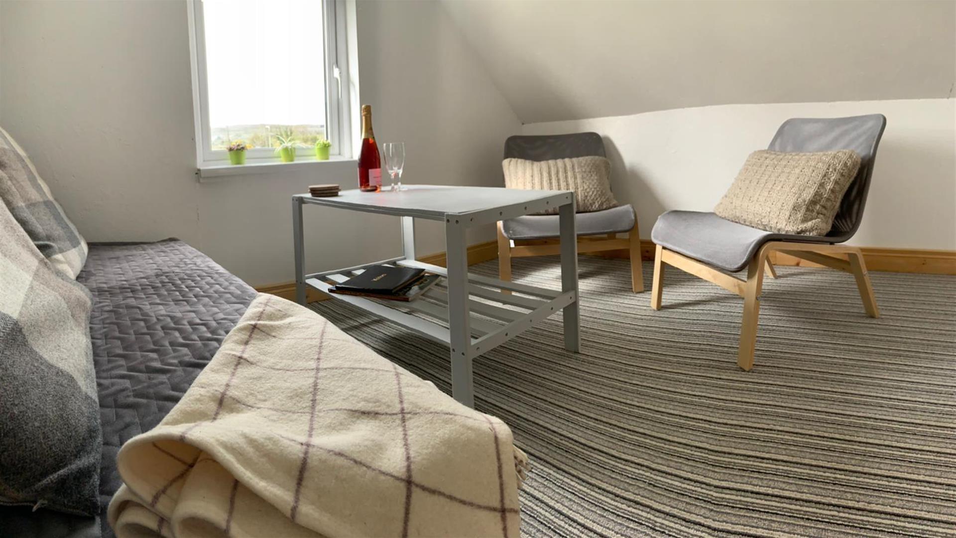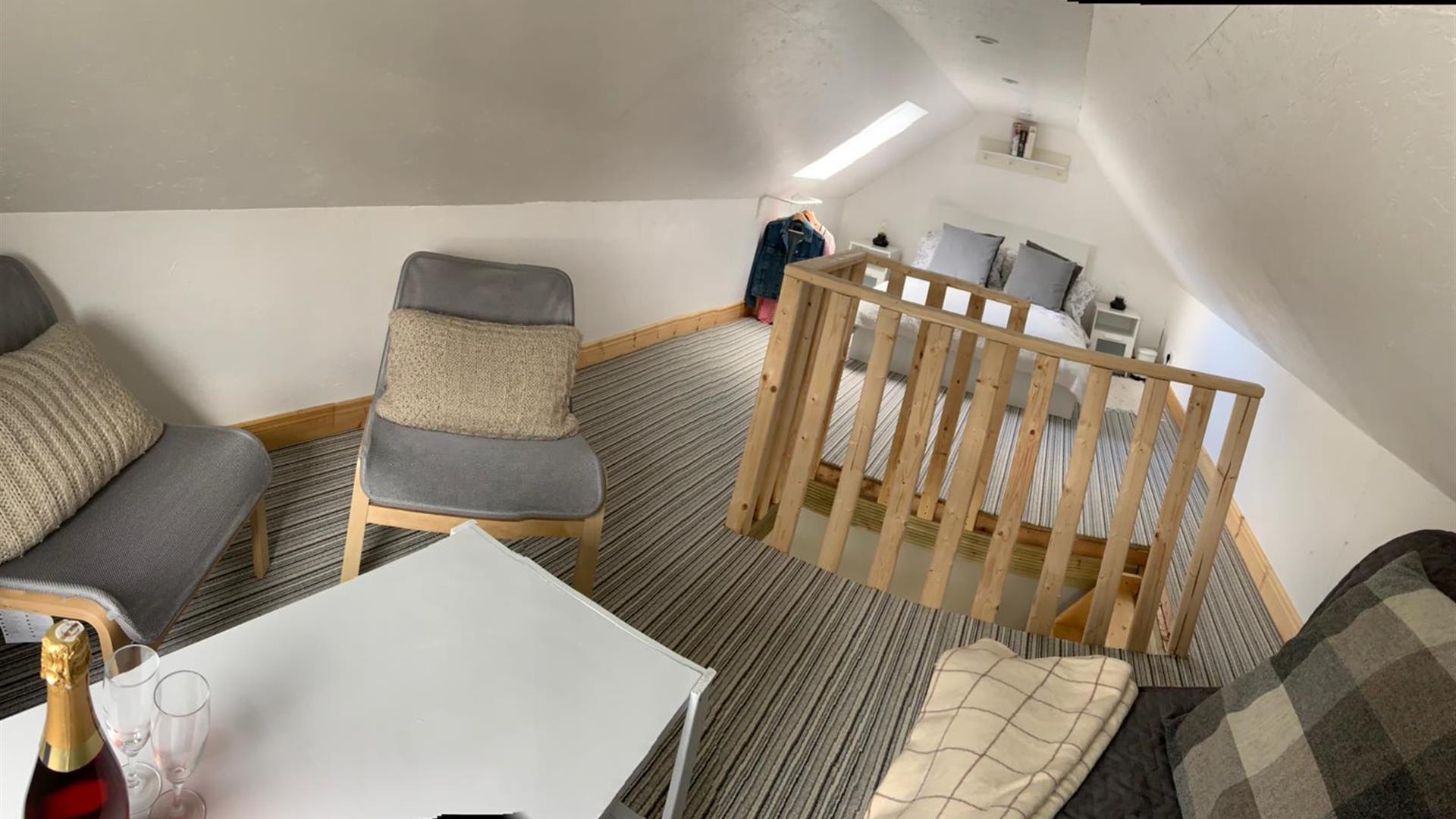 The Loft is a two story garage conversion with the kitchen area & bathroom room with shower located downstairs. Double patio door open on to a patio area. The upstairs comprises of an open plan living area & bedroom. The sofa folds out into an additional small double bed if required. The Loft is only suitable for guests with full mobility as the stairs accessing the living area is steep and the the upstairs has some low ceilings.