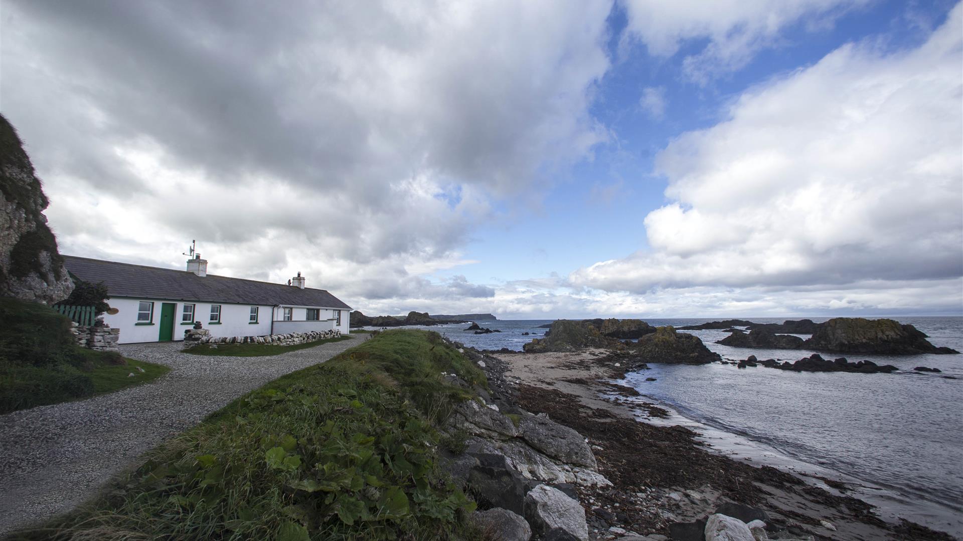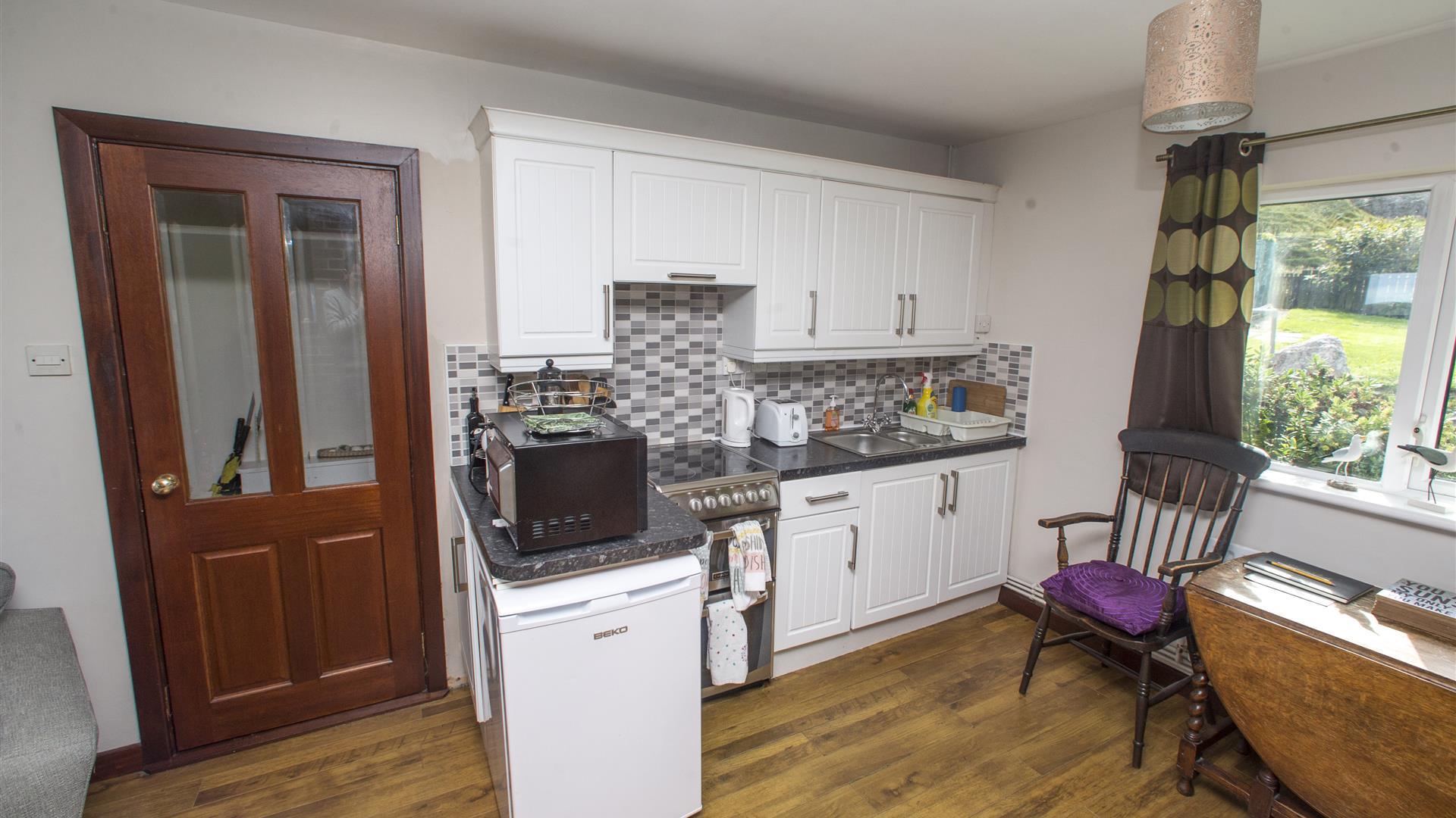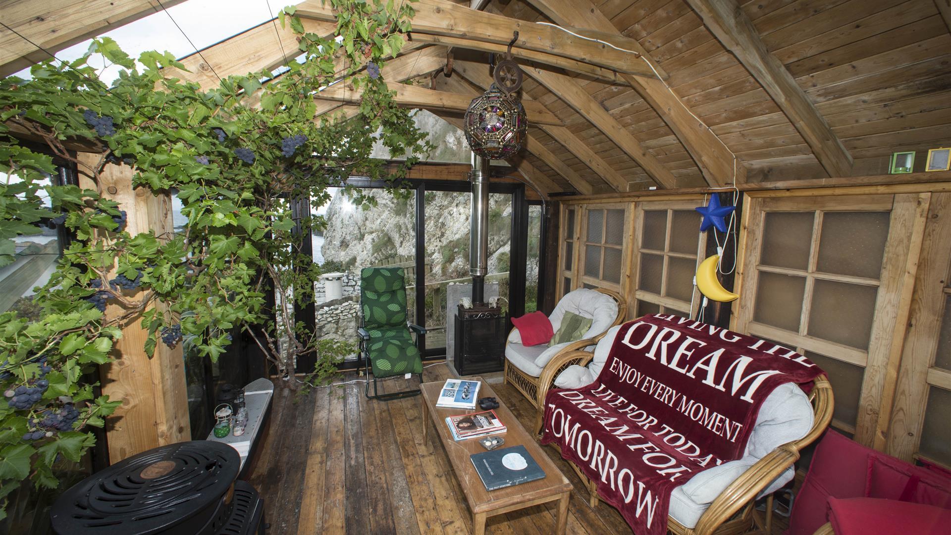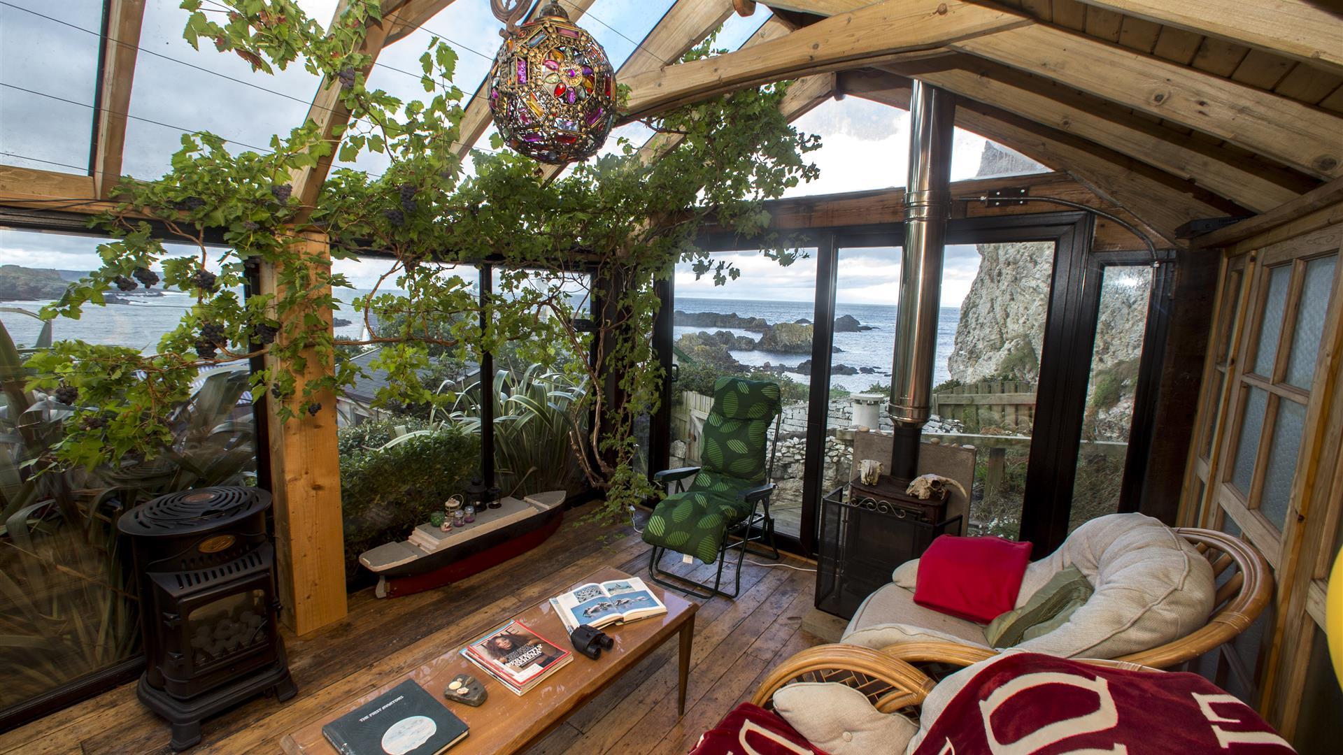 Garden sun room with gas stove on elevated position in the back garden giving year round views of the Atlantic Ocean and stunning seascapes.