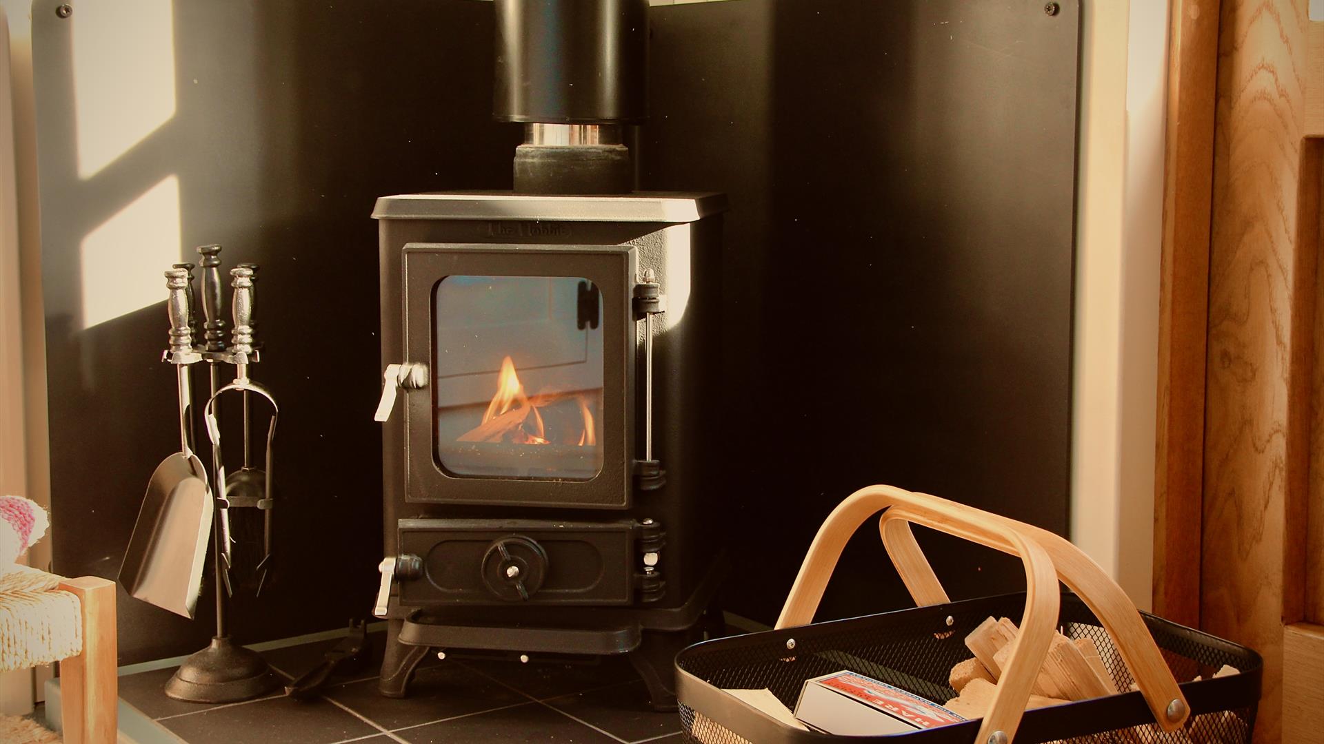 Multiple heating options, including a wood-burning stove, electric heater, and heated towel rail