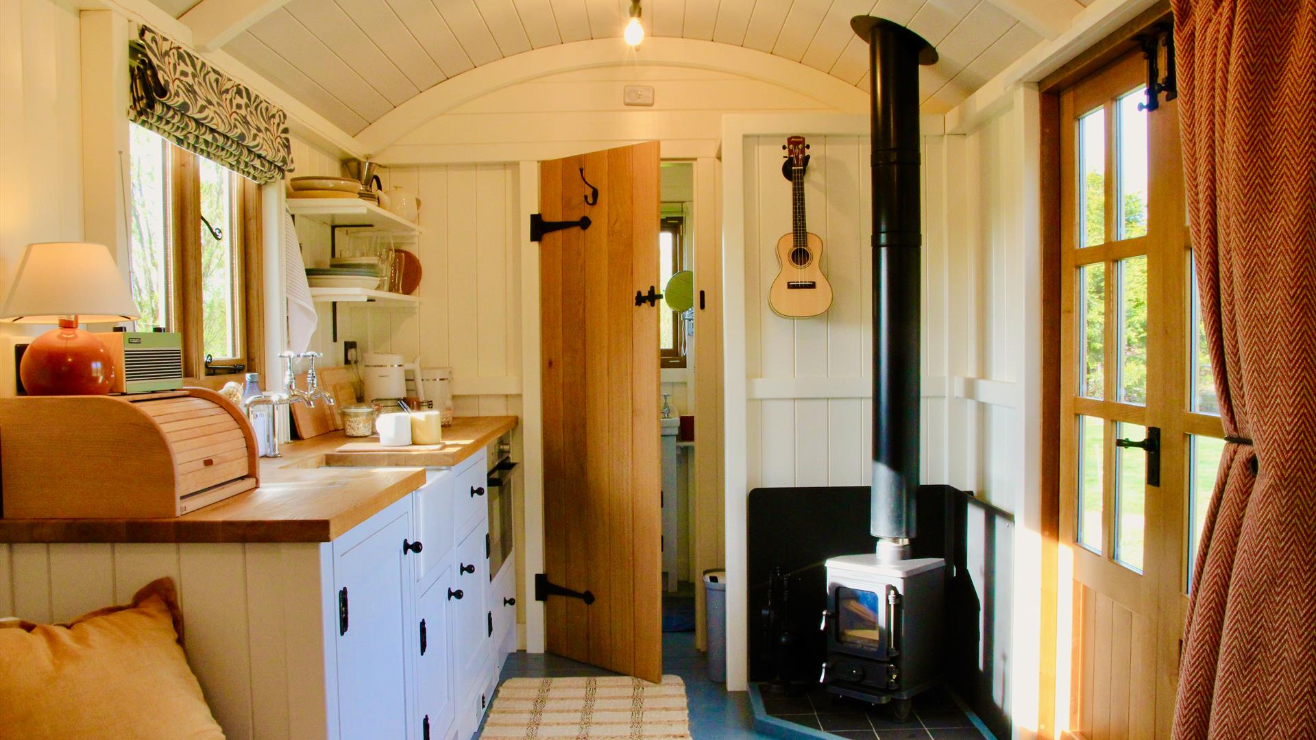 • Shepherd's hut interior with sunlight streaming through the French doors