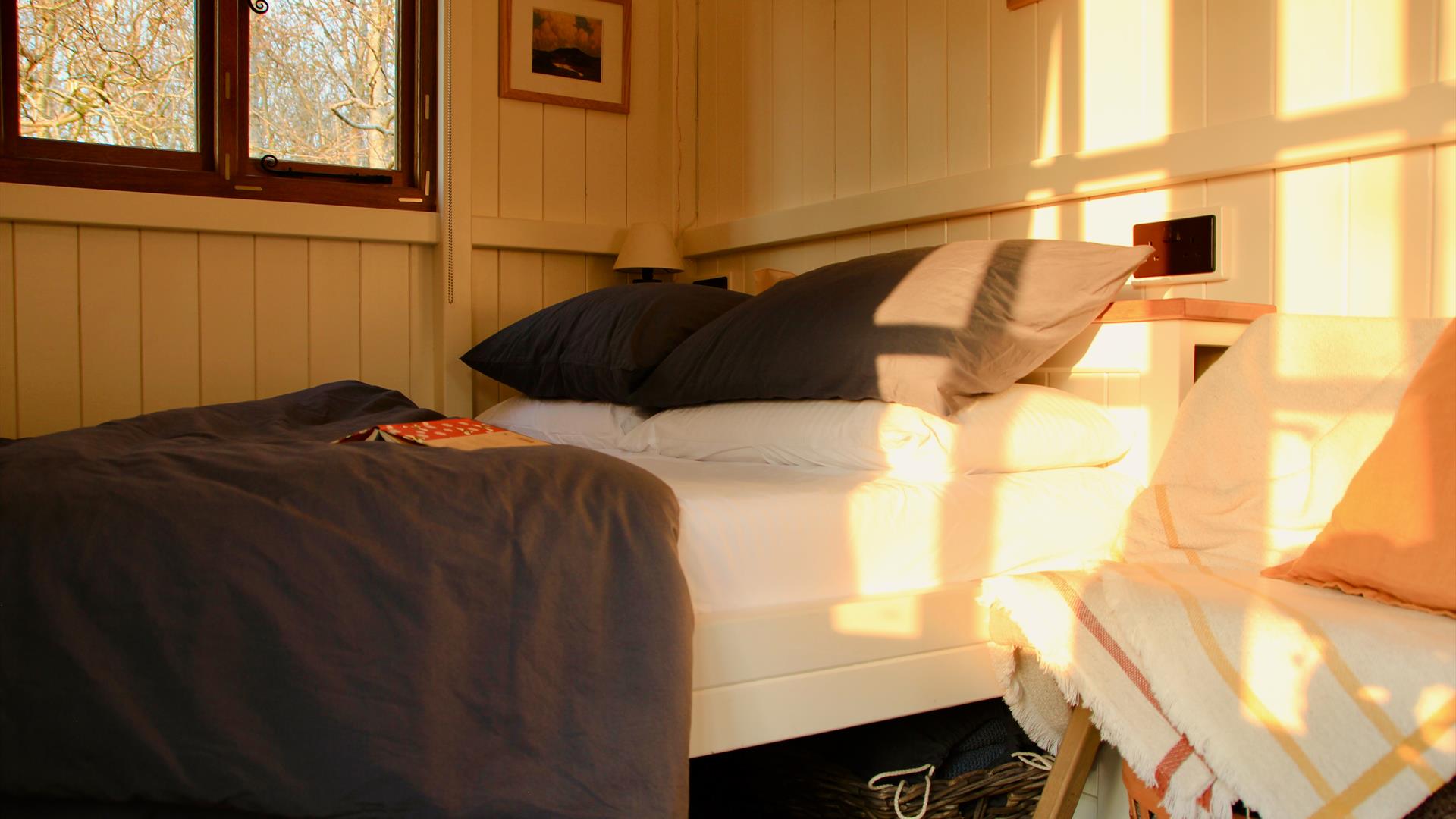 Each shepherd’s hut sits within its own generous, secluded space, accessed by a private boardwalk and opening onto a large deck. Inside, guests will find: