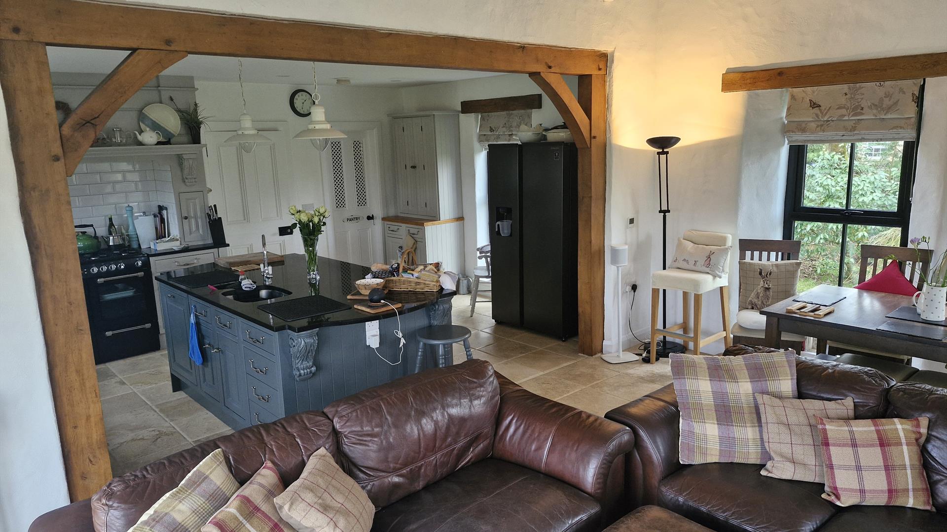 Internally, the property features a large open‑plan living, dining and kitchen area, designed for comfortable shared use. Traditional elements, including exposed wooden beams, are complemented by modern furnishings and a wood‑burning stove, creating a warm and welcoming environment throughout the year.