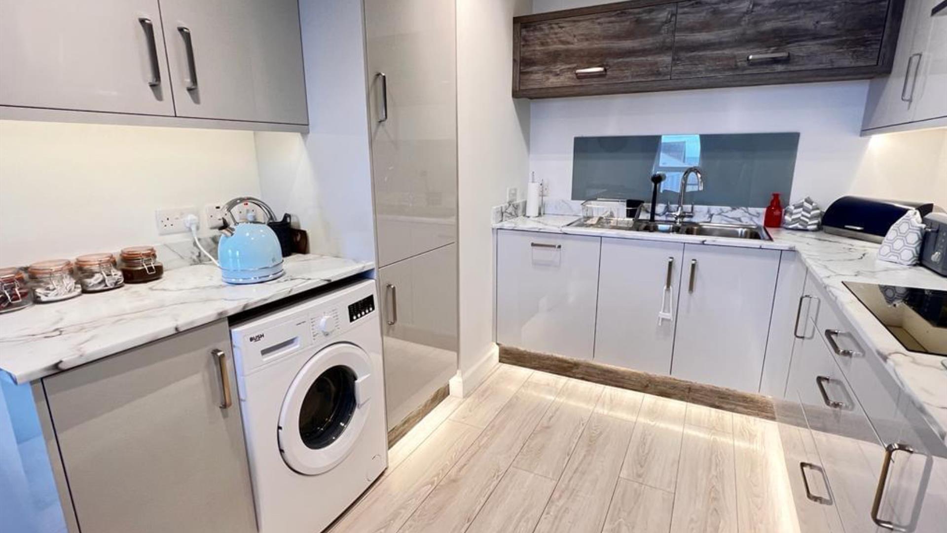 The apartment is an open concept, living room, dining area and kitchen. Great for family get together's. the kitchen has all the amenities of home, including a full size fridge/freezer, cooking hob/oven, microwave, dishwasher, washing machine, toaster and Tassimo.