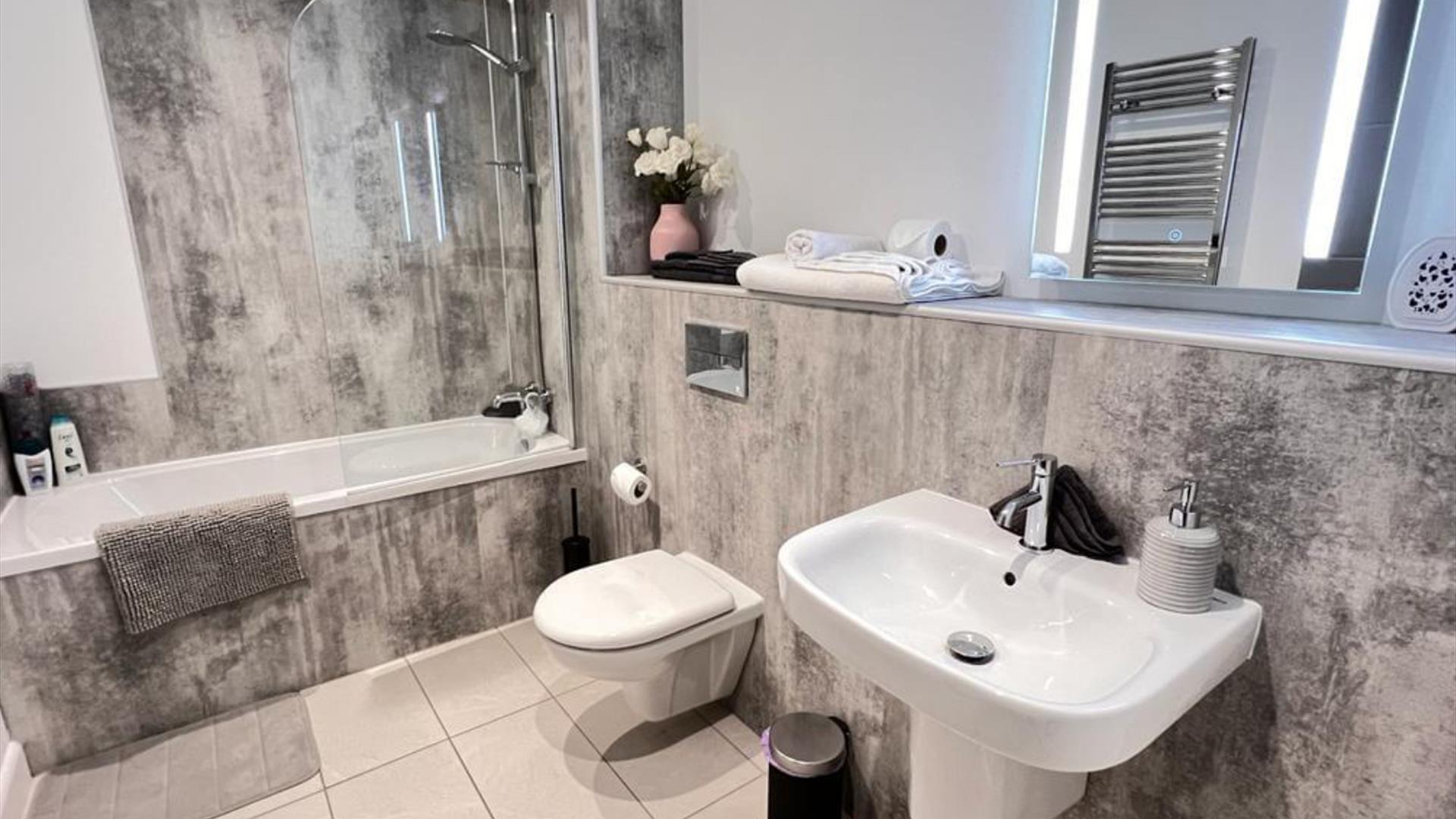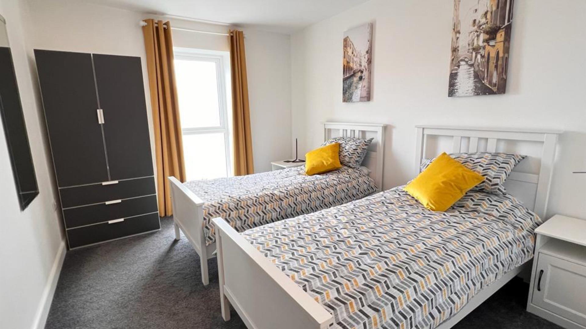 Welcome to our light, spacious and modern, two-bedroom 2nd floor apartment. Accessible by the lift. Our primary bedroom has a double bed and a three piece ensuite. The second bedroom has two single beds and there is a pull out sofa bed that can sleep two in the living room.