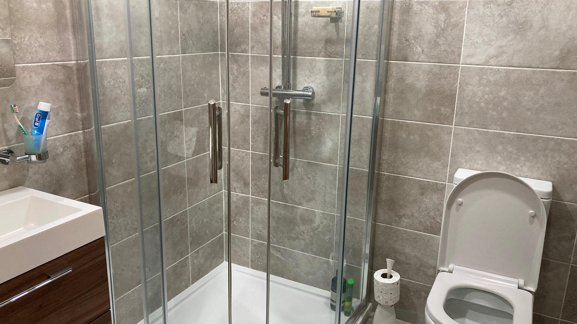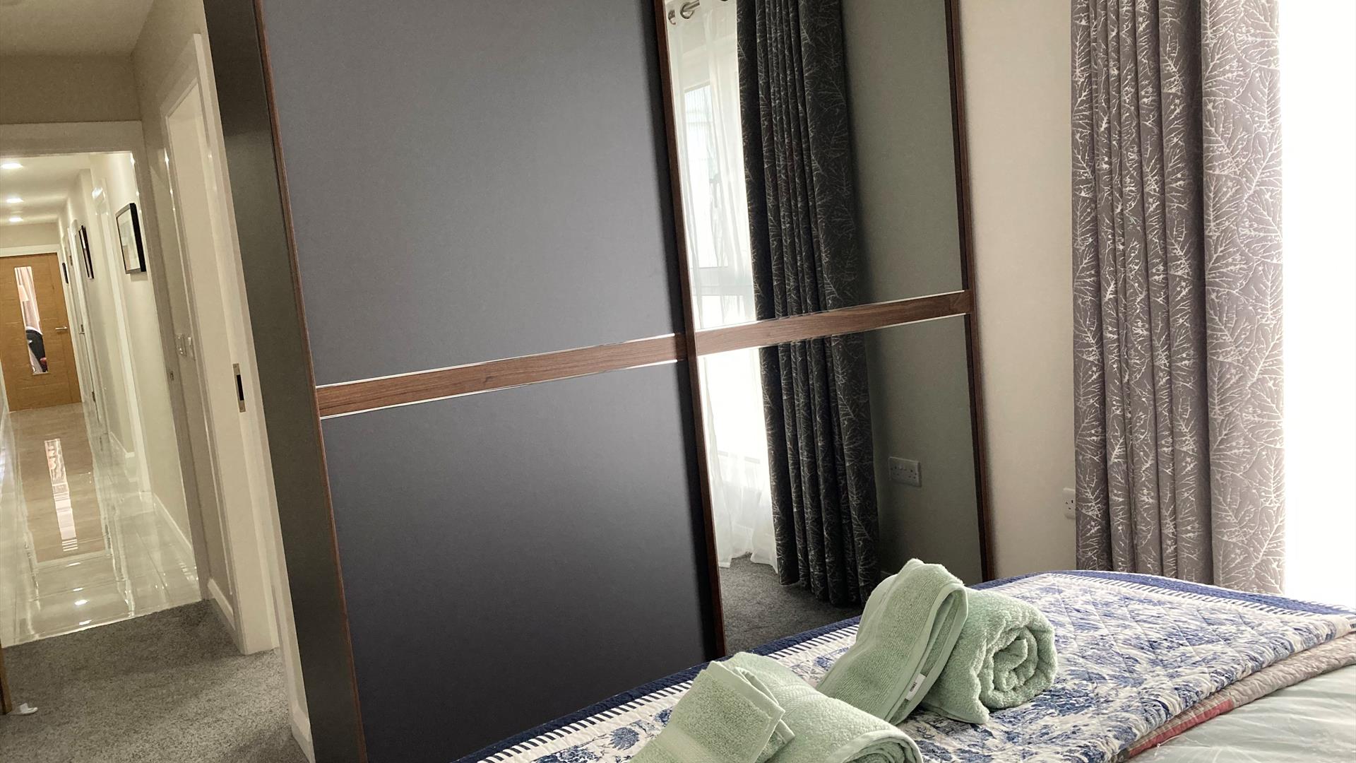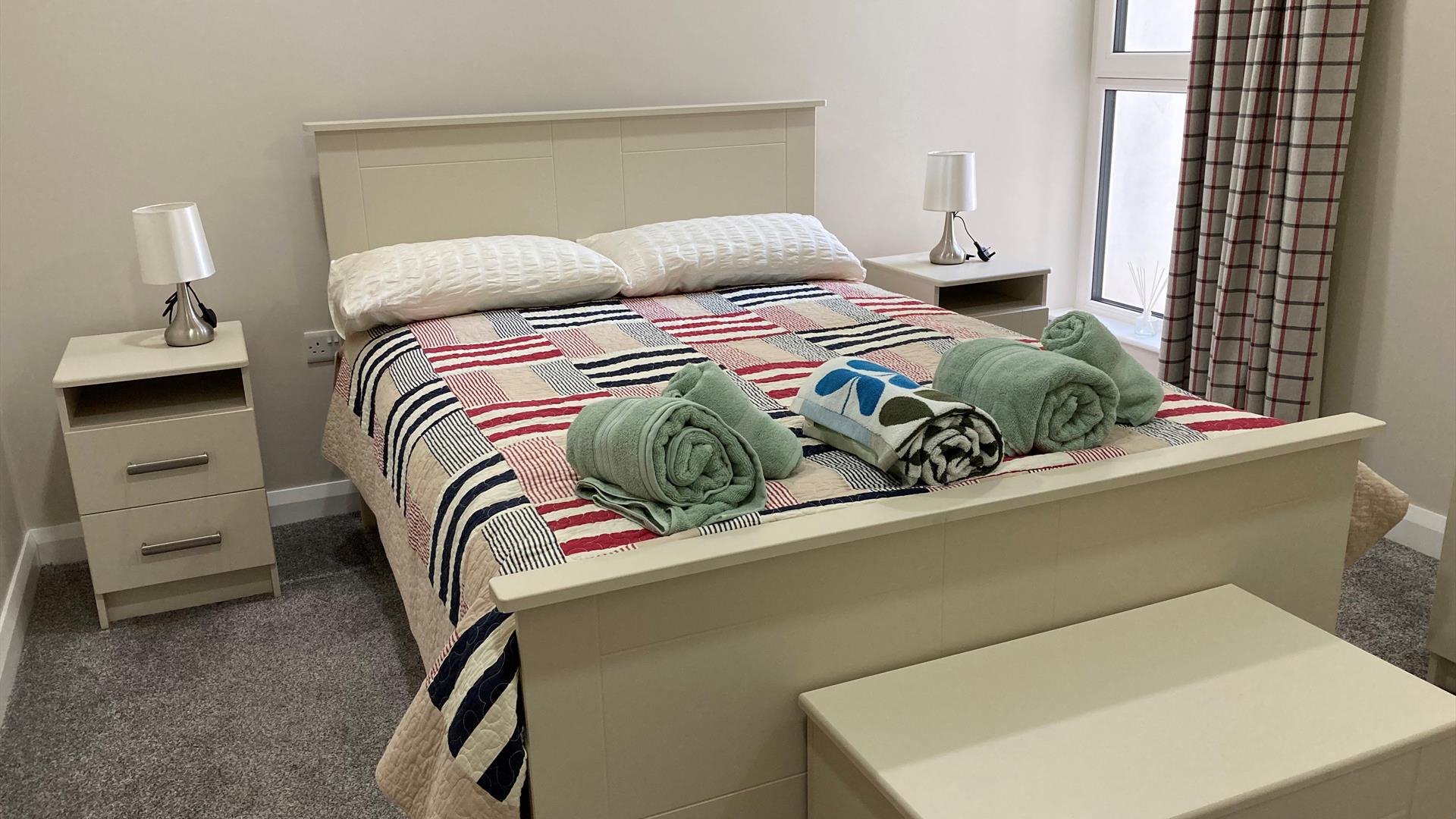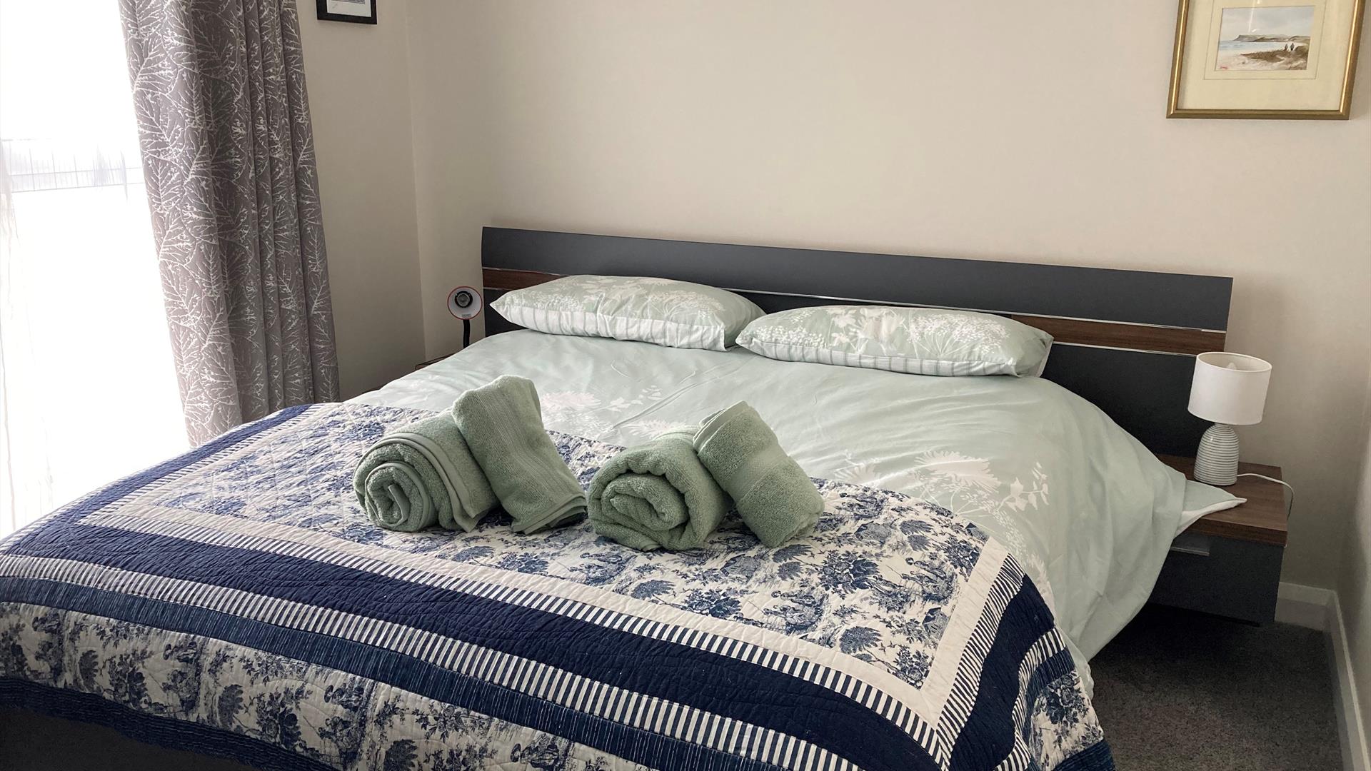 Master bedroom and ensuite: King size bed with bedside lockers, bed side lights and four wall hanging paintings. There is a large double wardrobe with hanging and drawer space. The fully tiled en suite has walk in shower, wash hand basin with storage beneath, illuminated, mirror fronted vanity cabinet, heated towel rails and toilet. Please be careful when getting in or out of the shower / bath as the floor can become slippy. Please use the non-slip mat provided. There is a hair dryer provided. External windows tilt and turn to open.