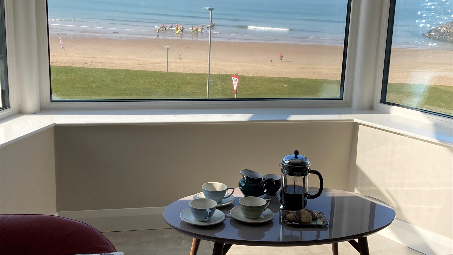 Lounge /Dining/Kitchen: In the lounge area the large front window looks out across Portrush west bay with beautiful views over the Atlantic Ocean towards Portstewart and the Donegal coast in the distance over which the sun sets in the evening. In the immediate forefront you'll overlook the famous Kerr Street Green, the west strand and Portrush harbour. The wall mounted tv comes with Freeview.