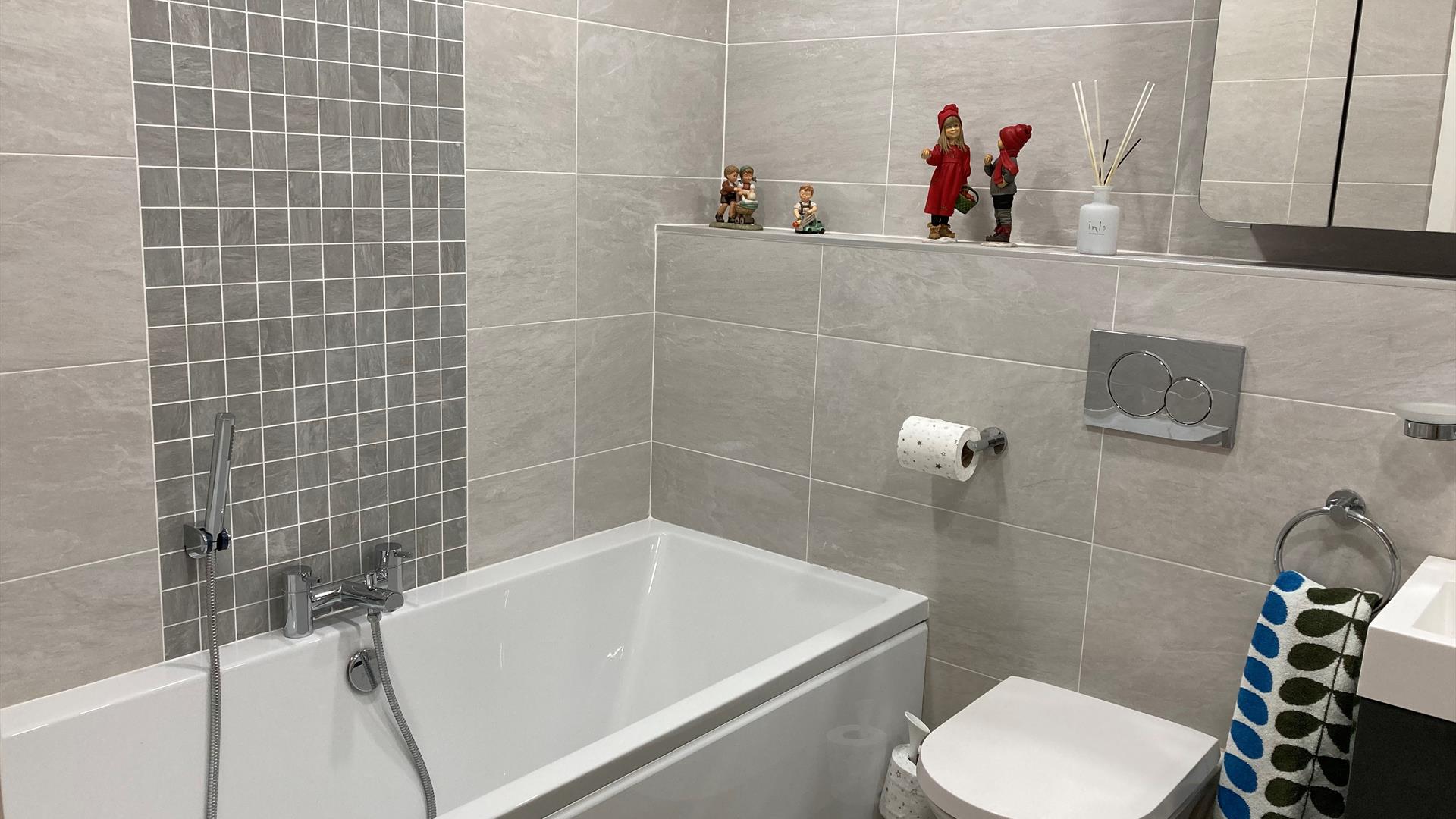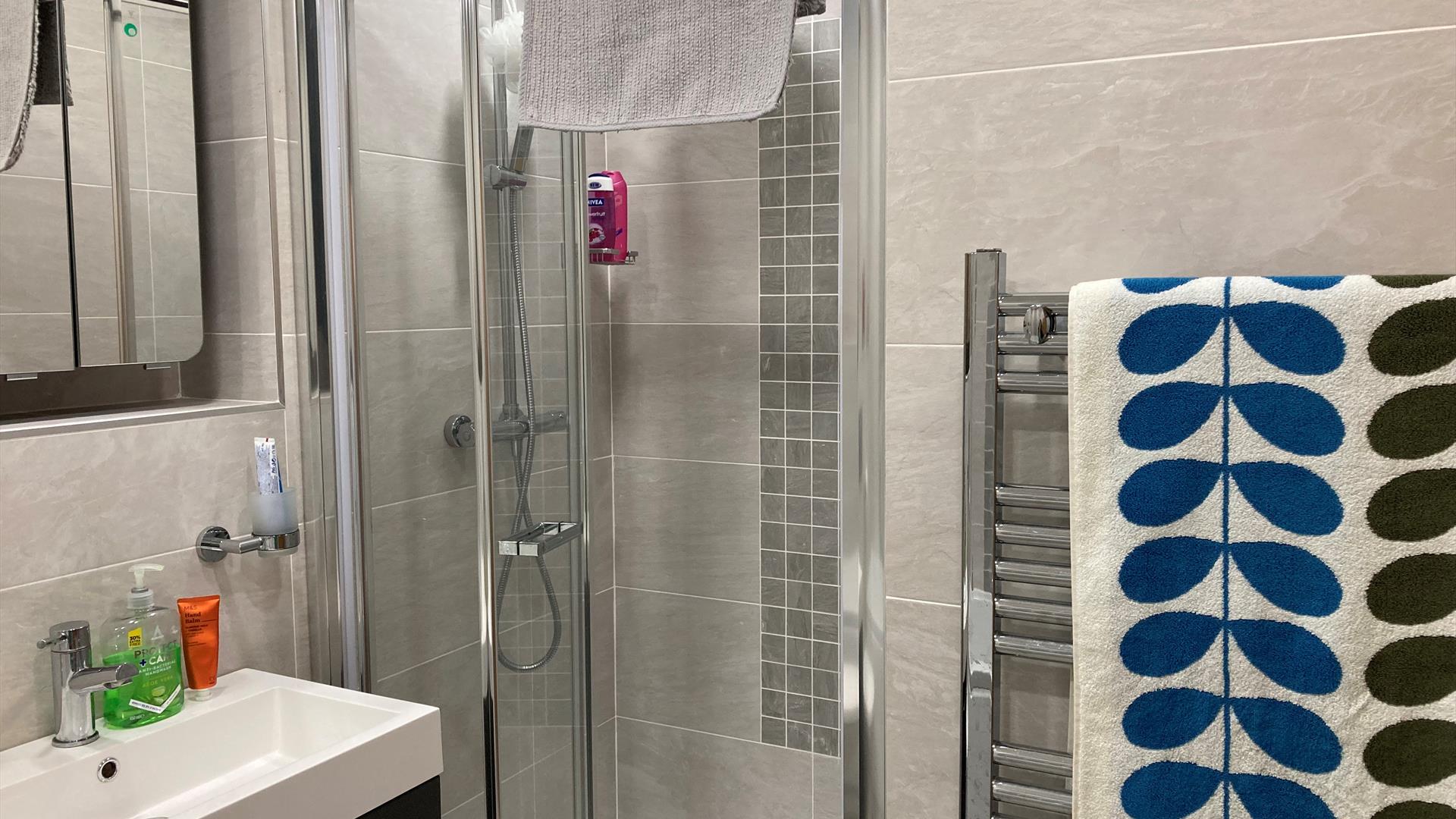 Main bathroom: The bathroom is fully tiled and has a bath with hand held shower attachment, walk in shower, wash hand basin with storage beneath, mirror fronted vanity cabinet, heated towel rails and toilet.