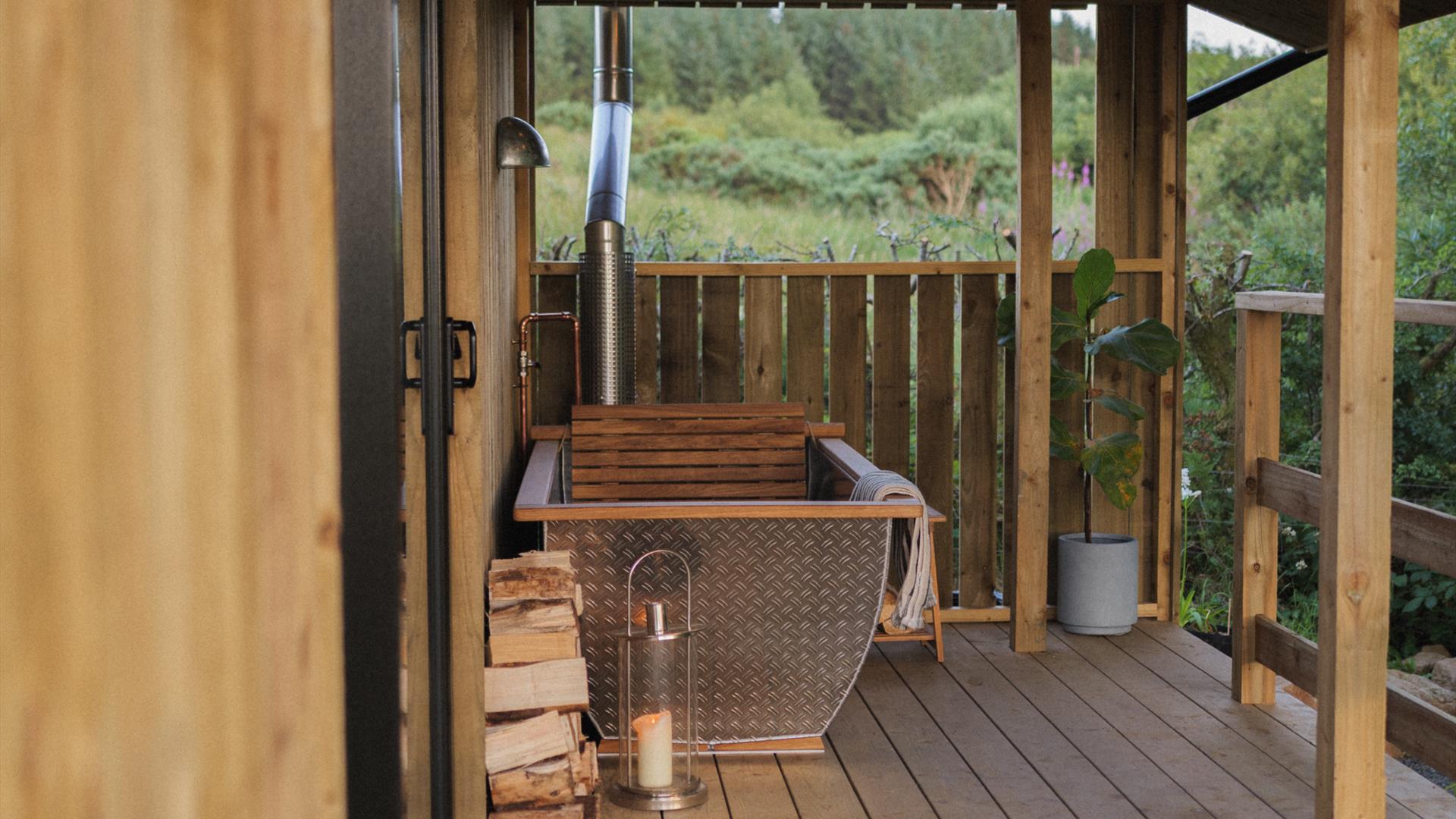 - outside on the private veranda a woodfired outdoor bath and outdoor seating and fire pit