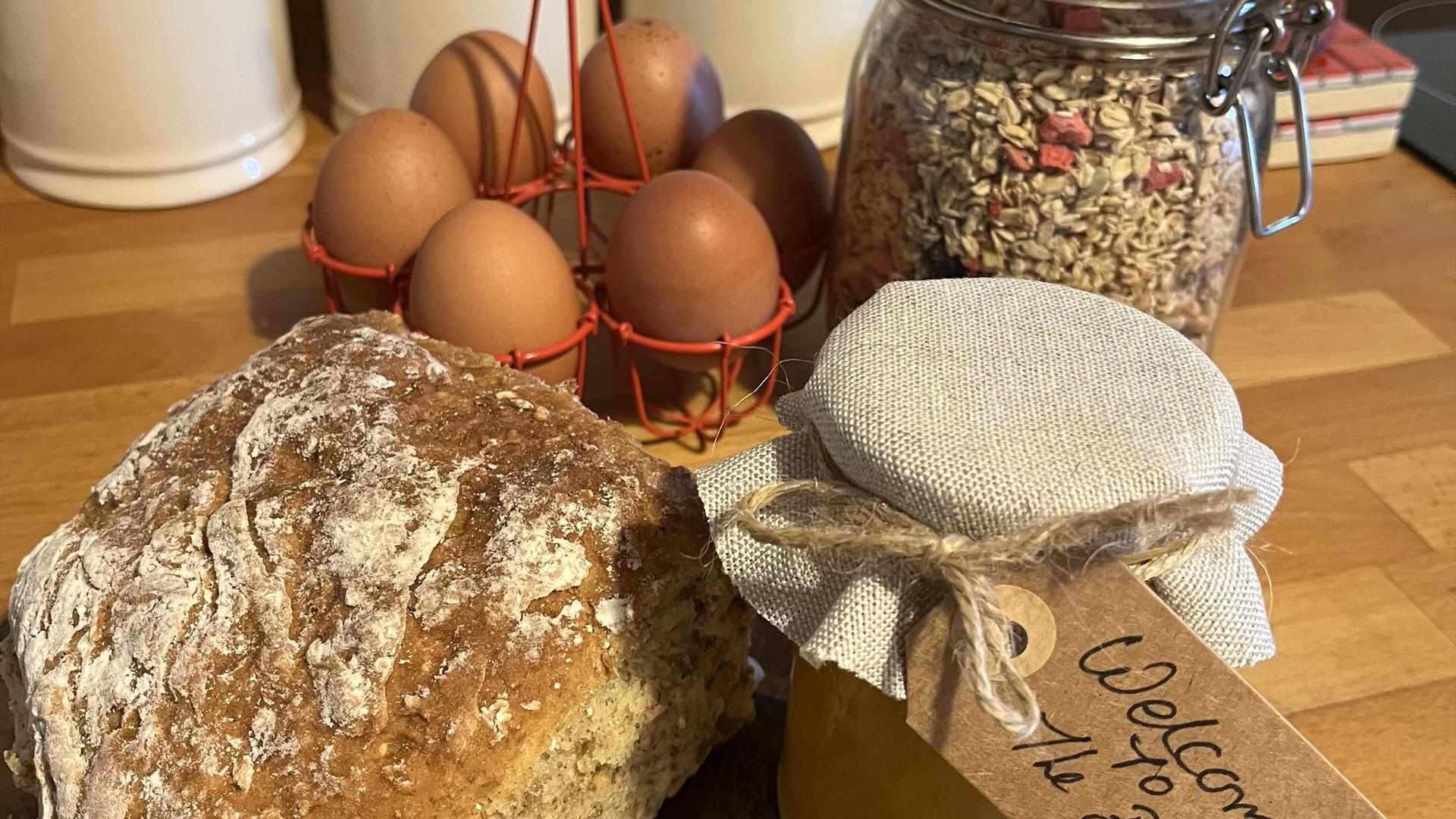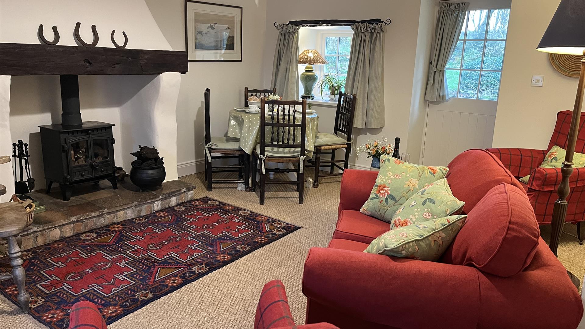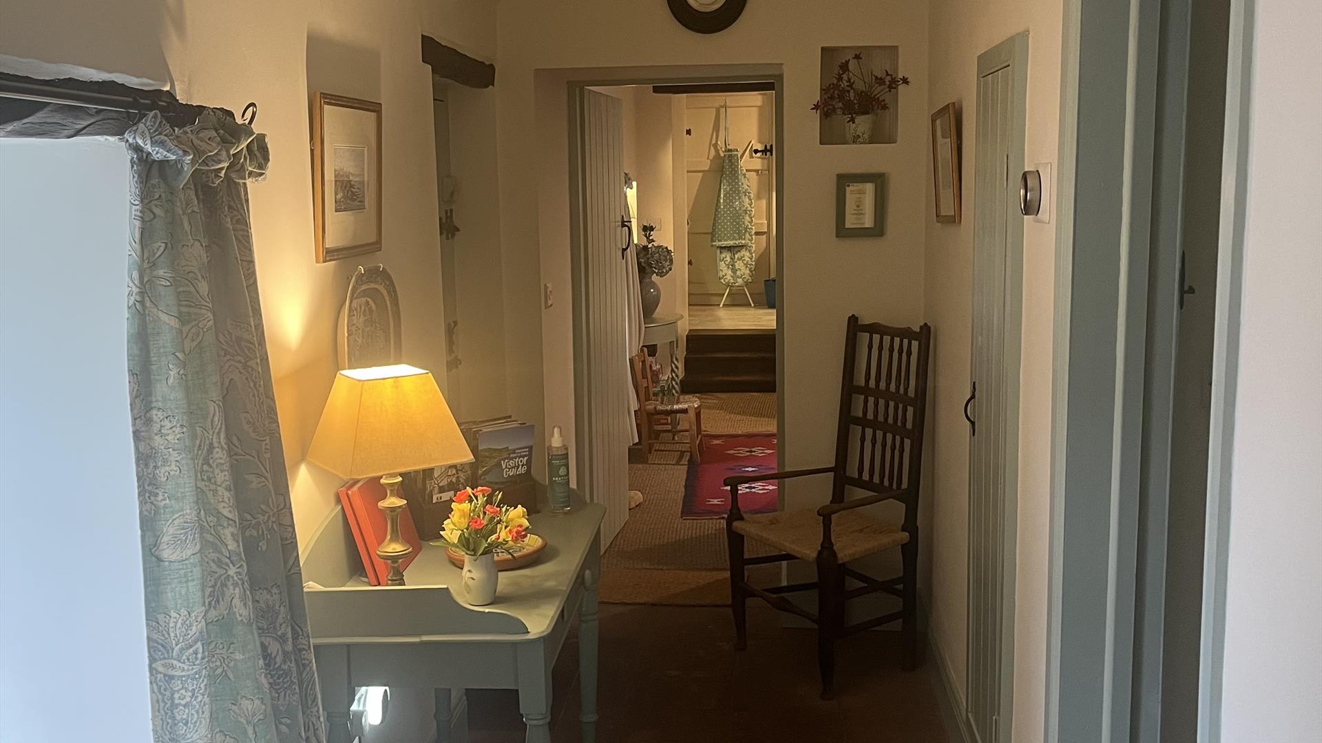 Accommodation is all on the ground floor. There are two bedrooms, one with a double bed and one with twin beds. A bathroom with loo, bath and a sensational thermostatically controlled deluge shower. A living and dining room, a long hall and fitted kitchen with pleasing design, colour schemes and all facilities. Oil central heating with woodburner in lounge. Electric oven & hob, microwave, fridge/freezer, washing machine/dryer, dishwasher, WiFi, TV, DVD, radio/CD, library of books, games & DVDs, cot & highchair, hairdryer, fresh flowers and welcome pack of locally produced bread, preserves, fresh eggs, milk and butter.