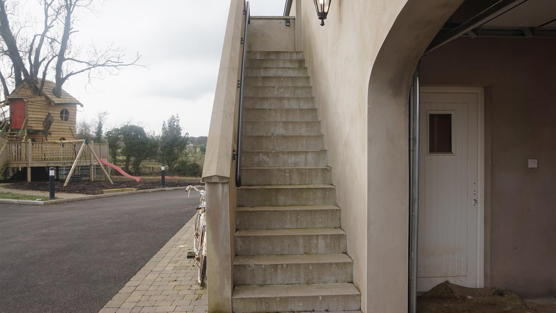 Upper apartment has steps leading up to the front door with a small balcony looking out over the tree house and green fields.