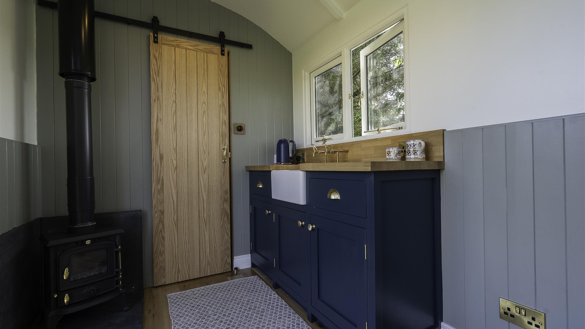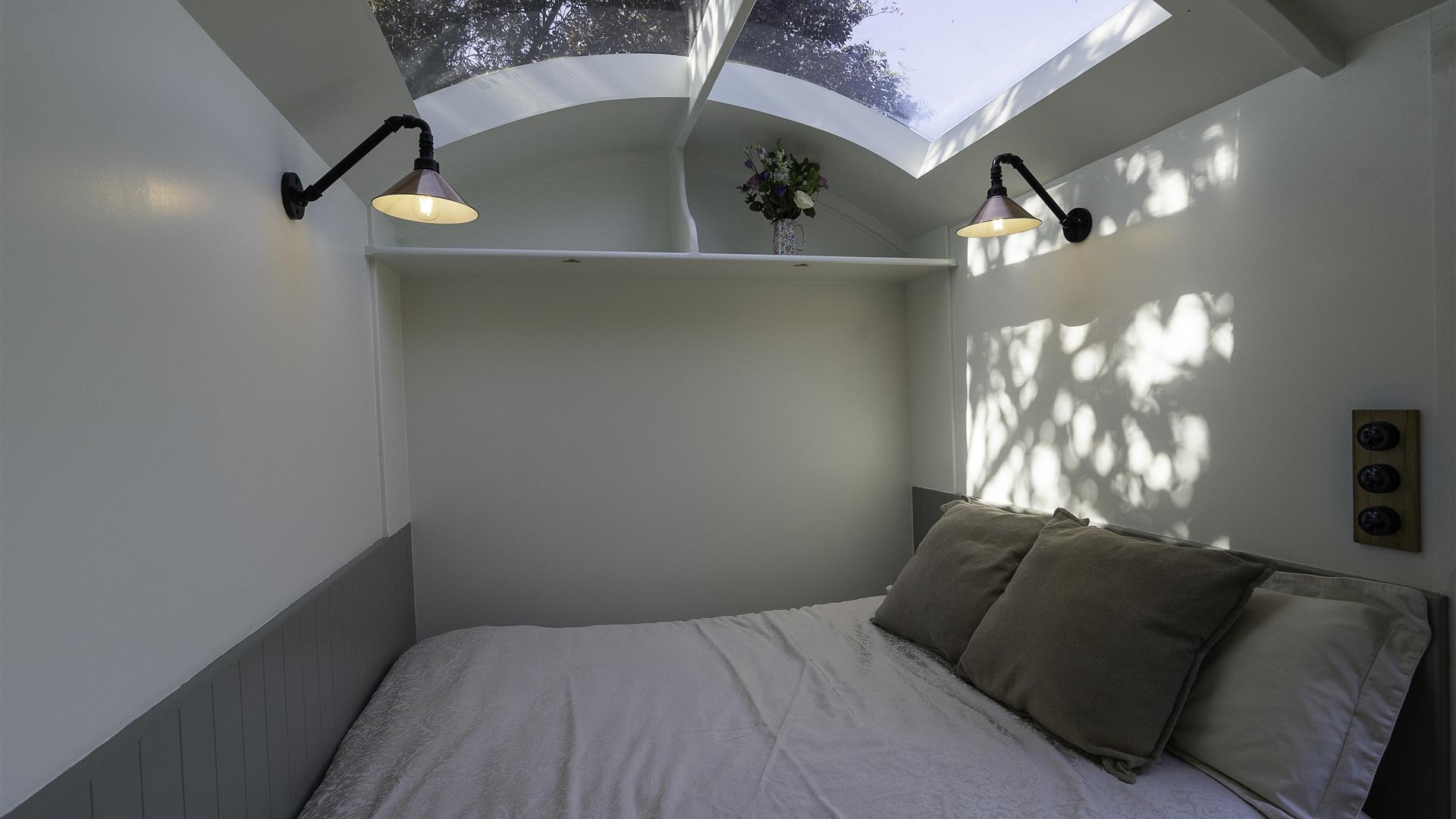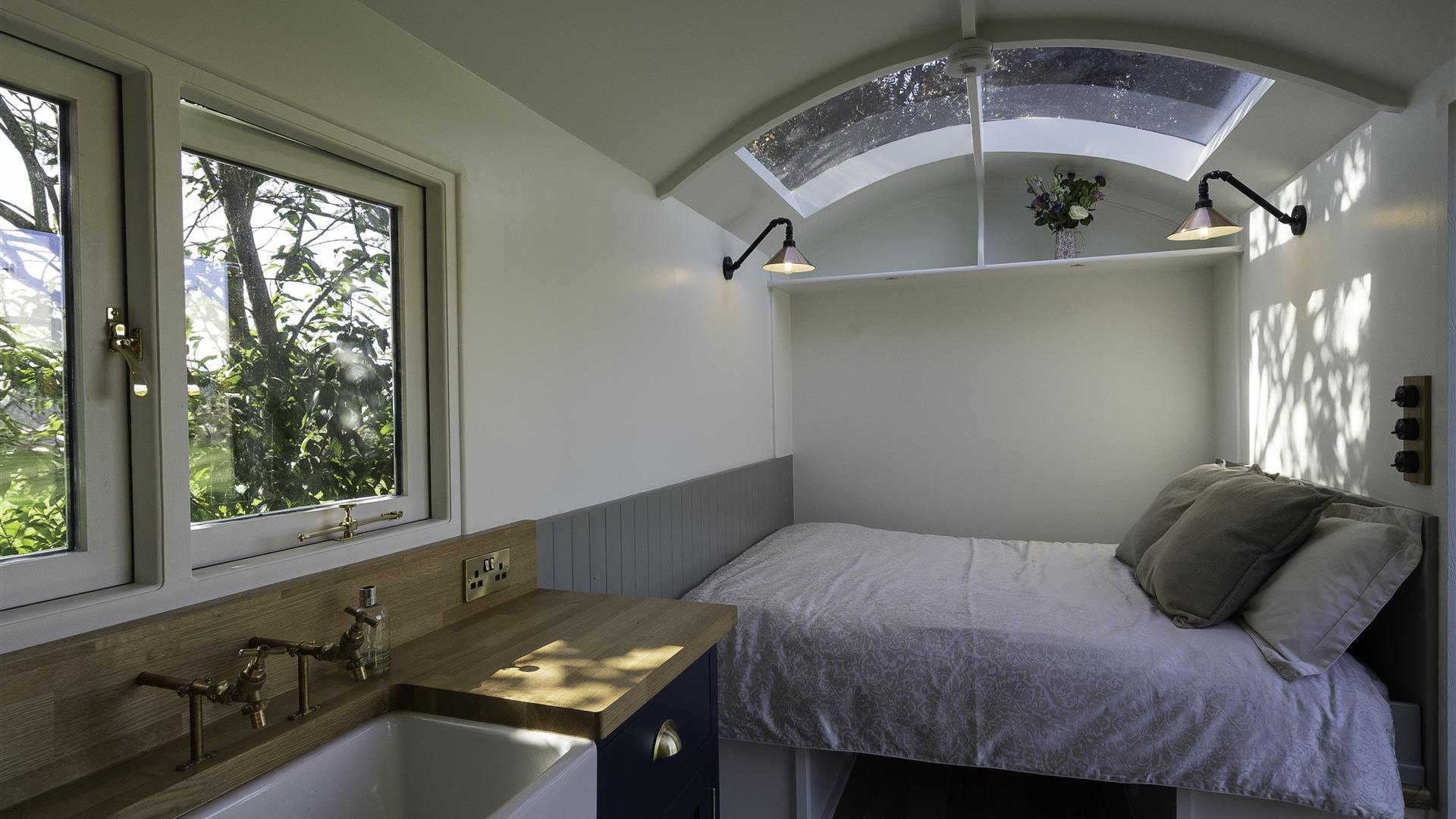 This retreat has more than meets the eye as it is fully equipped with a shower and facilities. Within the living space is a handcrafted kitchen fitted with heritage styling details, along with a stove and dinning area made from stunning spalted beech. This then transforms easily into a double bed within seconds where you can comfortably relax and stare through the curved skylight above, perfect for a starry night! Next morning enjoy something from our included breakfast basket.
