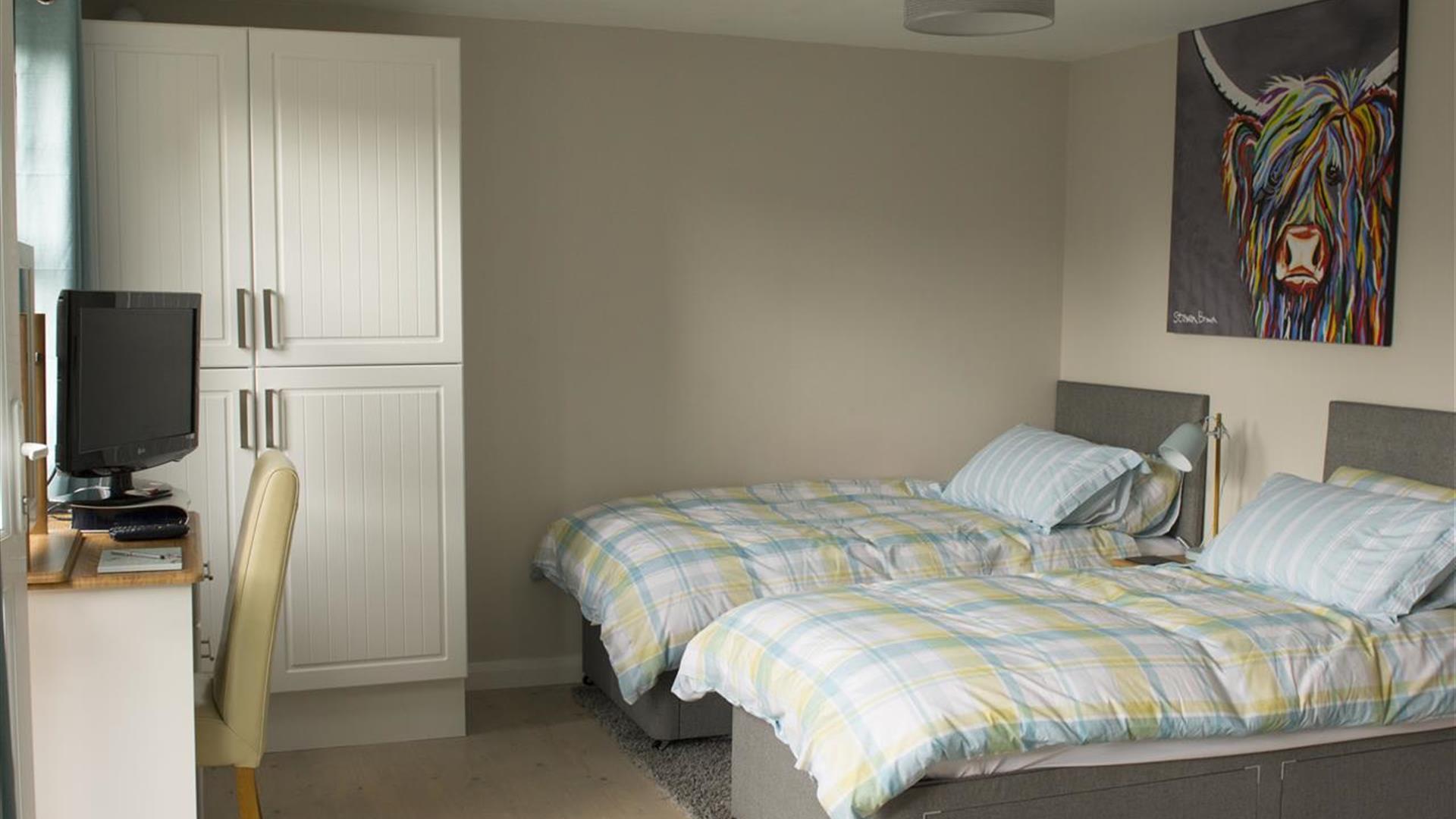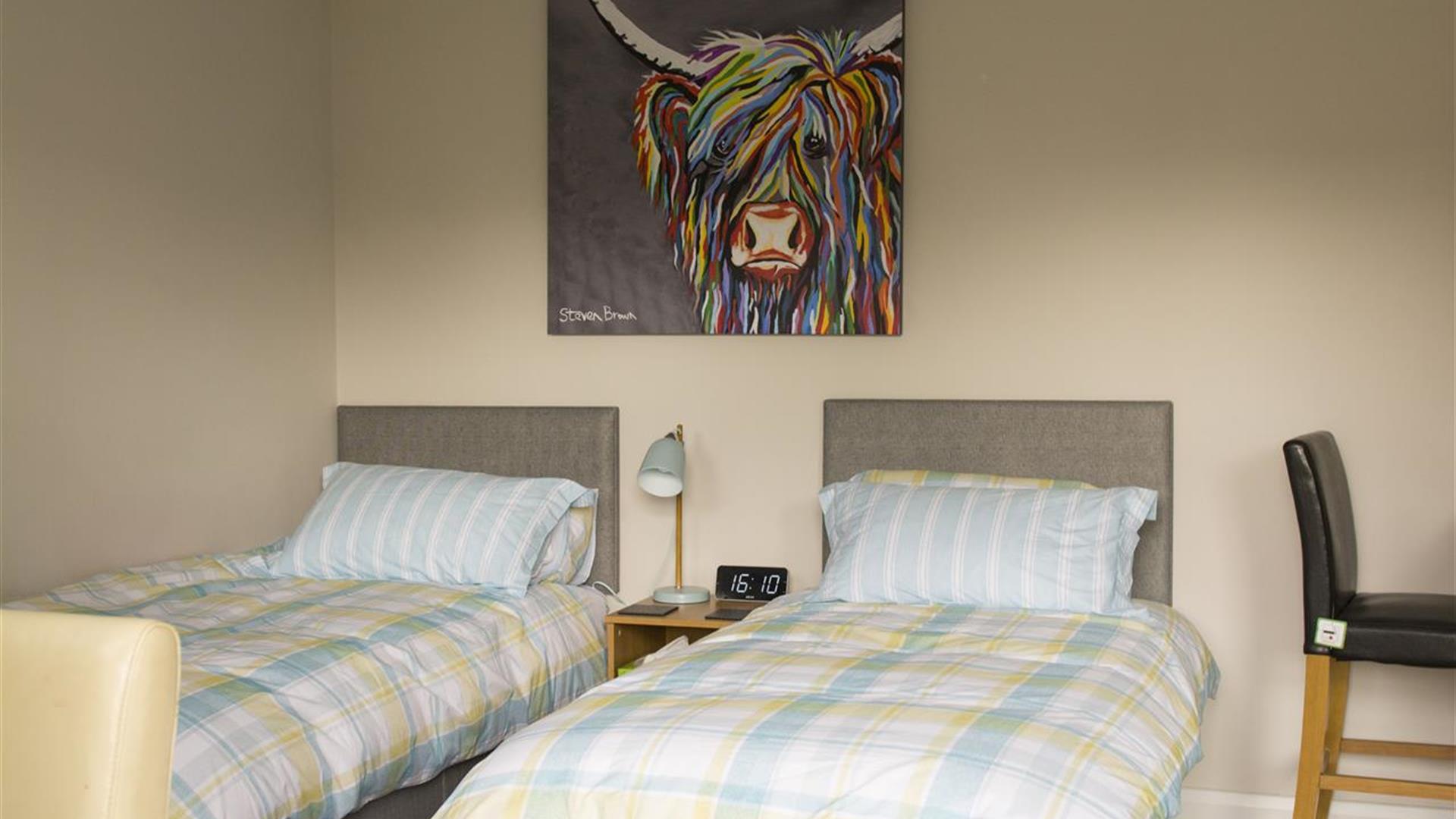 The sleeping area has 2 single beds with a bedside lamp and alarm clock.