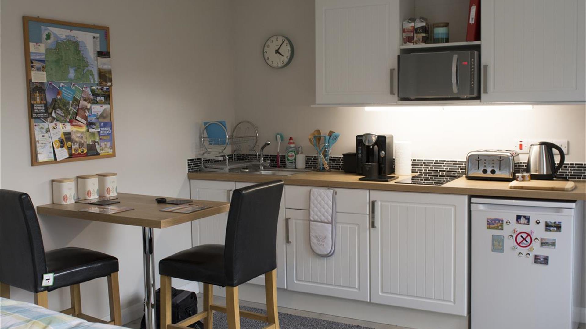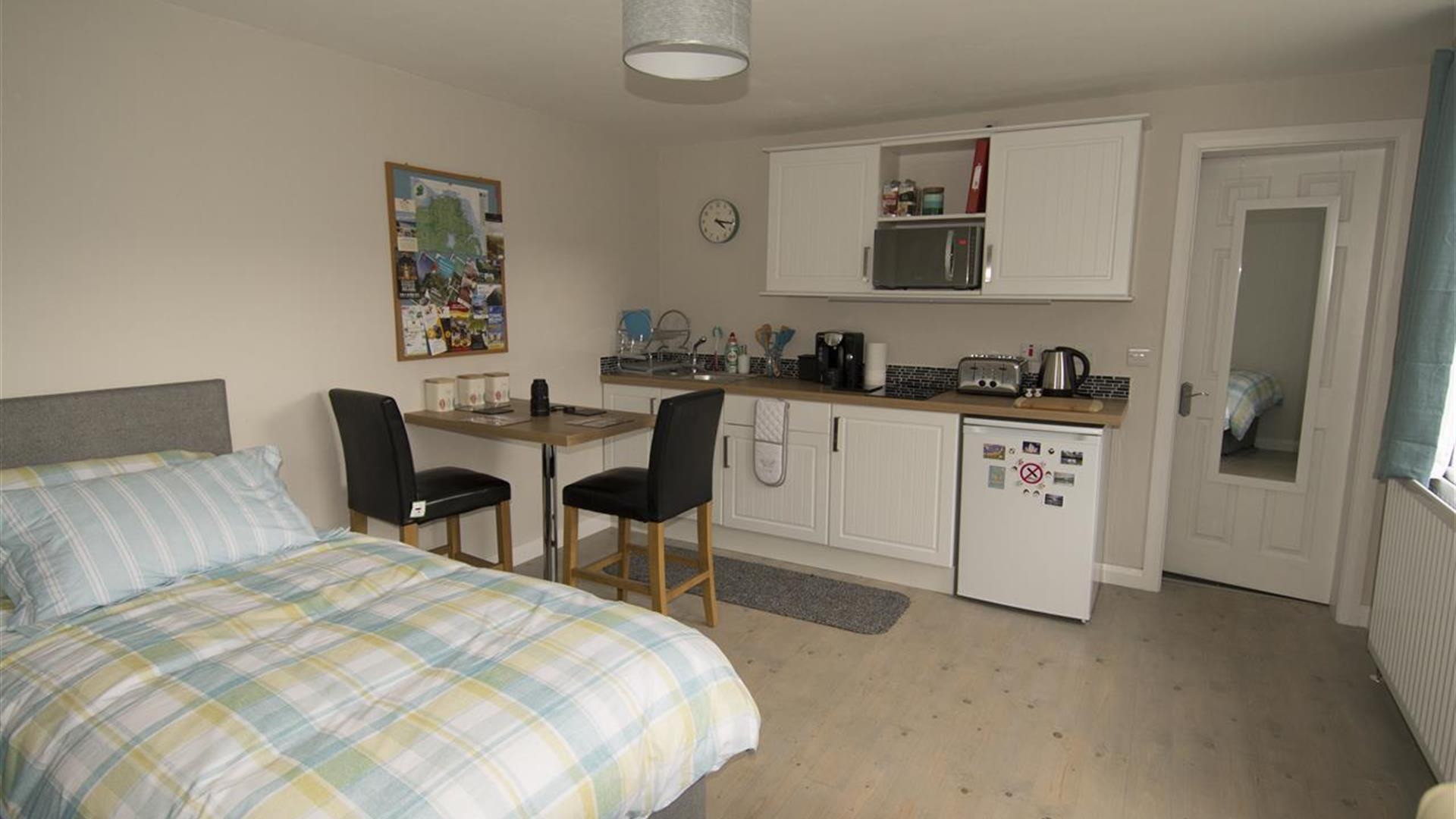 The Studio Apartment is a new self contained modern, airy and well equipped separate annex beside our exisitng home in the picturesque village of Castlerock.The kitchenette contains a 2 ring cooker hob, toaster, kettle, fridge and coffee machine and is equipped with all necessary utensils etc. The private bathroom has a shower, wash hand basin, toilet and vanity unit.