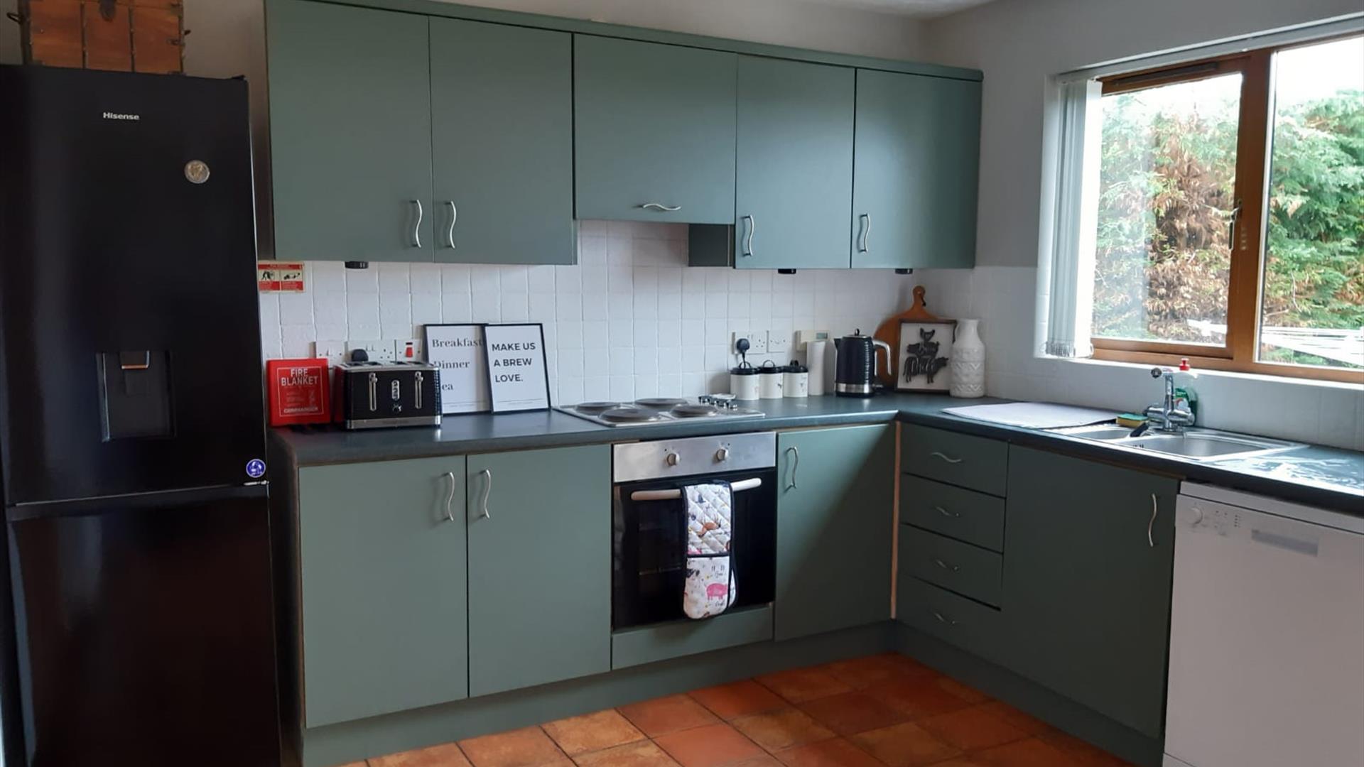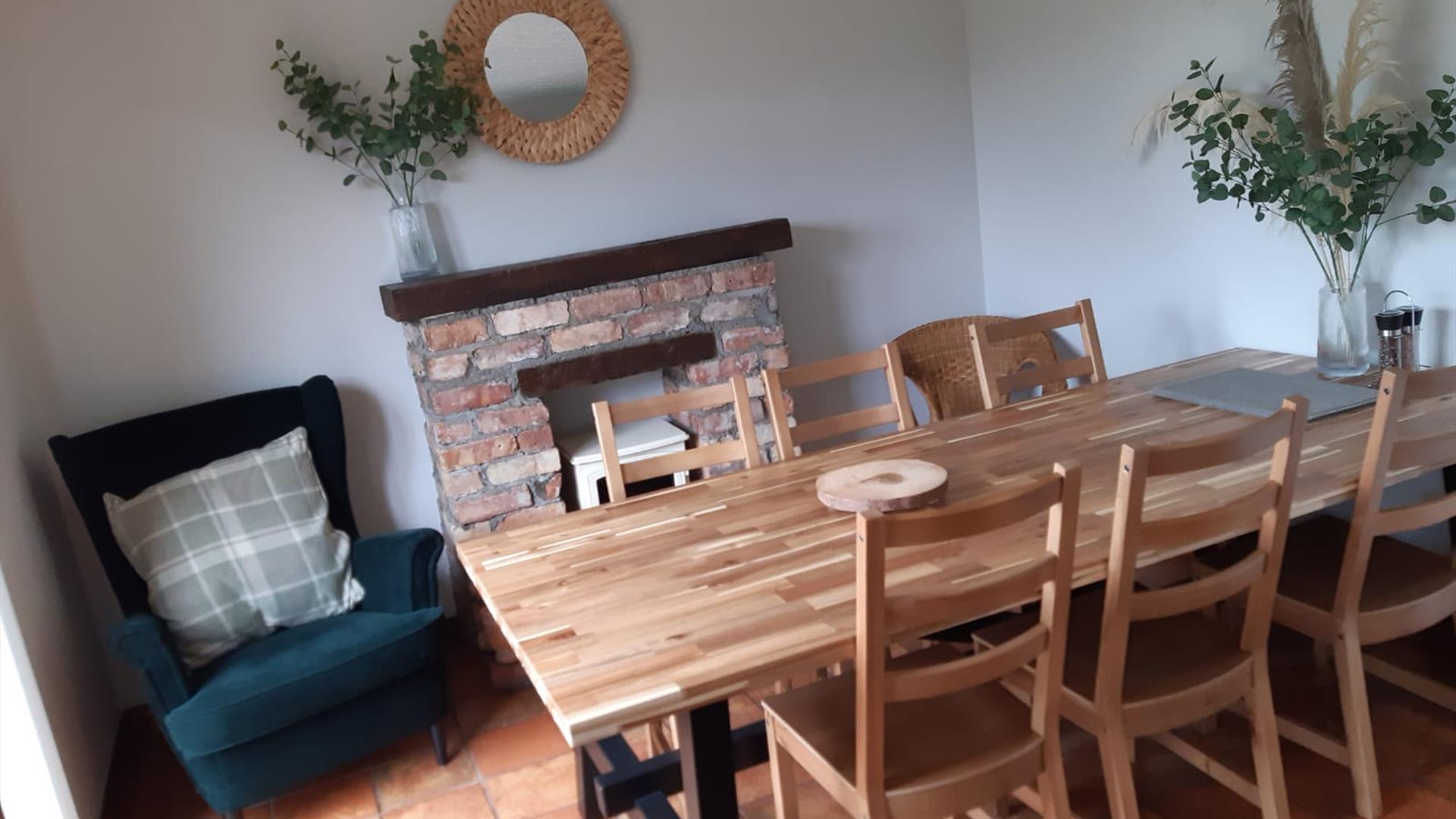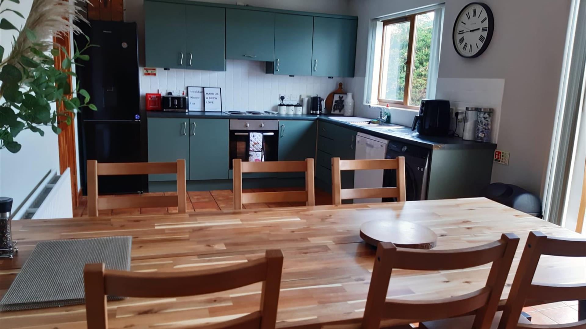 Kitchen - Airy, appliance-stocked kitchen space with garden views. Beautiful dinner table. Lounge/reading area in the kitchen for relaxing coffee mornings.
