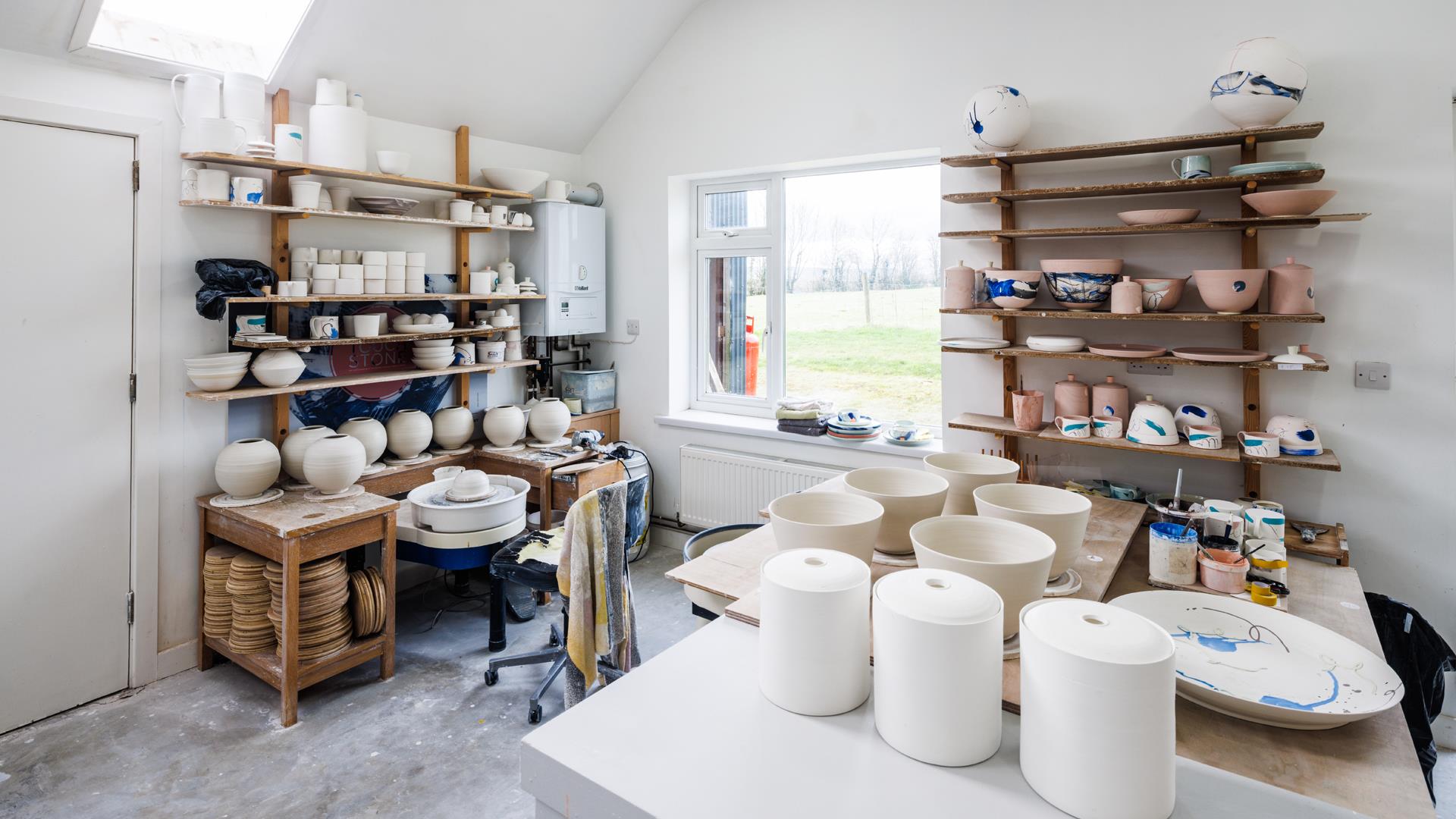 Potter Adam Frew works and teaches from a former barn that has been transformed into a purpose-built studio, creating works in porcelain, including thrown functional and large one-off pots.