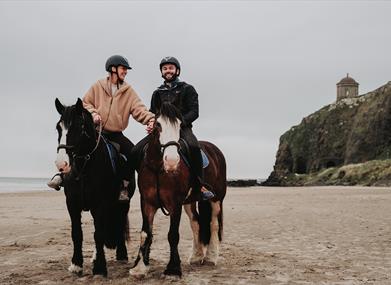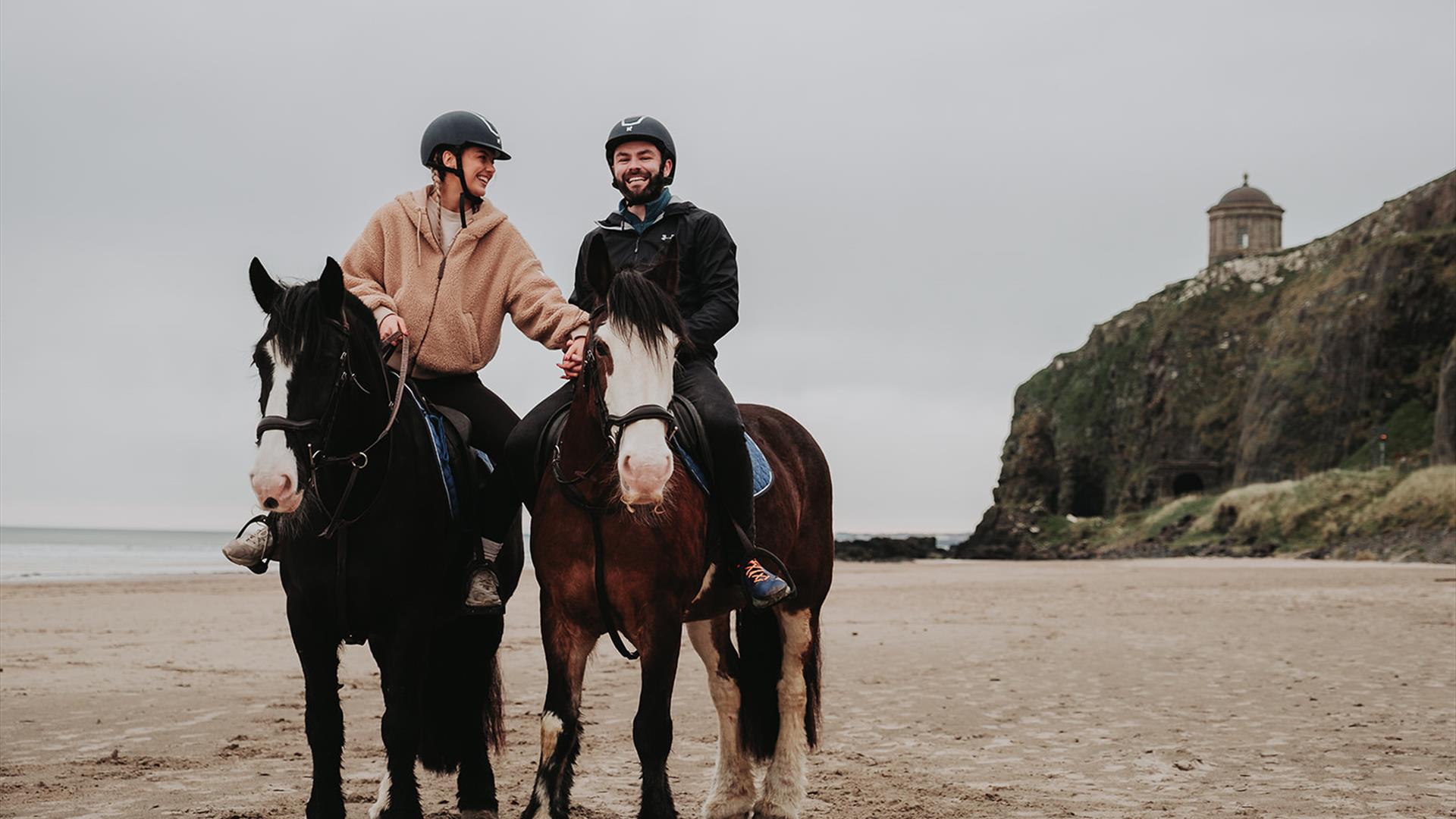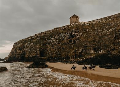 'Hoofprints & Footprints' - Start with a 'Get to know your horse' session for first-time riders or those revisiting horse riding. Ride along Benone beach towards Downhill, passing the magnificent Mussenden Temple. Explore sandy shores, water's edge, sand dunes, and ancient rock formations. Conclude with a dining experience, 'Mussenden Unwind, Fire and Feast', offering breathtaking views.