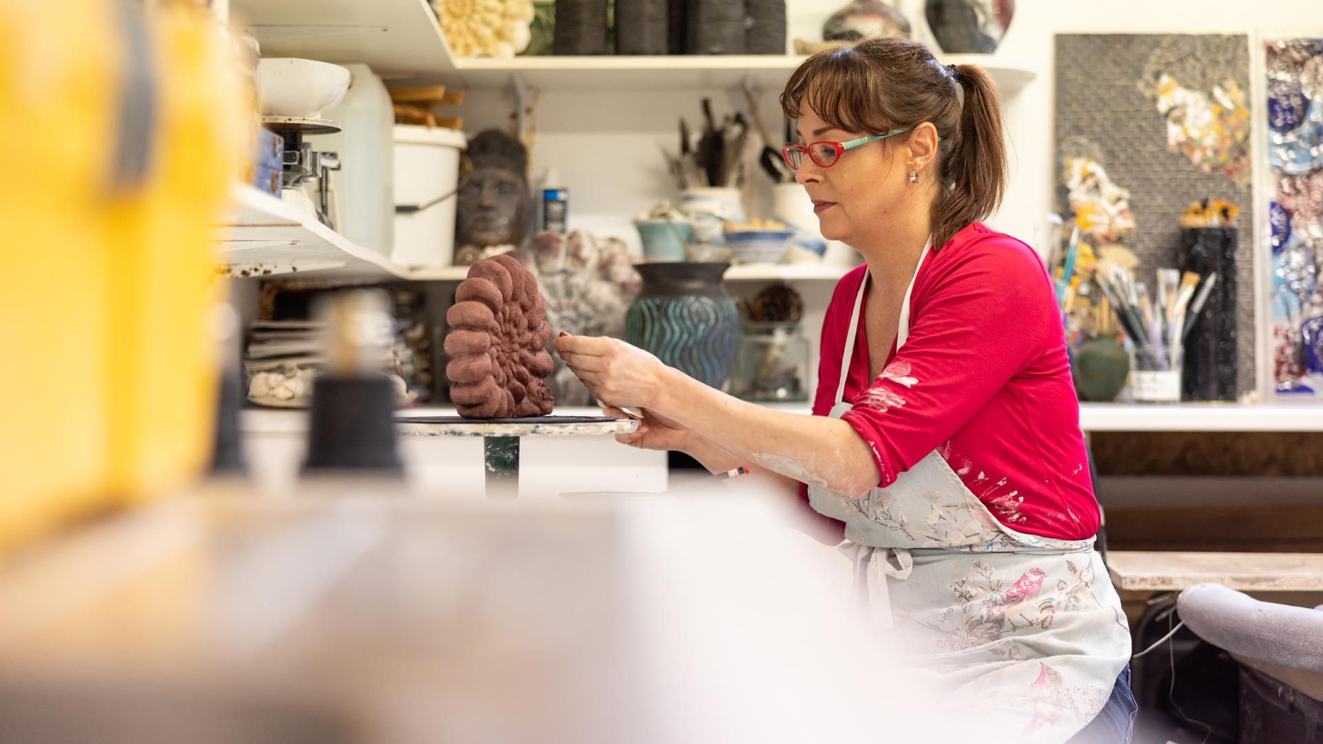 Working from Elements Studio in Downhill, McCall Gilfillan is well known as an art and craft tutor in everything from ceramics to kiln fire glass and mosaics and has worked with a wide variety of sculpture projects and installations for charities and community groups. She particularly enjoys working with mental health groups.