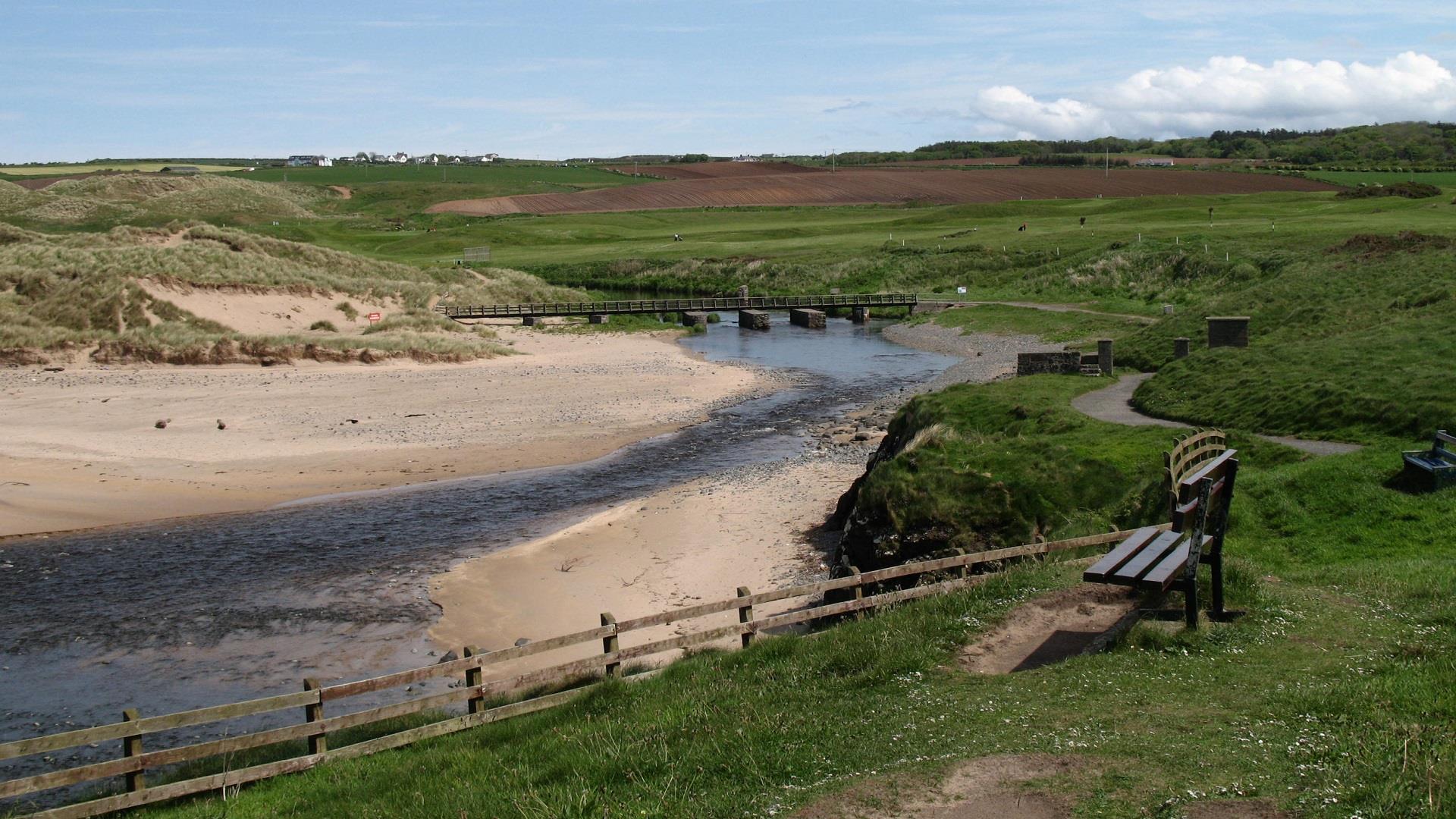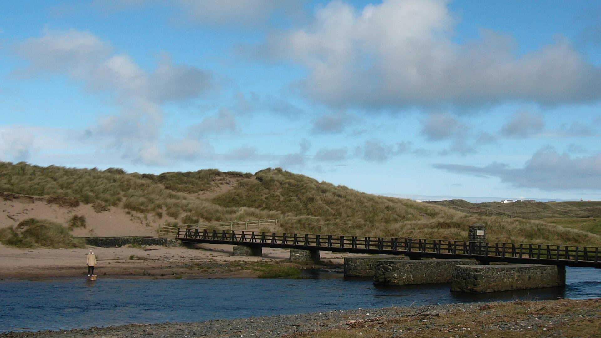 Proceed along the path towards the River Bush. Take care crossing the golf course - observe the warning signage and give way to golfers. Having crossed the Bush, after about 100m turn left onto a boardwalk and proceed seawards keeping the river to your left. Follow the boardwalk along the edge of the river and follow the path towards the wooden footbridge, known locally as the Threequarter Footbridge. Having crossed the bridge follow the path for approx. 100m and then turn left along the signed public footpath. Follow this path to the golf club car park and proceed to the starting point in the adjacent Council car park.