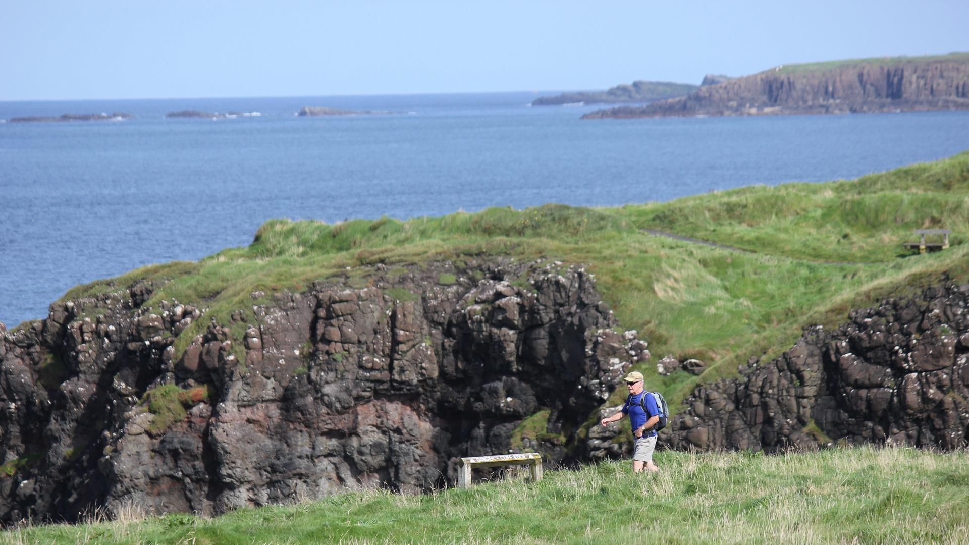 Proceed onto the surfaced cliff path and follow this coastal path into the centre of Portstewart. Having passed the harbour, ascend the steps on the left to Harbour Hill viewpoint. From this vantage point, follow the waymarked route towards Portrush, hugging the coastline. Extra care should be taken when passing Portstewart and Ballyreagh golf courses.